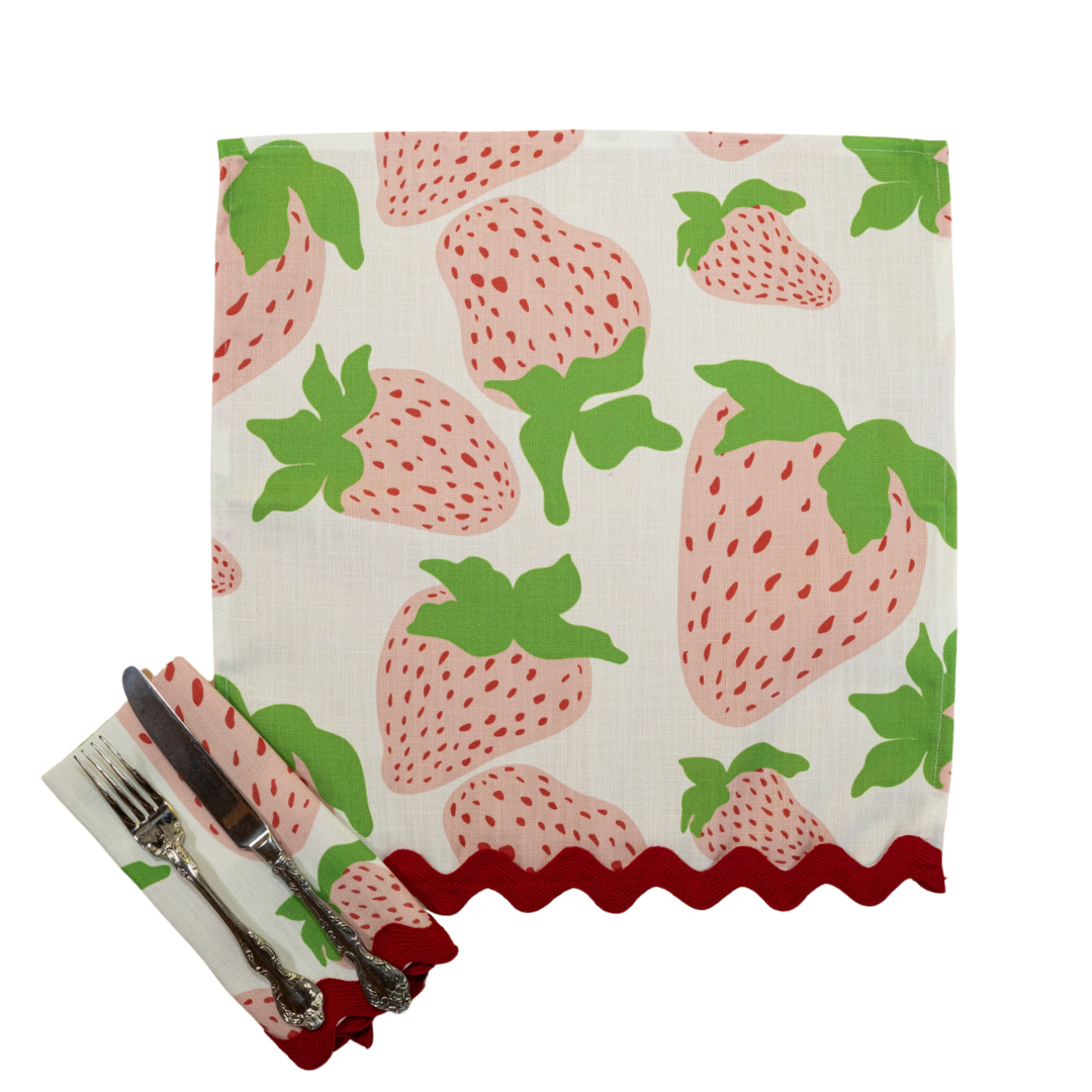 Team Madcap has crafted a range of glorious no-iron cloth dinner napkins--all based upon Madcap's original watercolor paintings and sketches. Here, our happy-go-lucky Garden Party Strawberry cloth dinner napkins with red ric rac trim, will add a whimsical focal point to any table. Printed upon a linen-like poly. Easy. Breezy. Perfection. A Madcap Cottage exclusive.