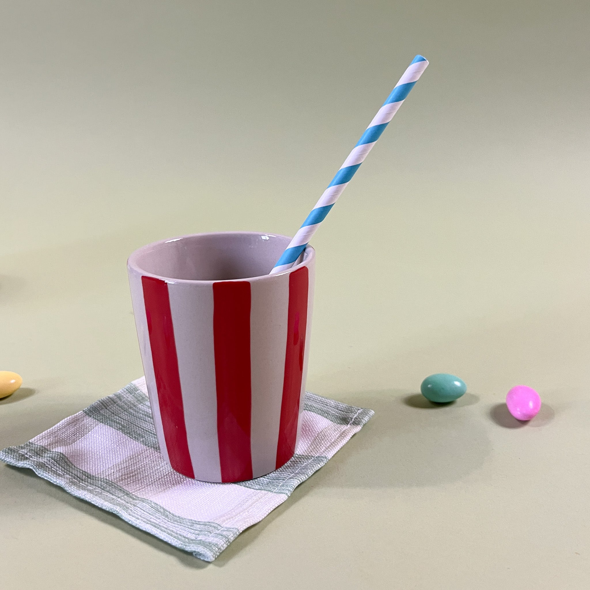 Beautifully hand-painted, Red striped ceramic cups that are perfect to use as drinking glasses or for holding pencils or your toothbrush. A wonderful gift for a host or hostess. Sold individually, or as a set of four, one of each color.