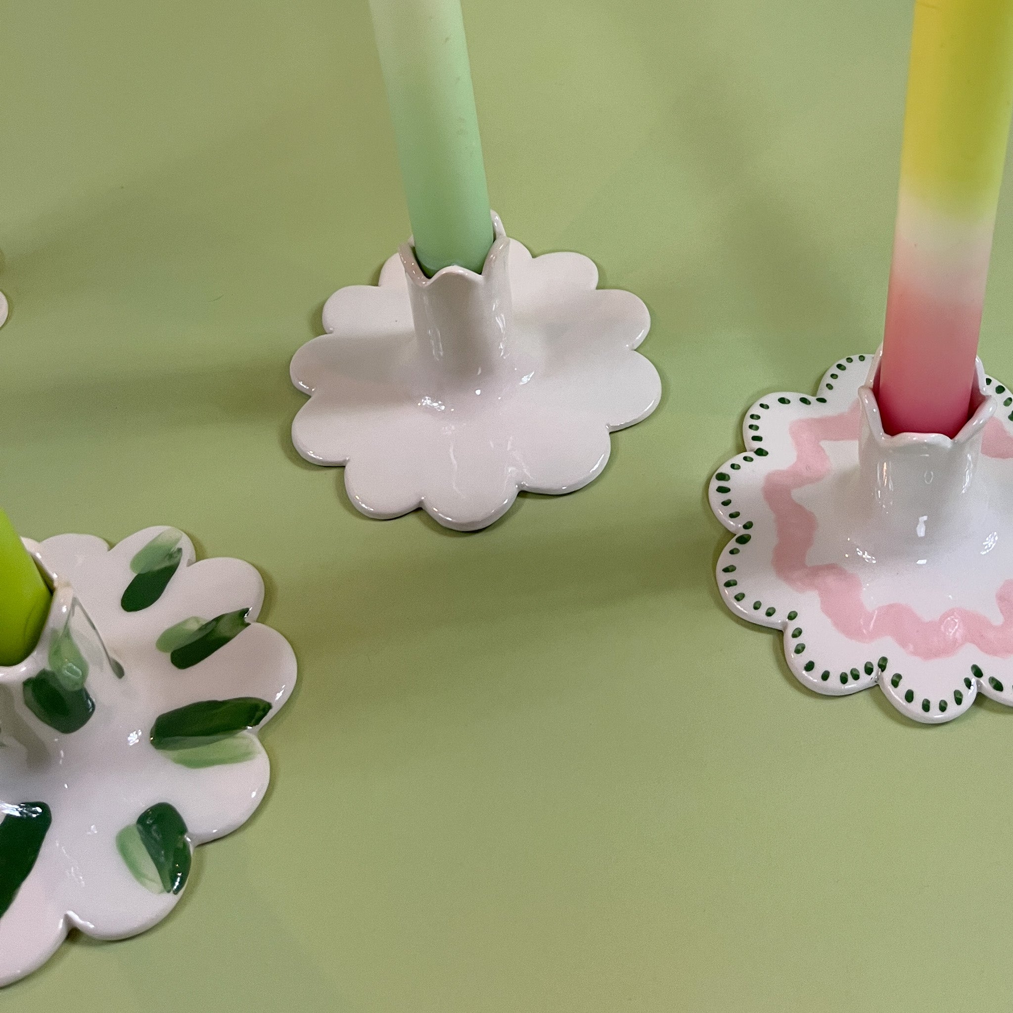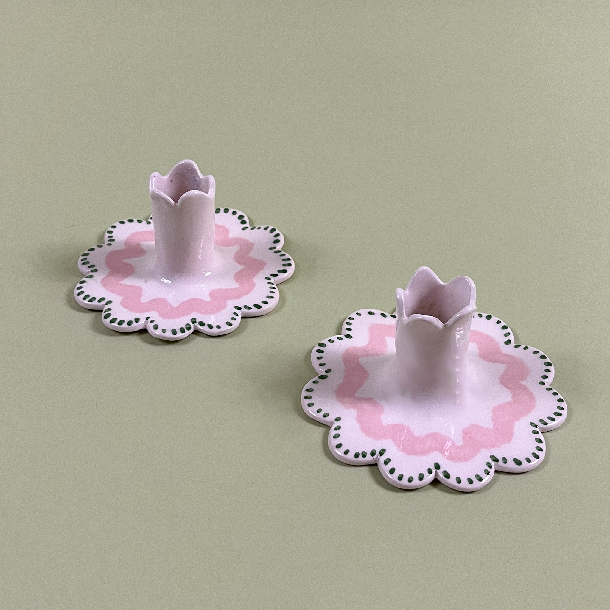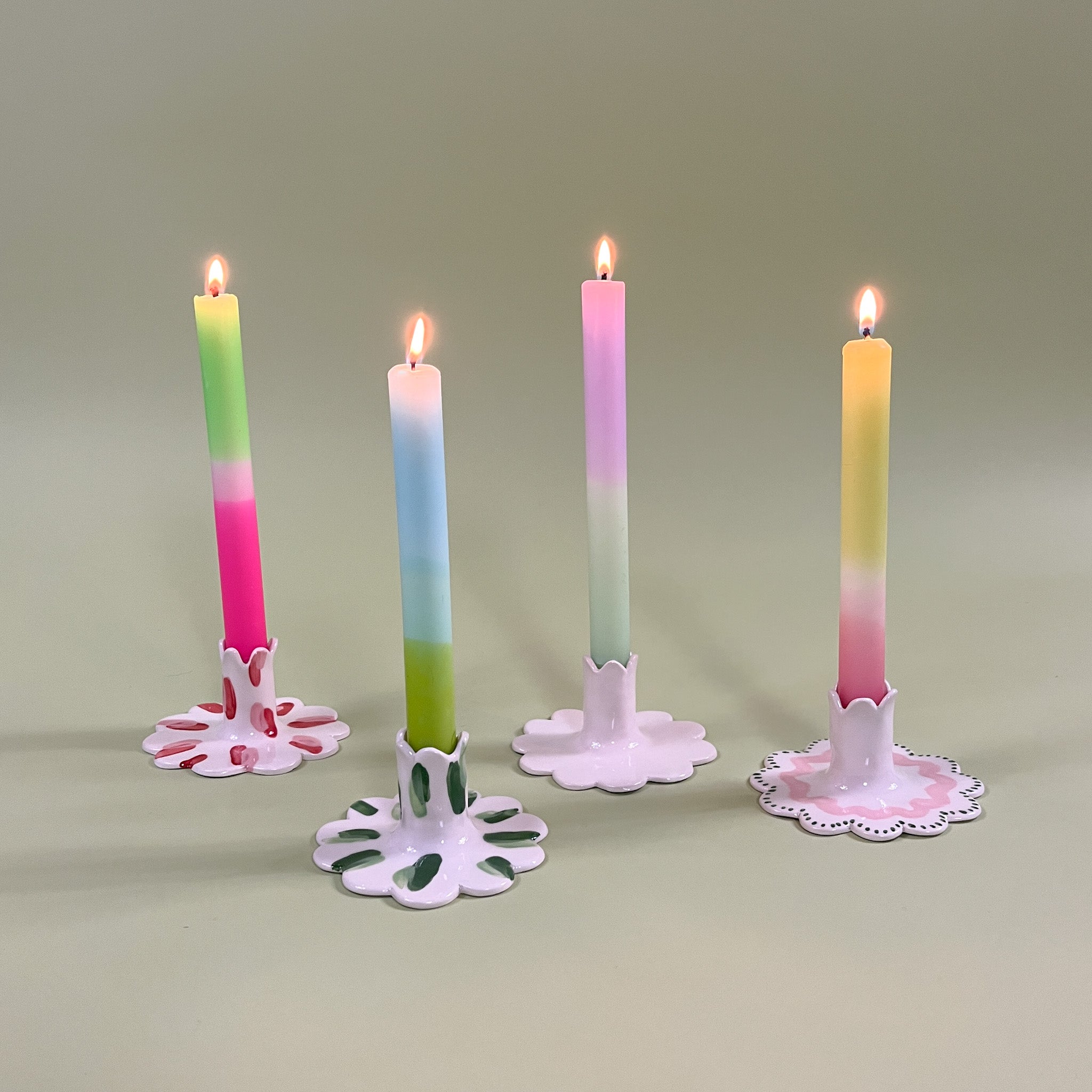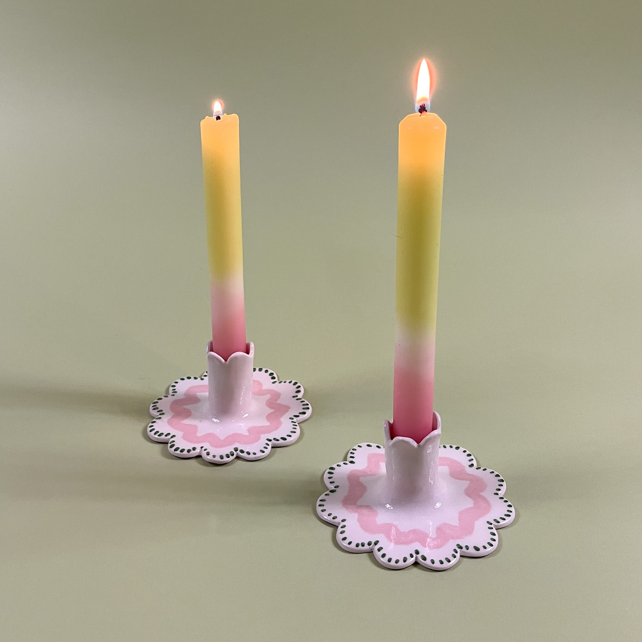 Crafted by hand in Spain, these Harbor Trail patterned ceramic candle holders in pink and green are the epitome of simple chic kicked-up with a scalloped flourish. These candleholders are the perfect base for our Made in the UK highly colored taper candles. The perfect host/hostess gift.