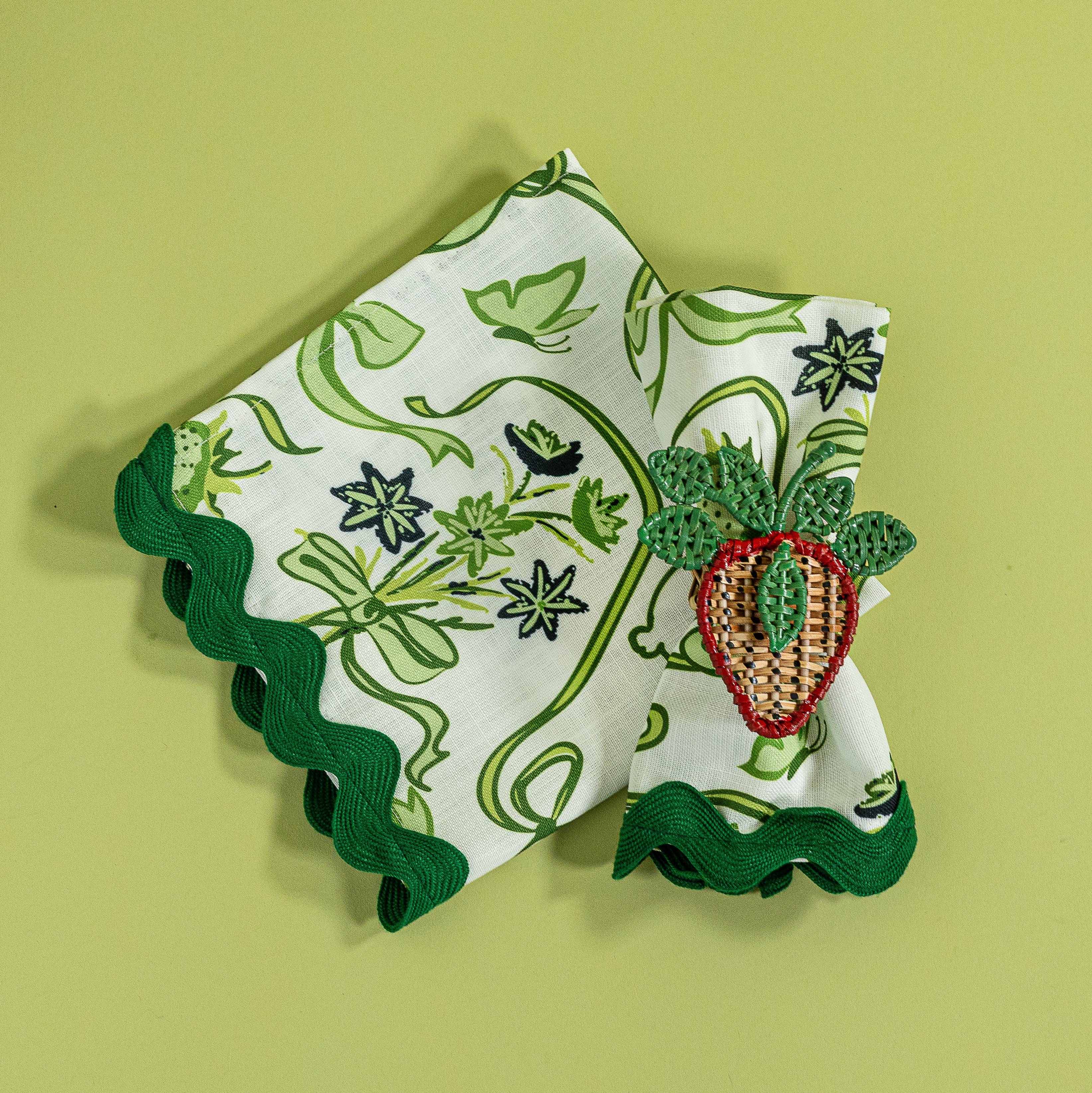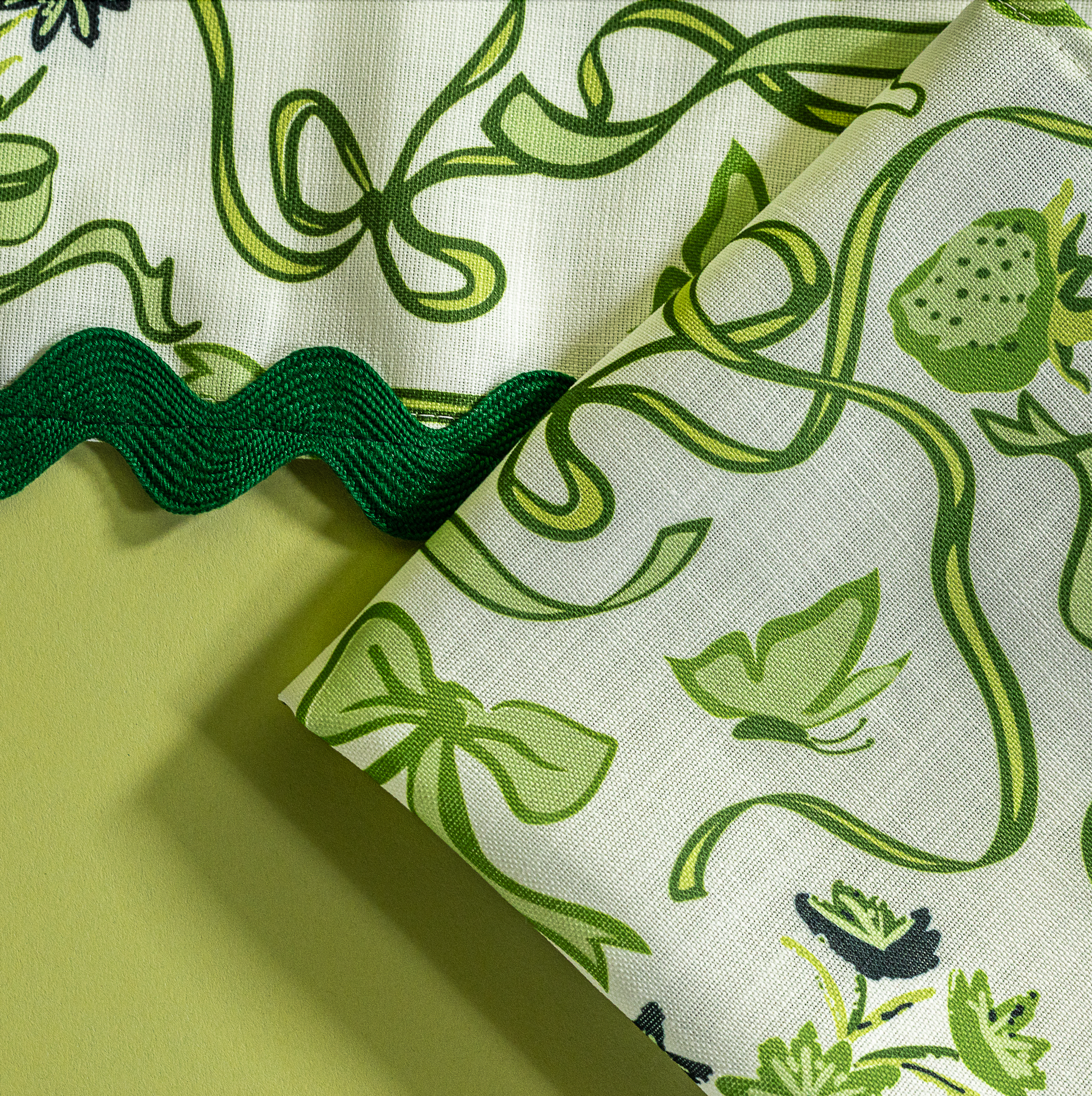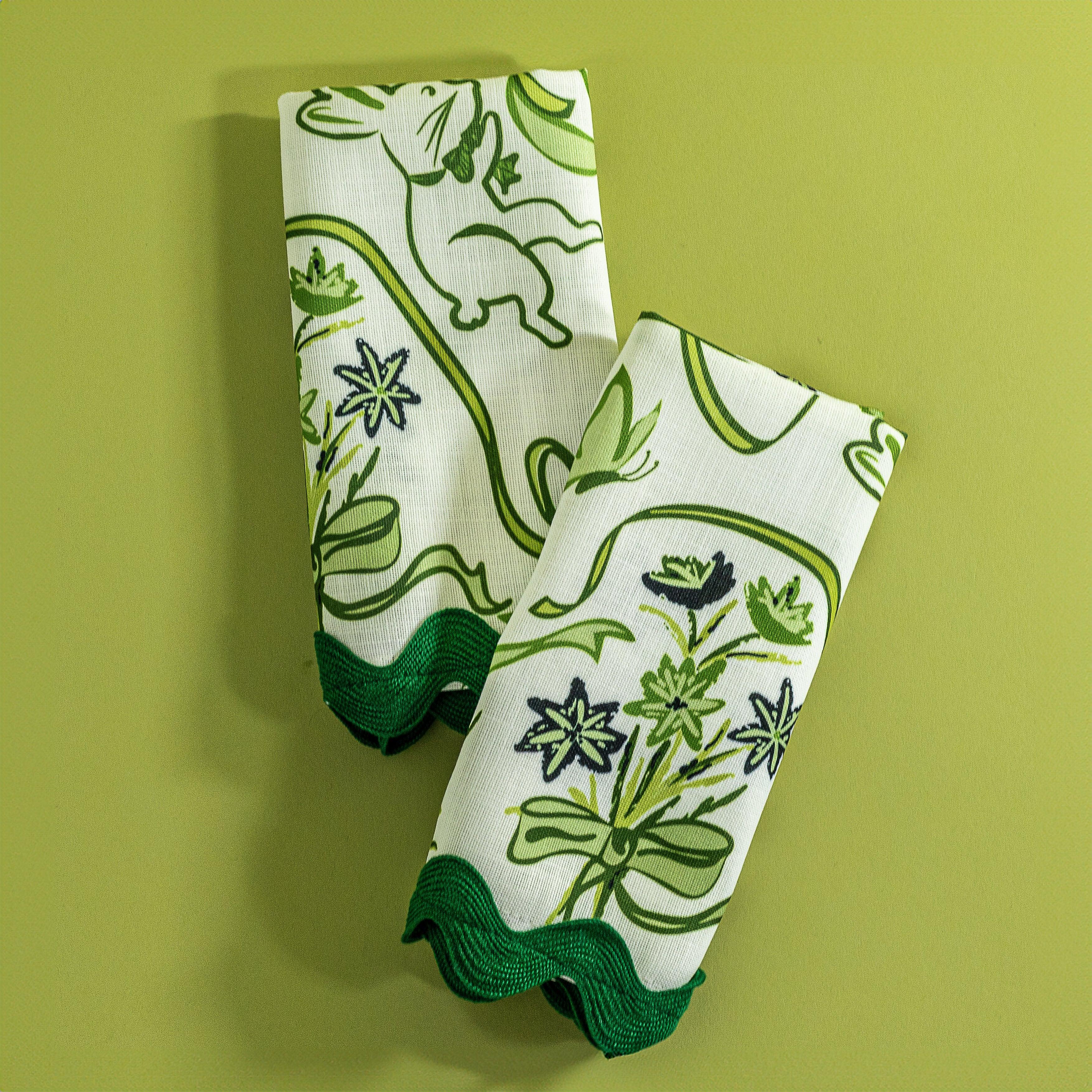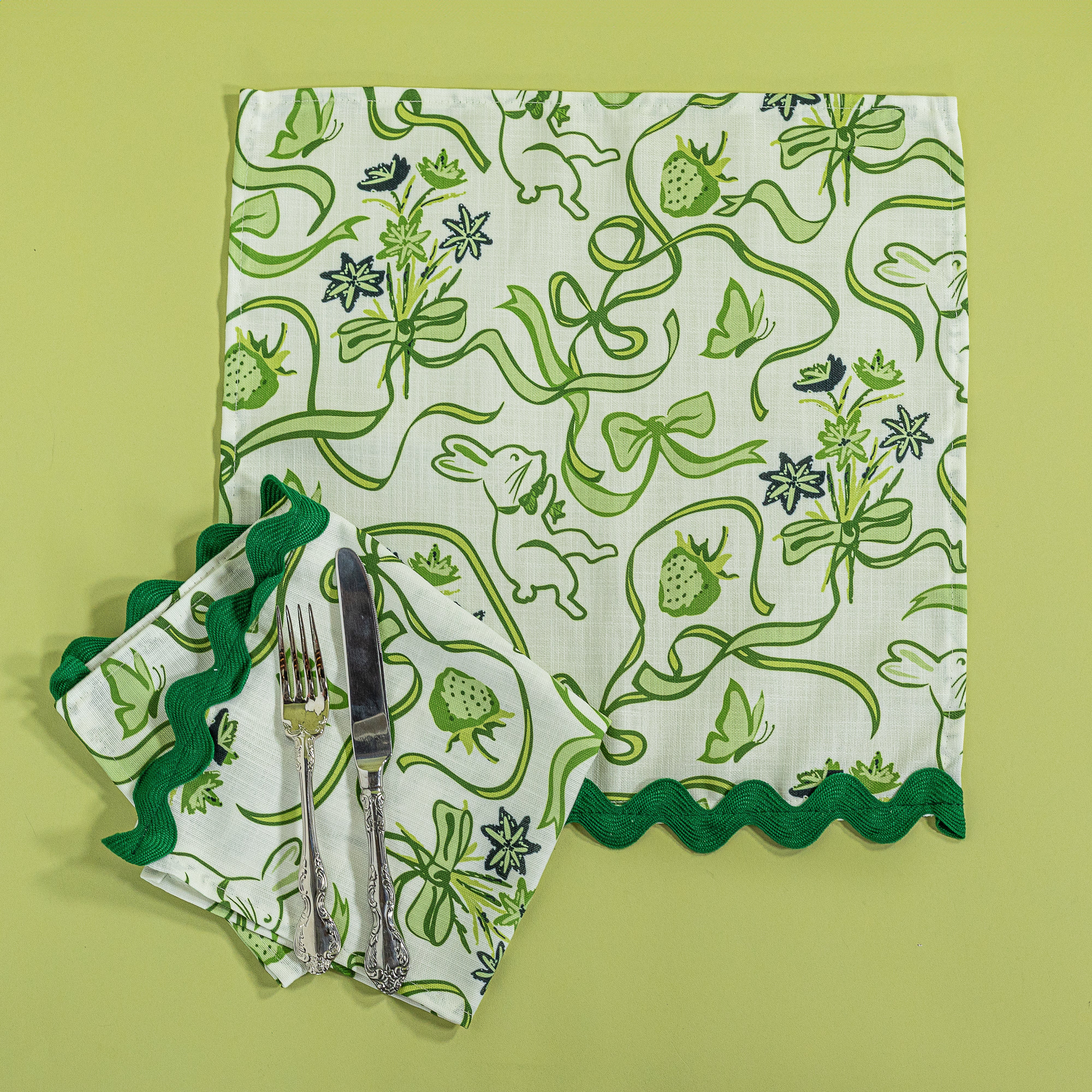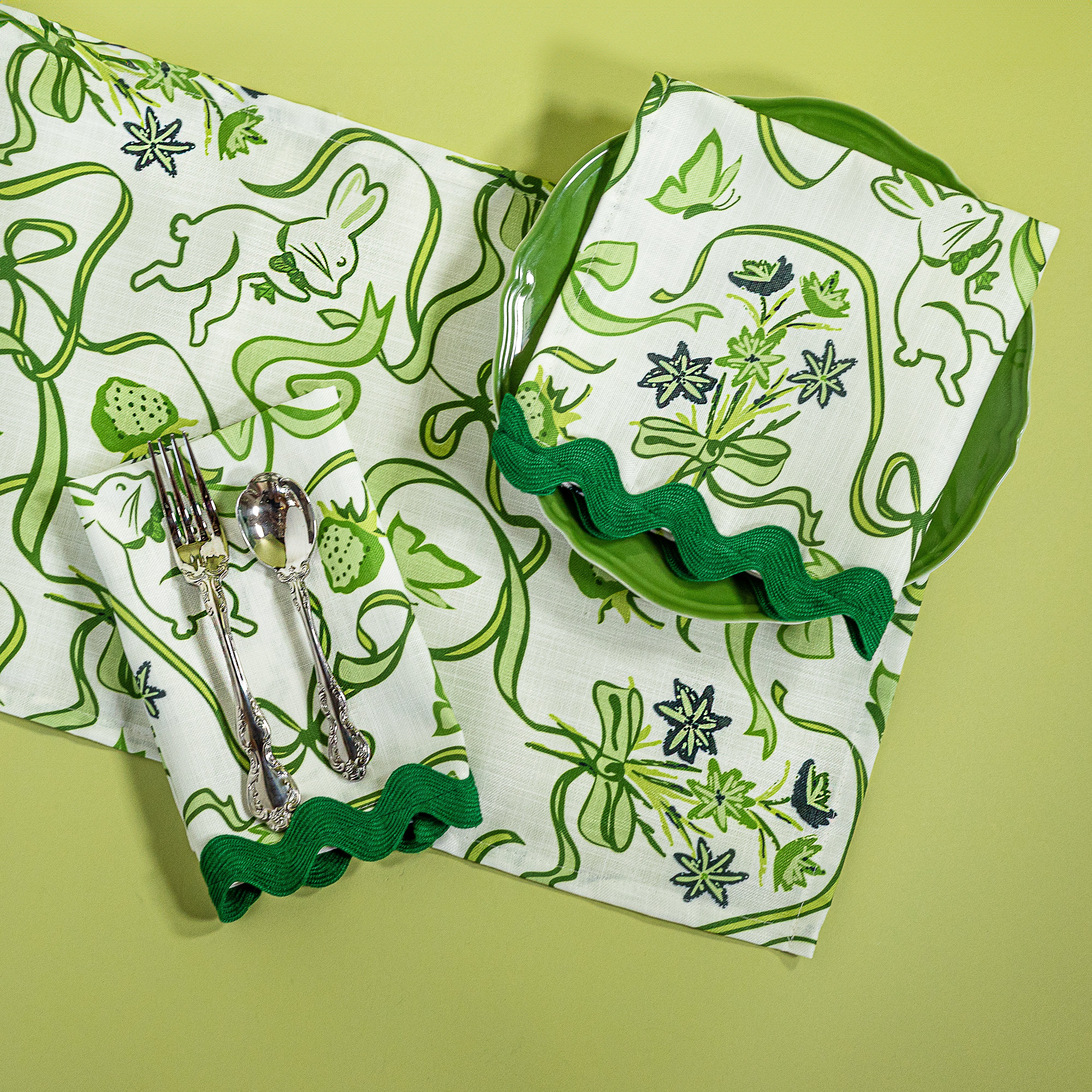 Designed by the Madcap Cottage team, these wonderful bunnies and bow print cloth dinner napkins deliver the perfect zing for Spring. Bunnies and bows, absolutely charming! Printed upon a linen-like poly in green with a coordinating ric rac trim.