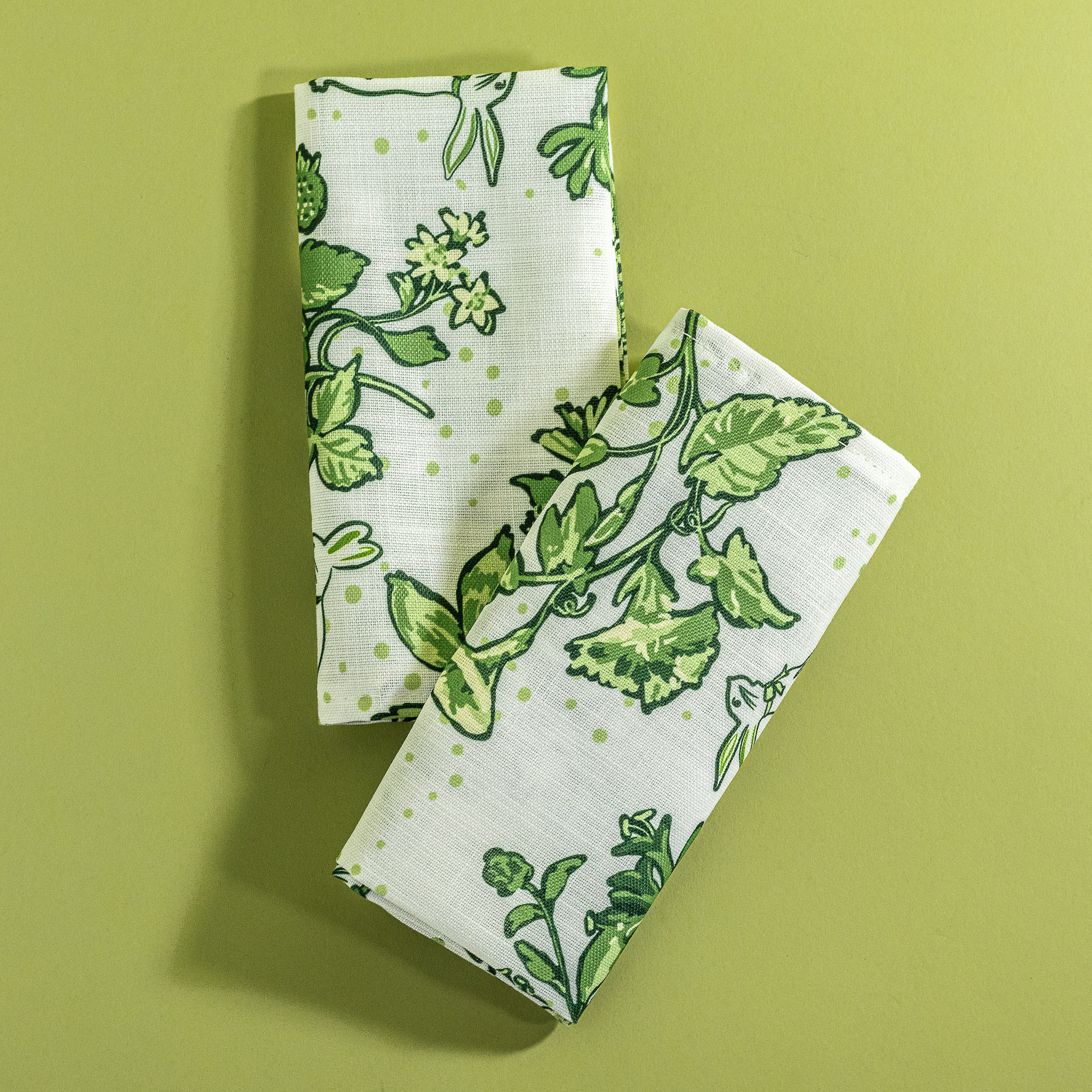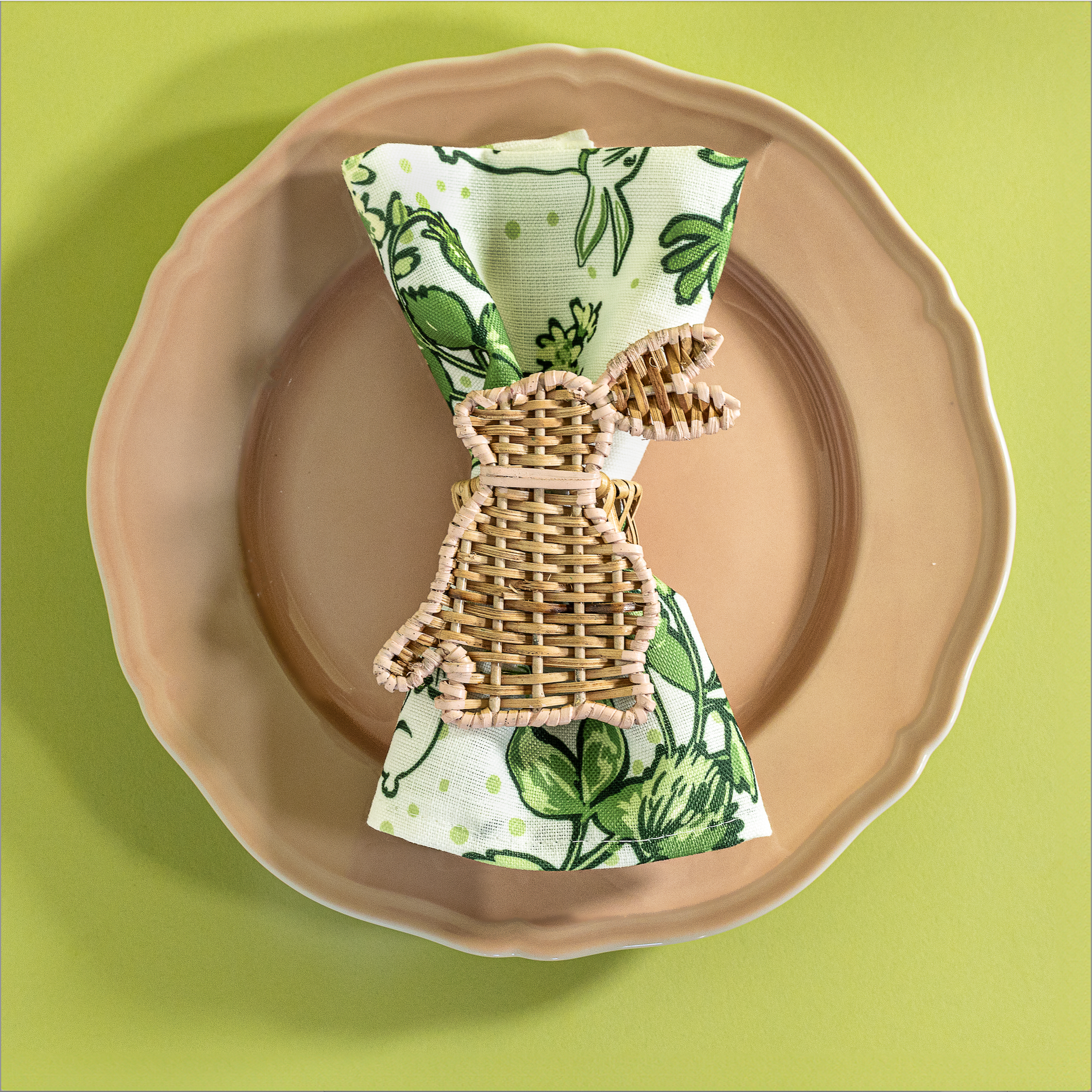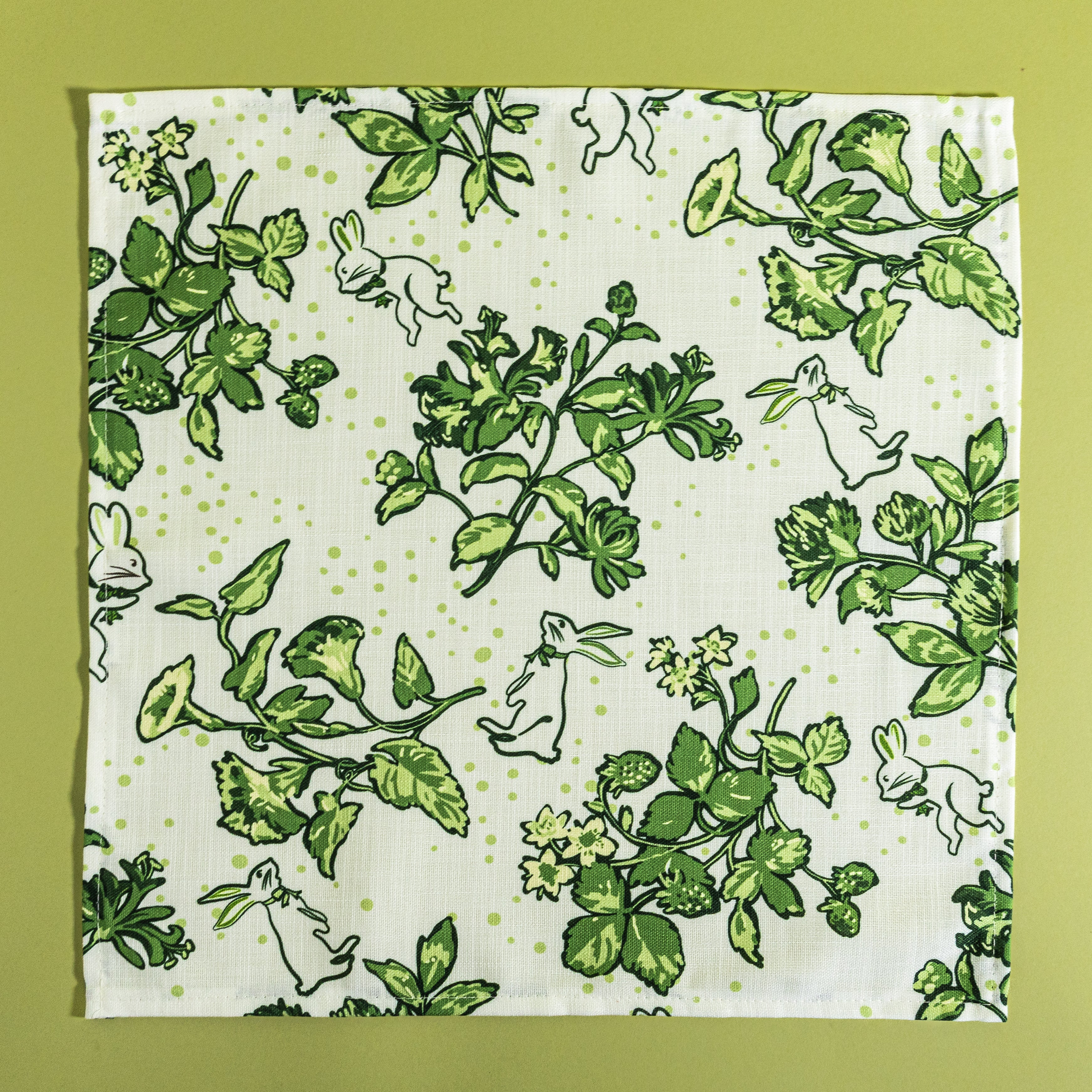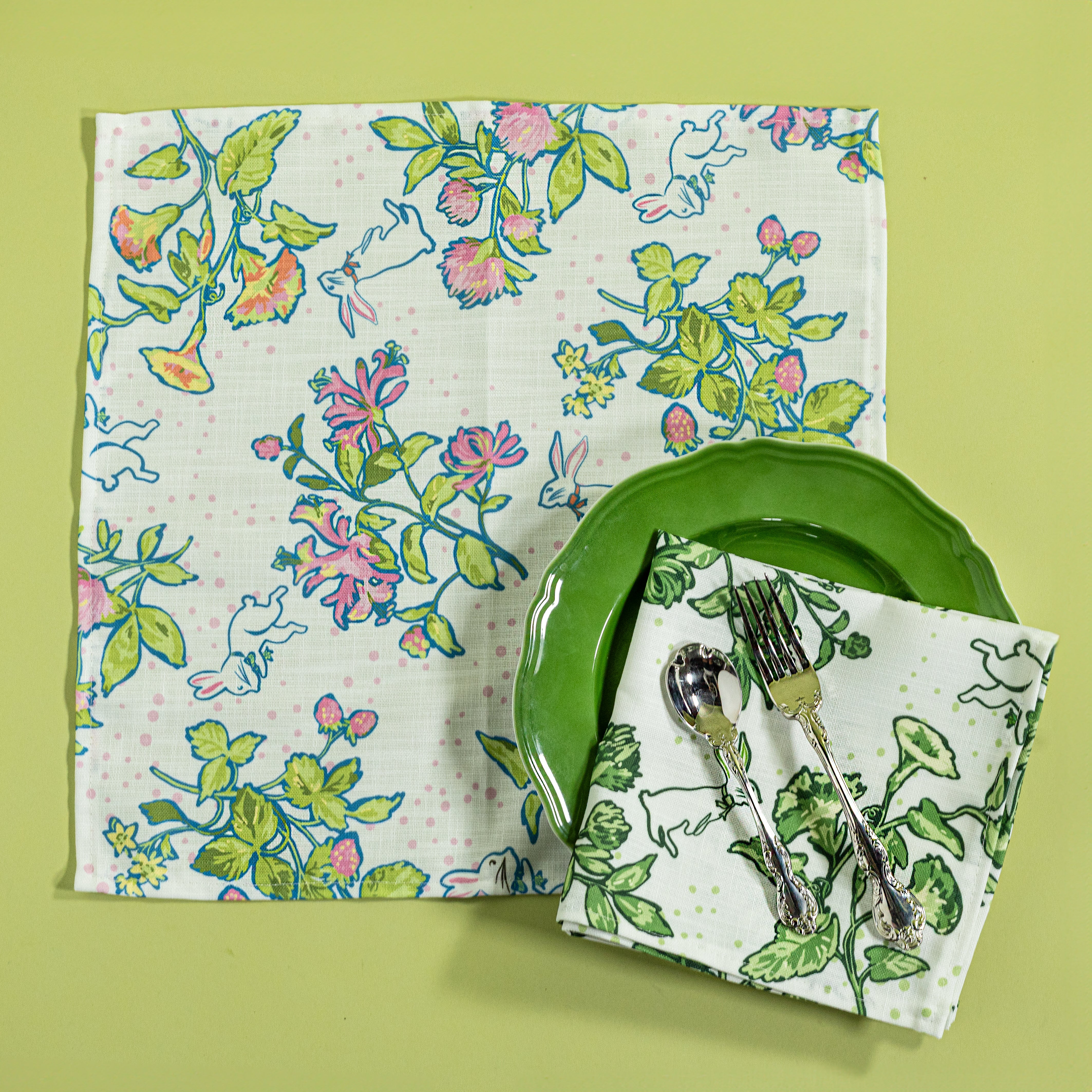 Designed by the Madcap Cottage design team, these wonderful no-iron cloth dinner napkins in a floral, bunny and strawberry print fabric deliver the perfect zing for spring. Strawberry fields forever, indeed! Printed upon a linen-like poly in green.