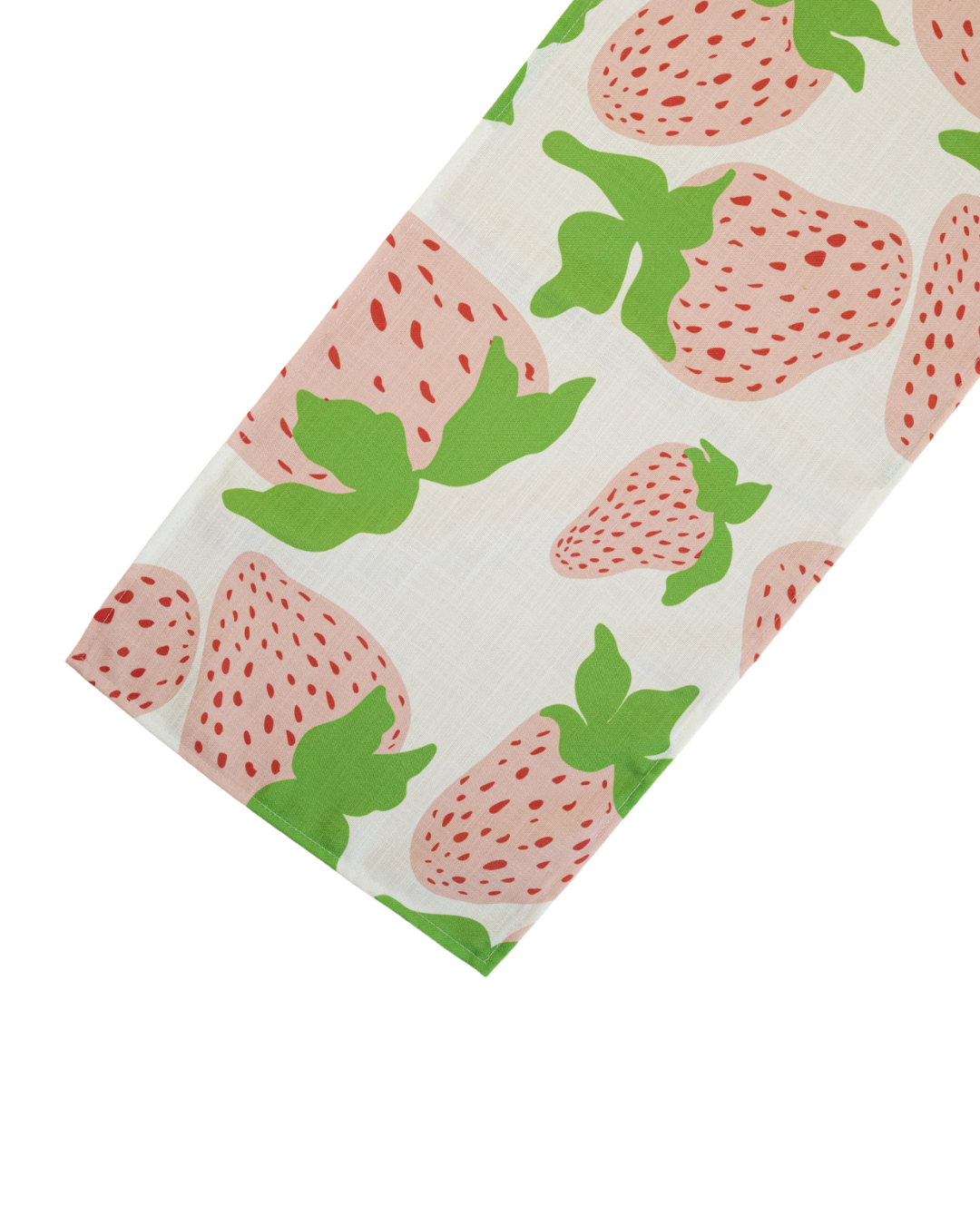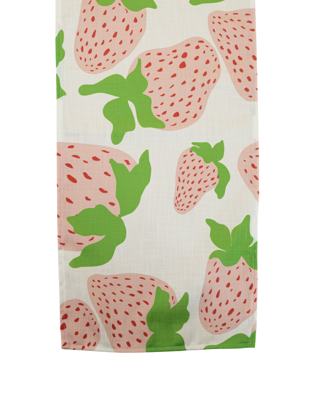 Garden Party Strawberry cloth table runner designed by madcap cottage with motifs of large pink and green strawberries with green stems.