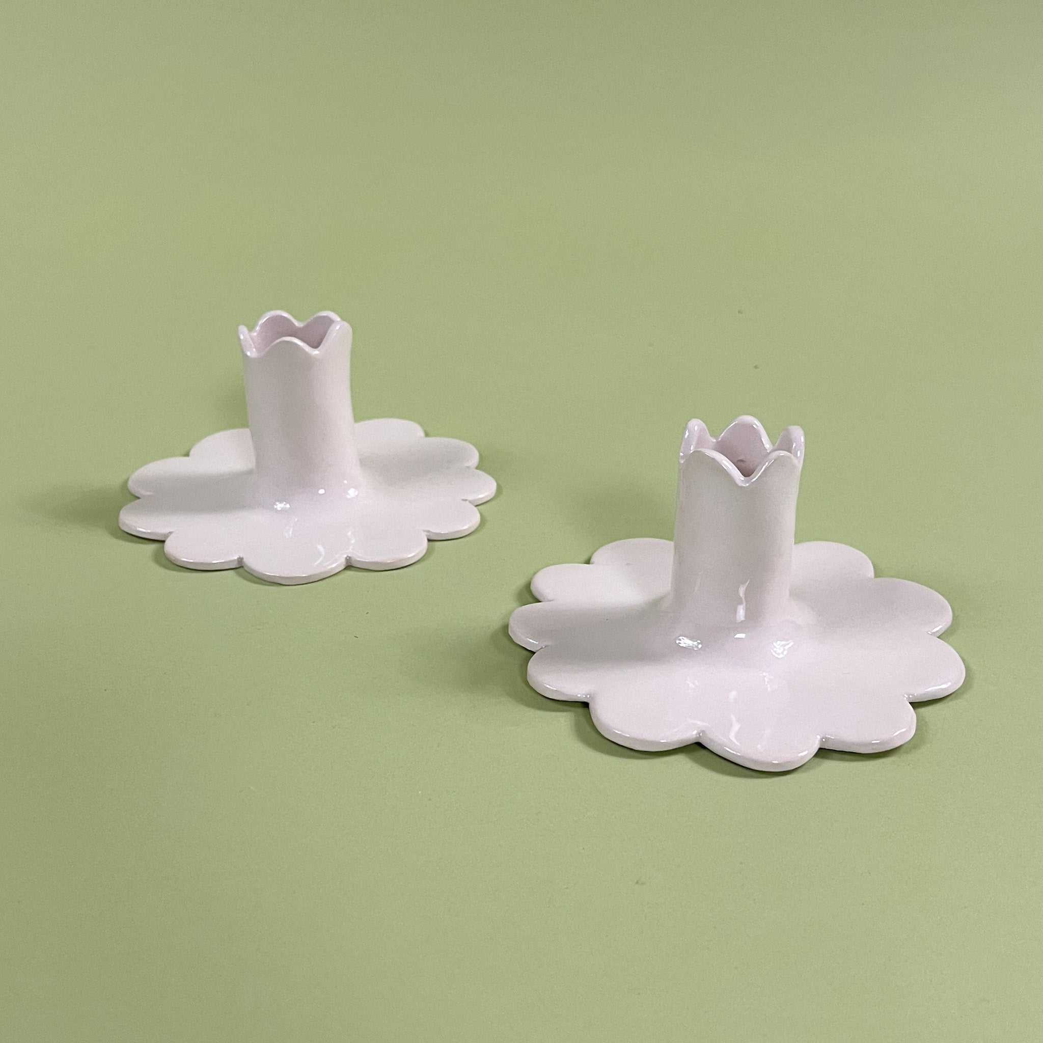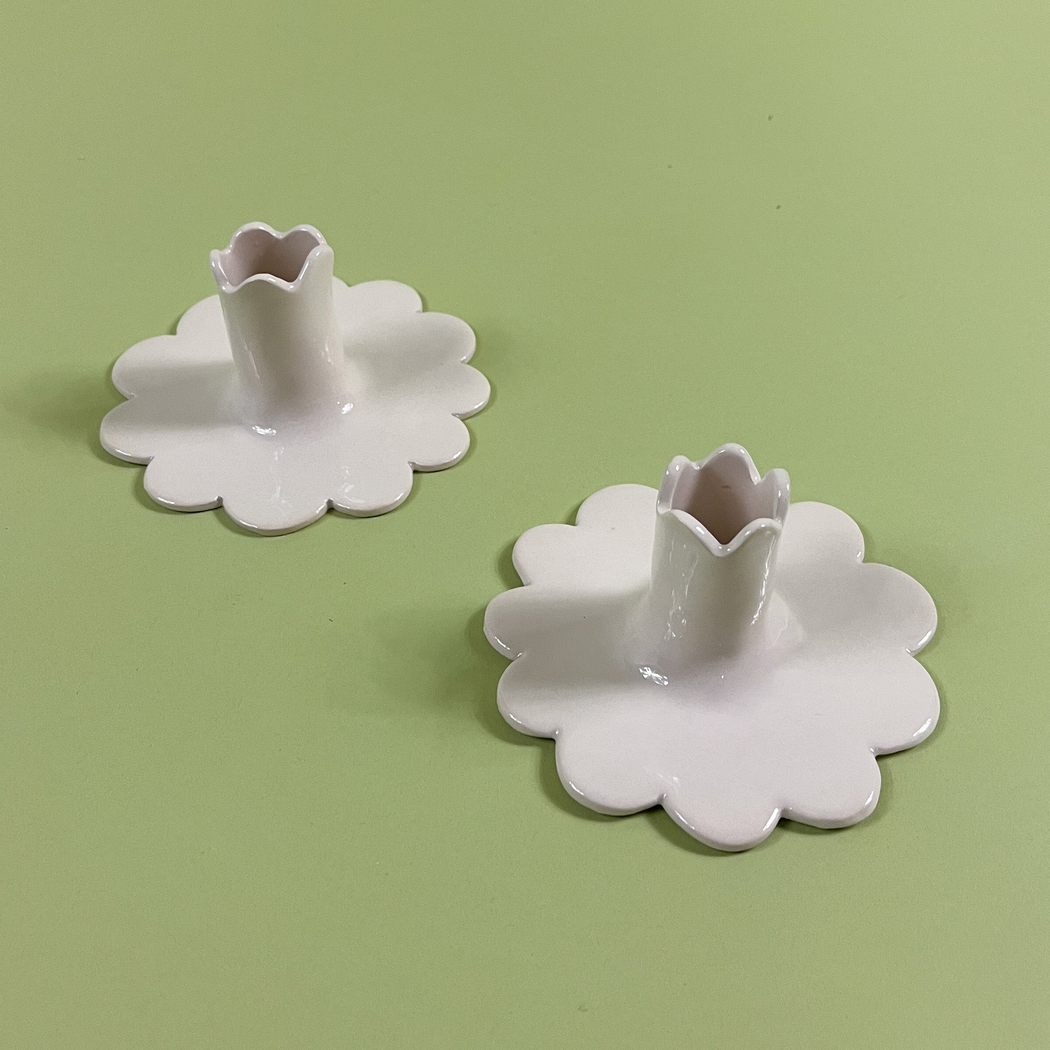 Crafted by hand in Spain, these white ceramic candle holders are the epitome of simple chic kicked-up with a scalloped flourish. These candleholders are the perfect base for our Made in the UK highly colored taper candles. The perfect host/hostess gift.