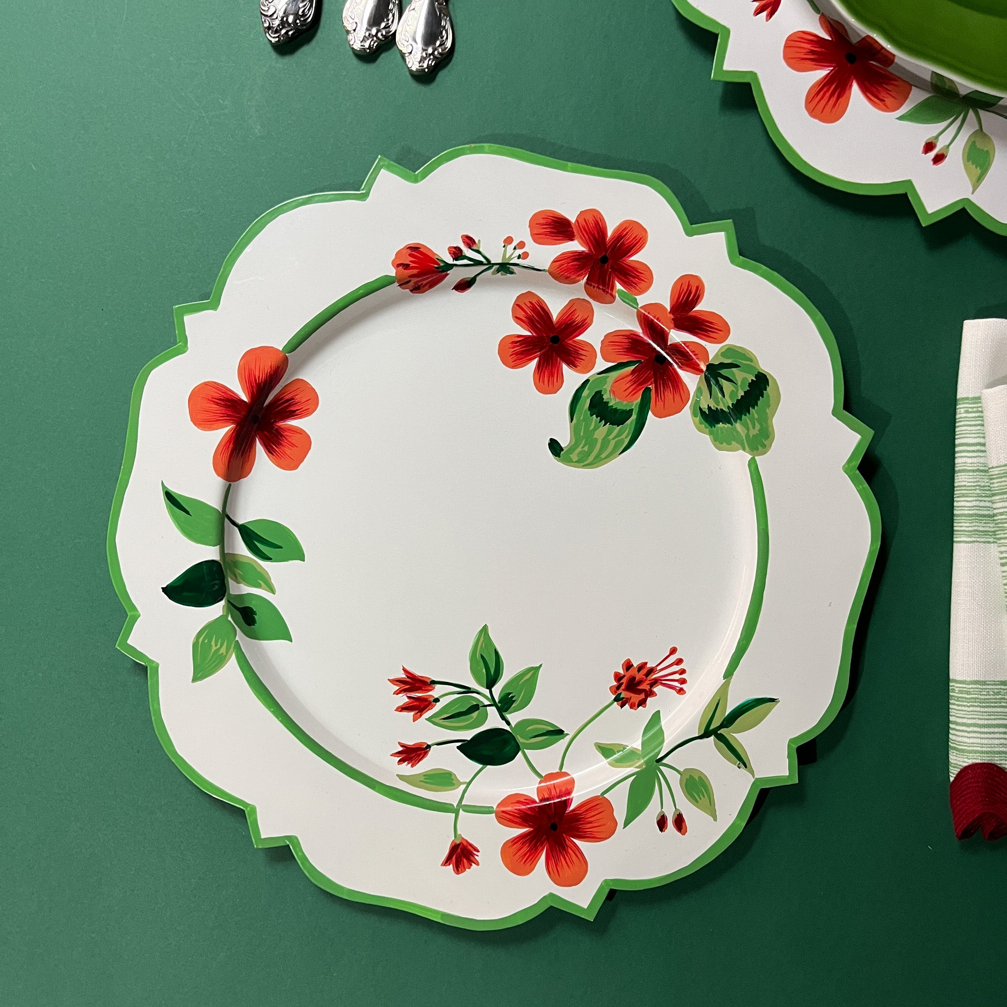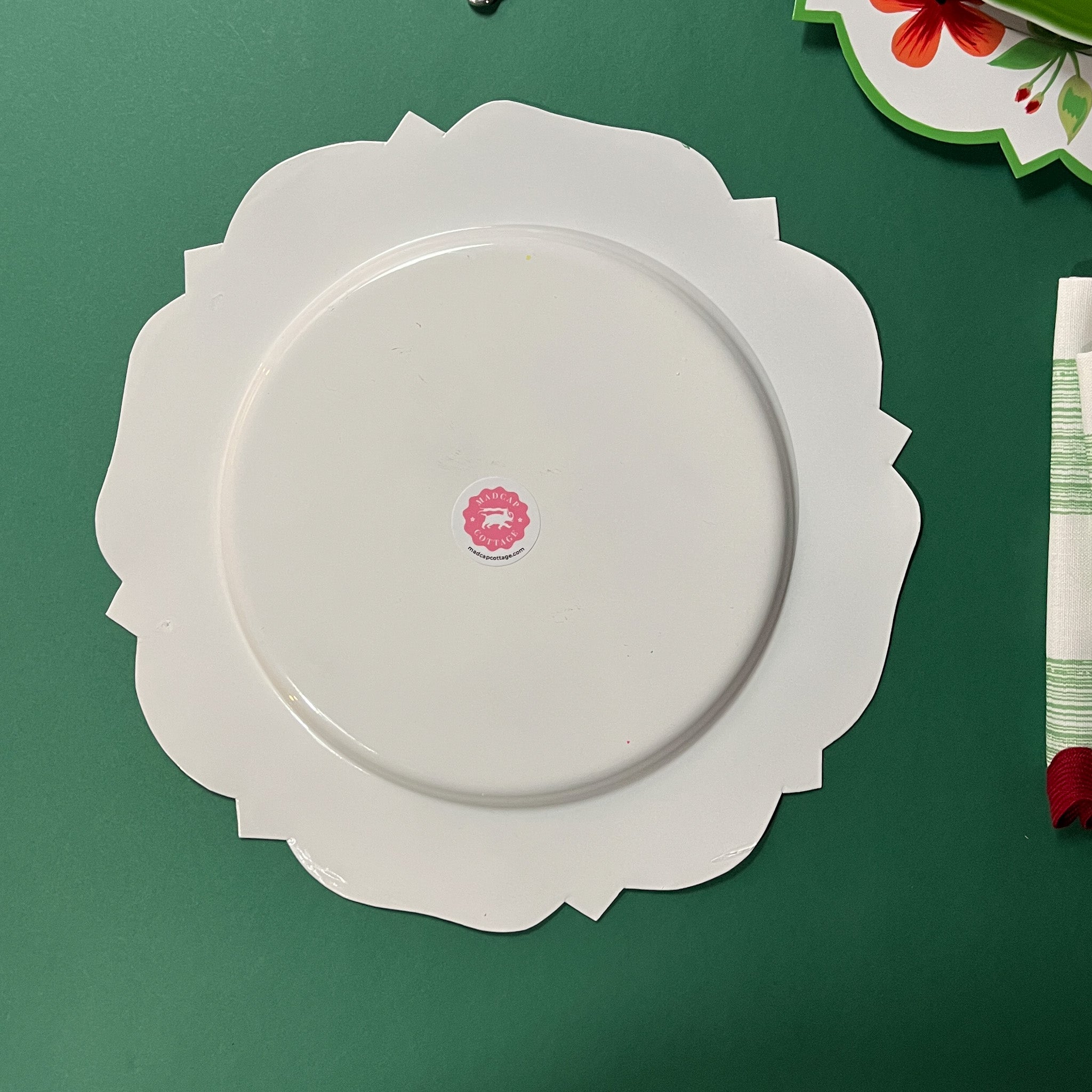Hand-painted in India based upon Madcap's original designs, these Cottage Grove geranium tole-metal hand-painted chargers are emblazoned with our red, green and white geranium pattern and will take your holiday table from nice to knockout.