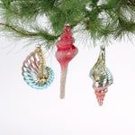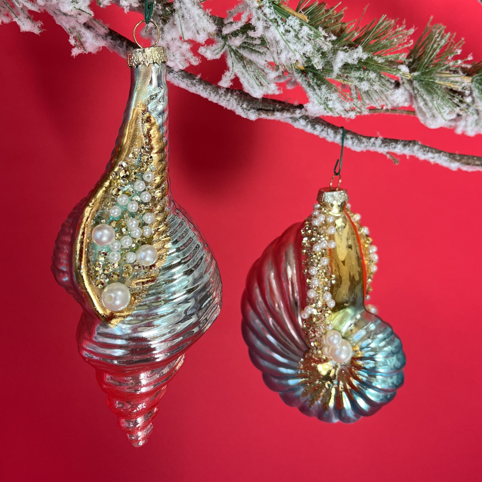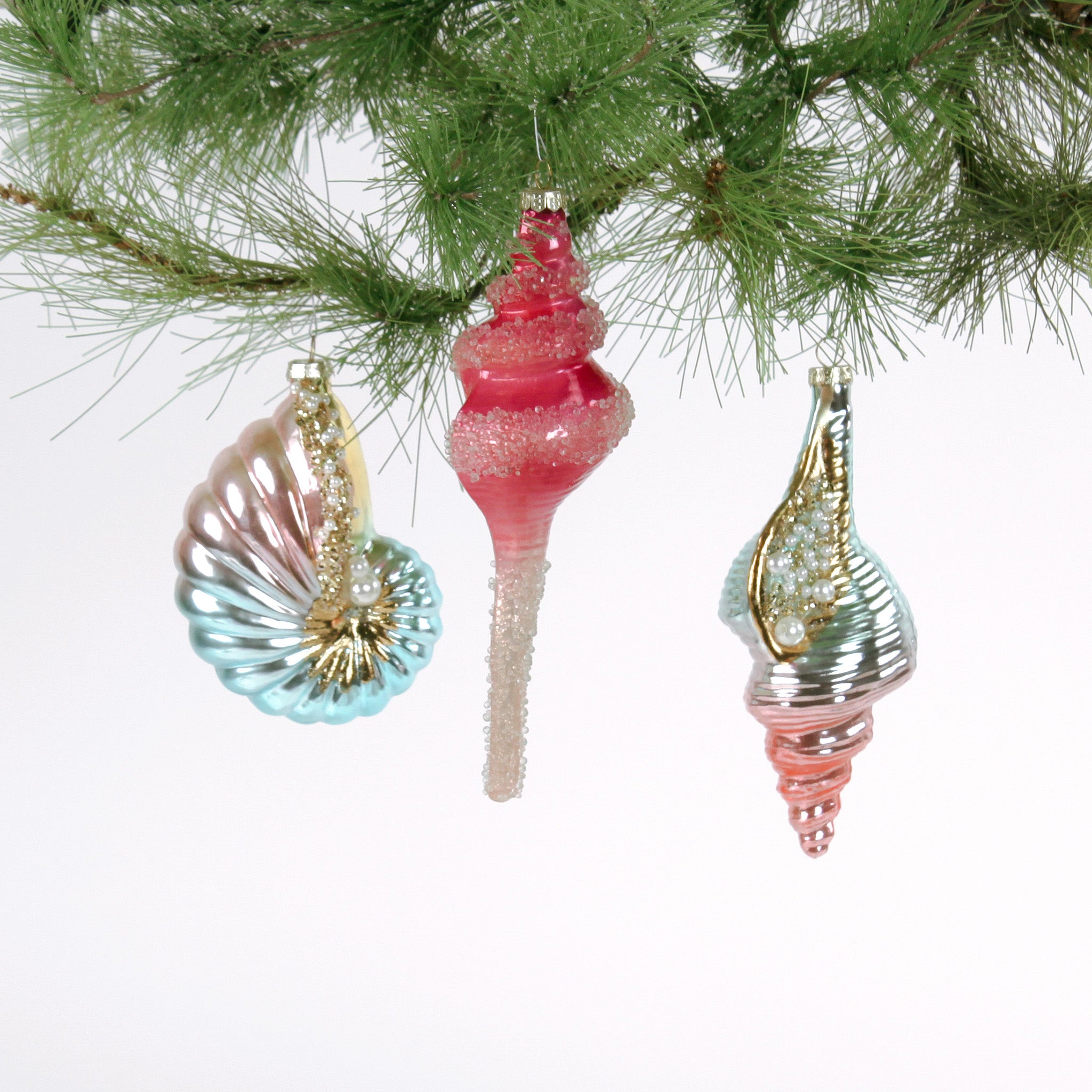 Oversized plucked-from-the-sea, iridescent glass shell coastal Christmas ornaments in pastel colors embellished with gold and faux pearls are sure to become new seasonal favorites.