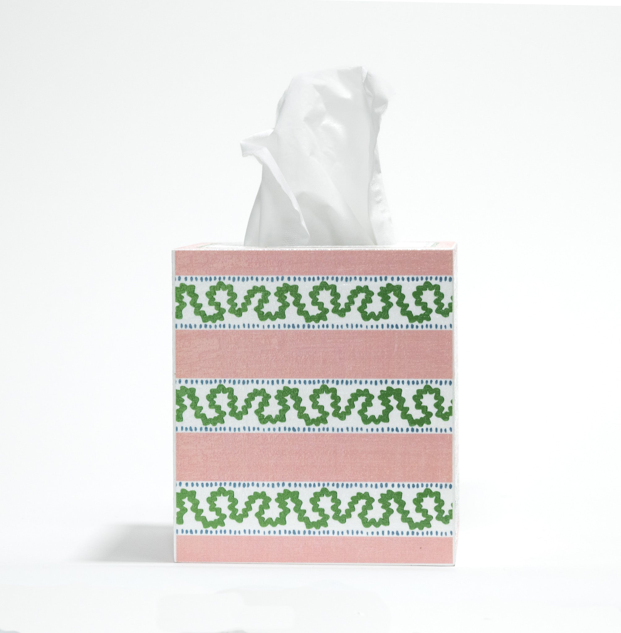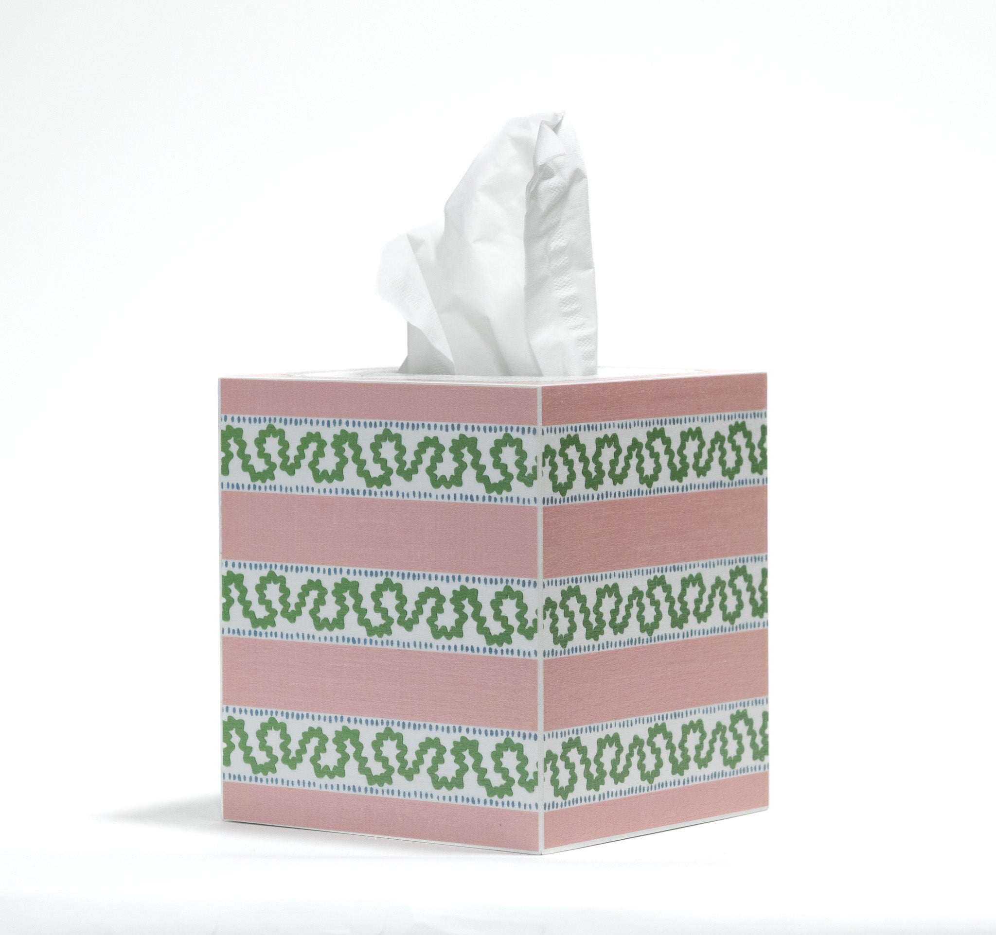 The Madcap Cottage Harbor Trail pattern has become a top seller thanks to its iconic good looks in Palm Beach-plucked pink and green hues. Capture the timeless magic with this hand-decoupaged wood tissue box cover that delivers both form and function. Pair her with the matching waste basket for a perfectly accessorized look.
