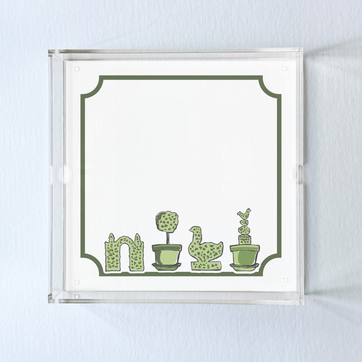 The Madcap Cottage square acrylic trays in our Garden Follies print are inspired by the gents original artwork and come in three sizes featuring integrated handles. The smaller trays make for a perfect catchall for keys or as a desktop organizer; use the larger for serving tea or snacks. The perfect gift for a host or hostess. A Madcap Cottage exclusive. Also available is our Garden Follies rectangular acrylic tray!