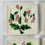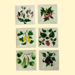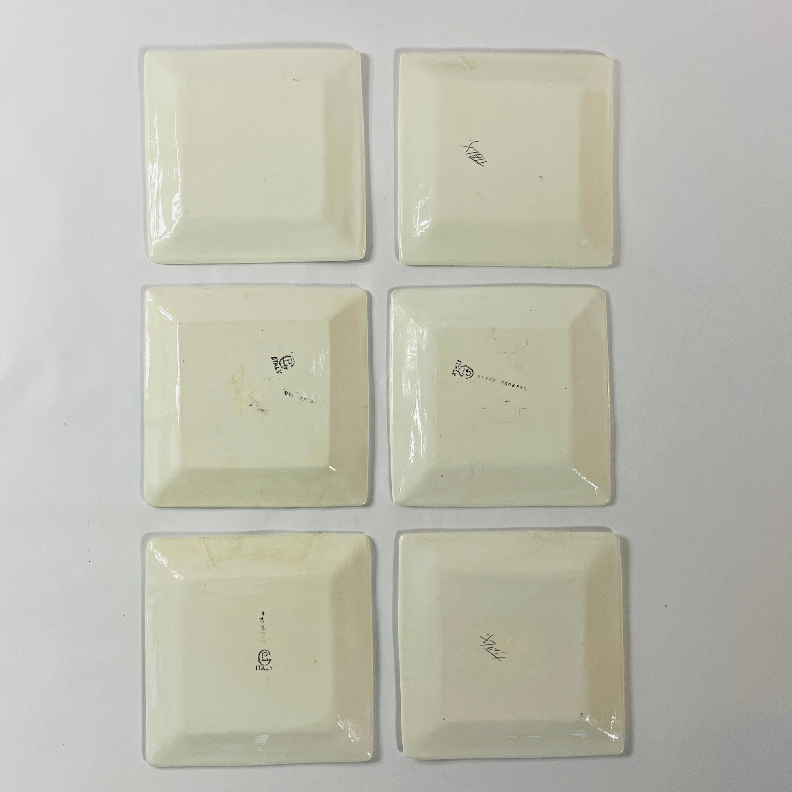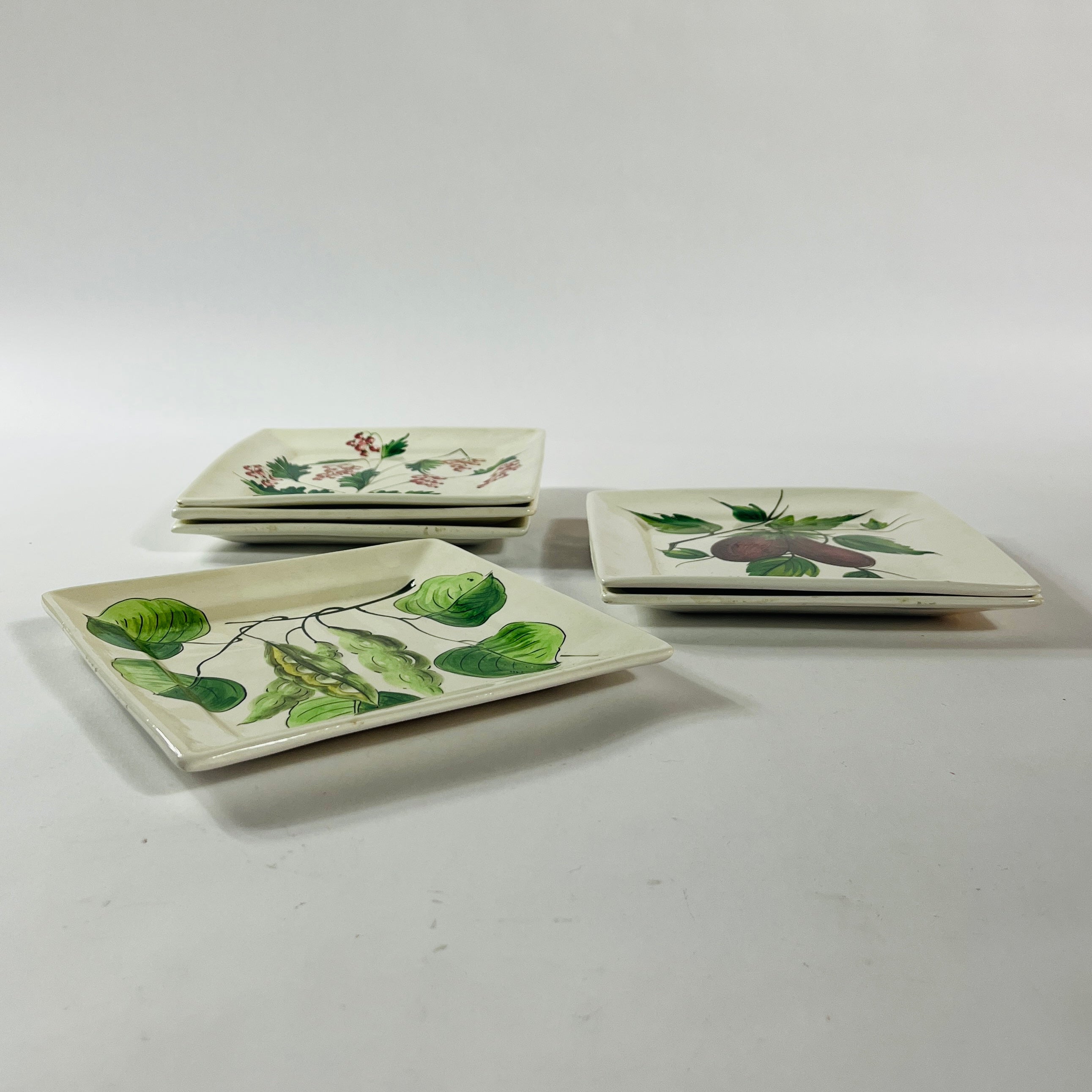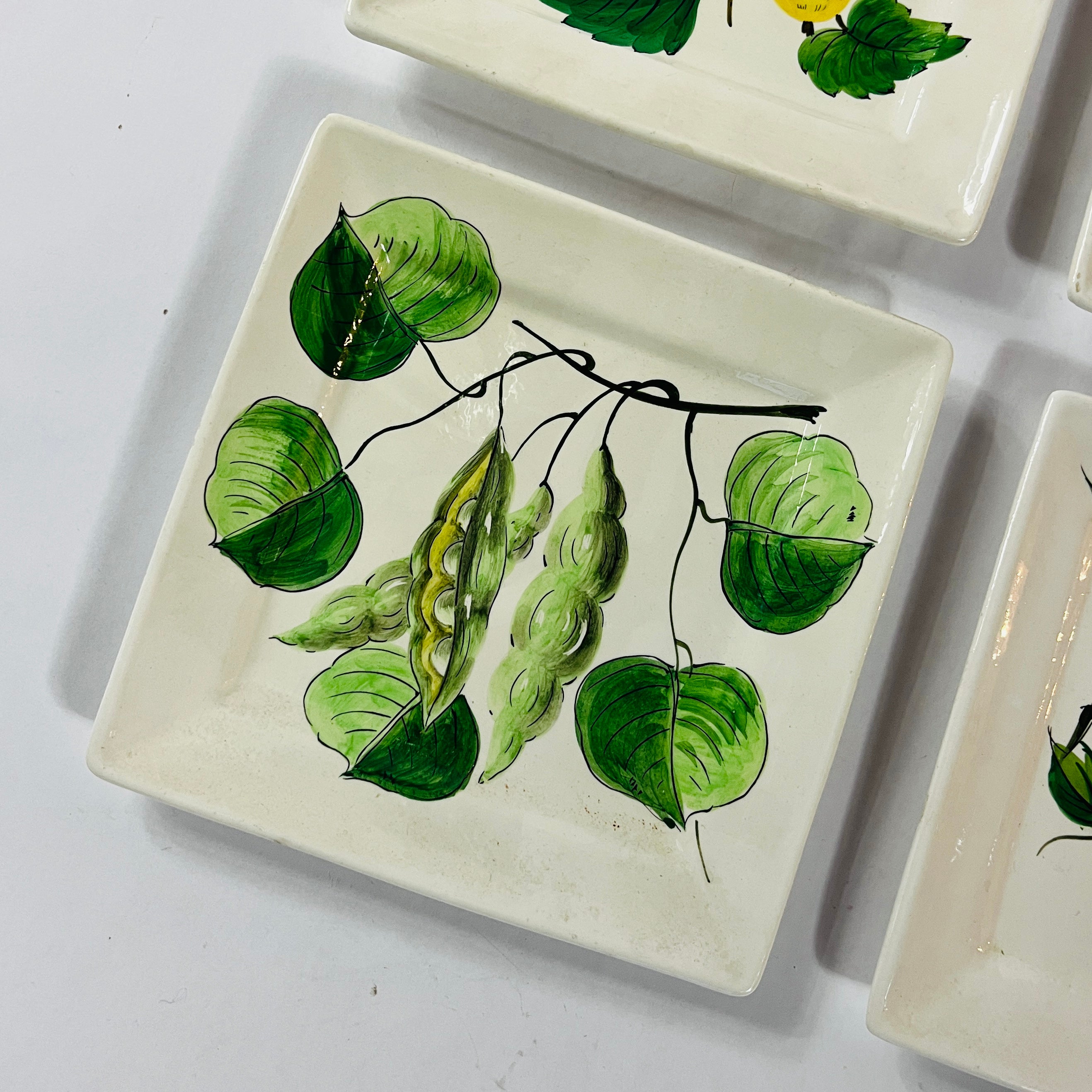 A gorgeous set of six fruit-and-vegetable-themed square vintage Italian plates perfect for serving up an endive salad or a dessert of profiteroles topped with chocolate sauce. Lemons! Beans! Aubergines! Tomatoes! And more! Imported from Italy. Molto bene.
