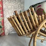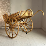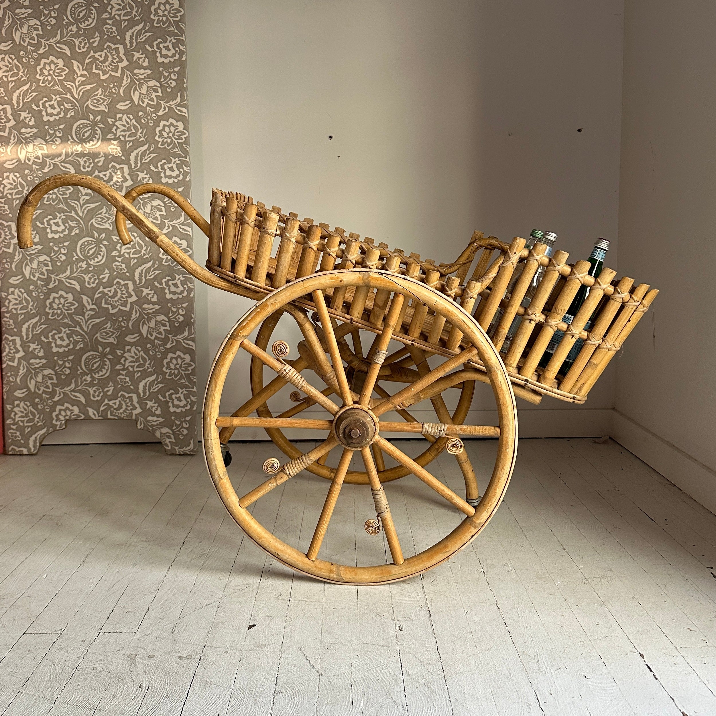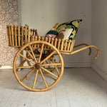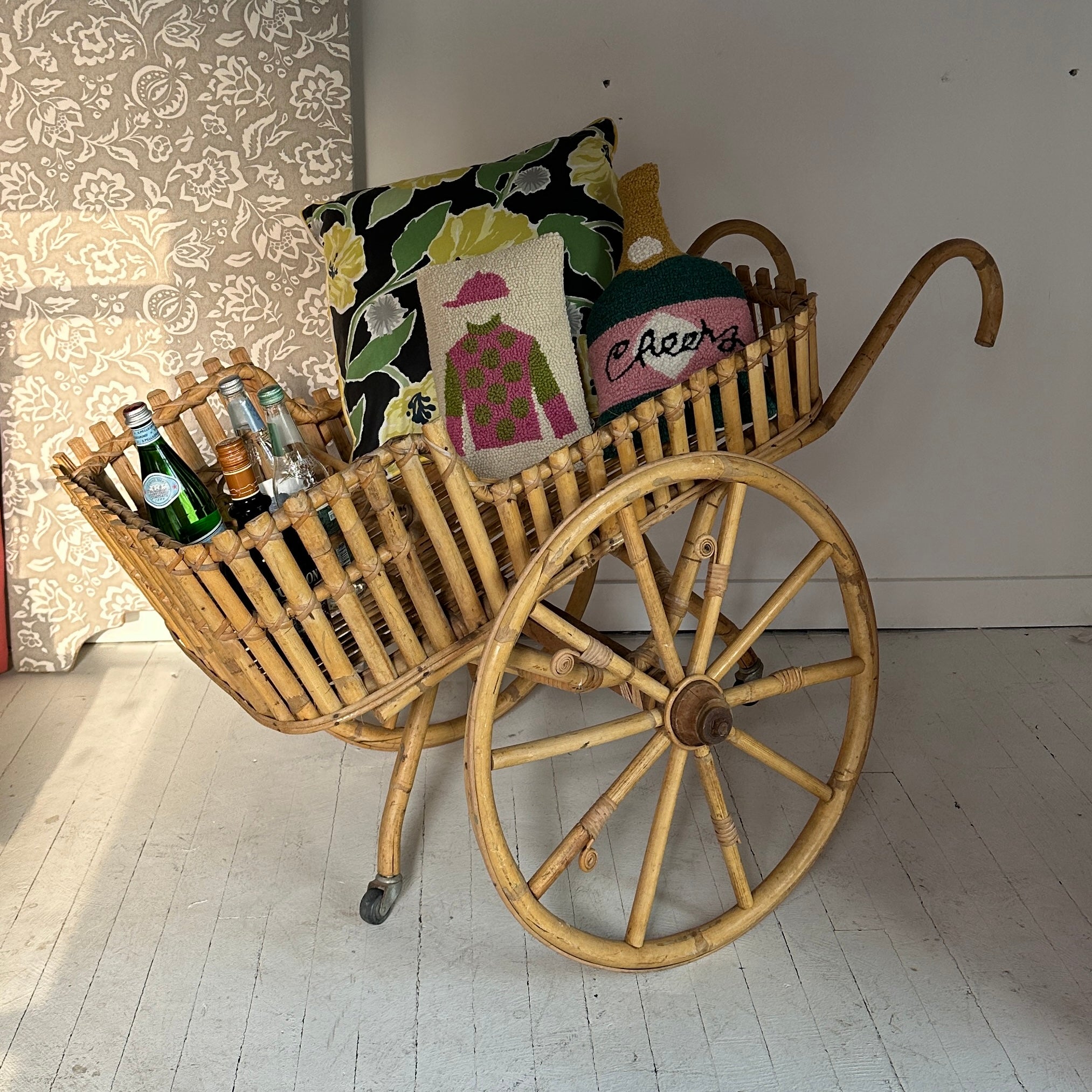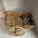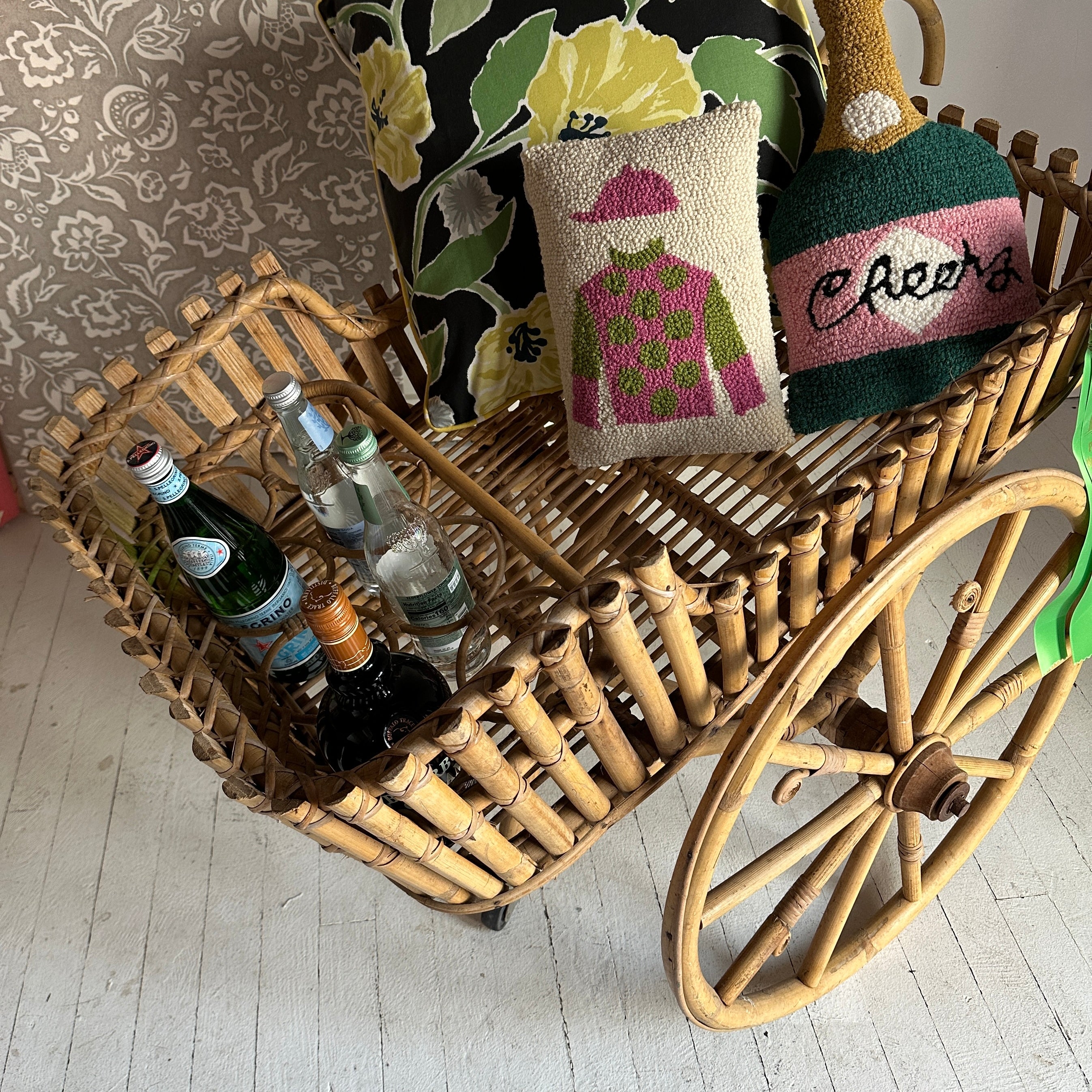 A stunning 1950s-era rattan wheeled bar cart with plenty of storage for wine bottles, sparkling water, and glasses. Perfect for your Derby Day party and those easy-breezy patio soirees this summer! We especially love the rattan, fiddlehead-like curlicues upon the cart's oversized side wheels. Not to mention the cart's steadying third wheel that makes serving libations oh so easy.