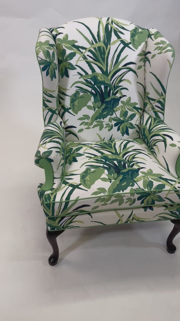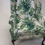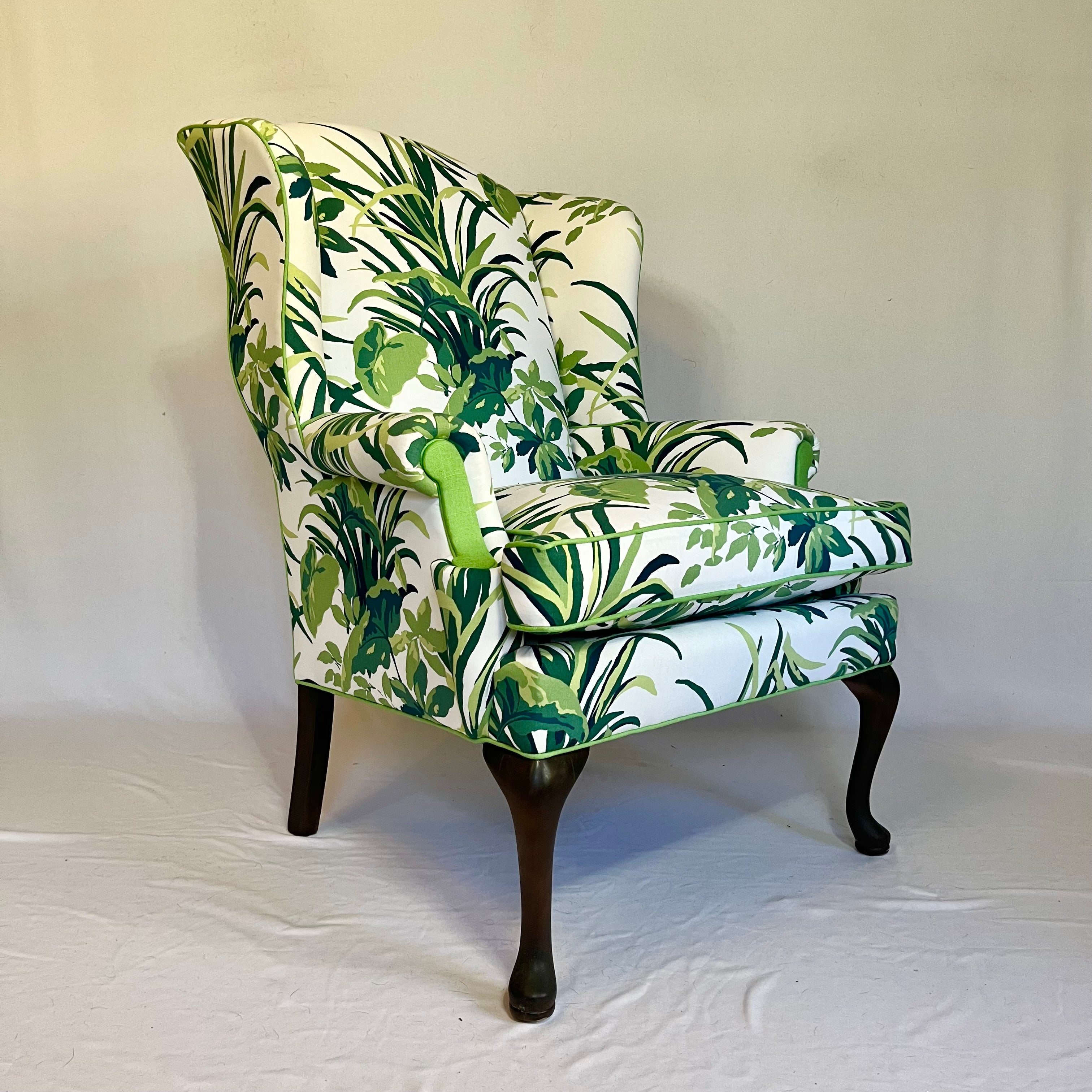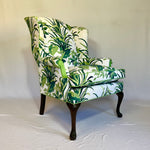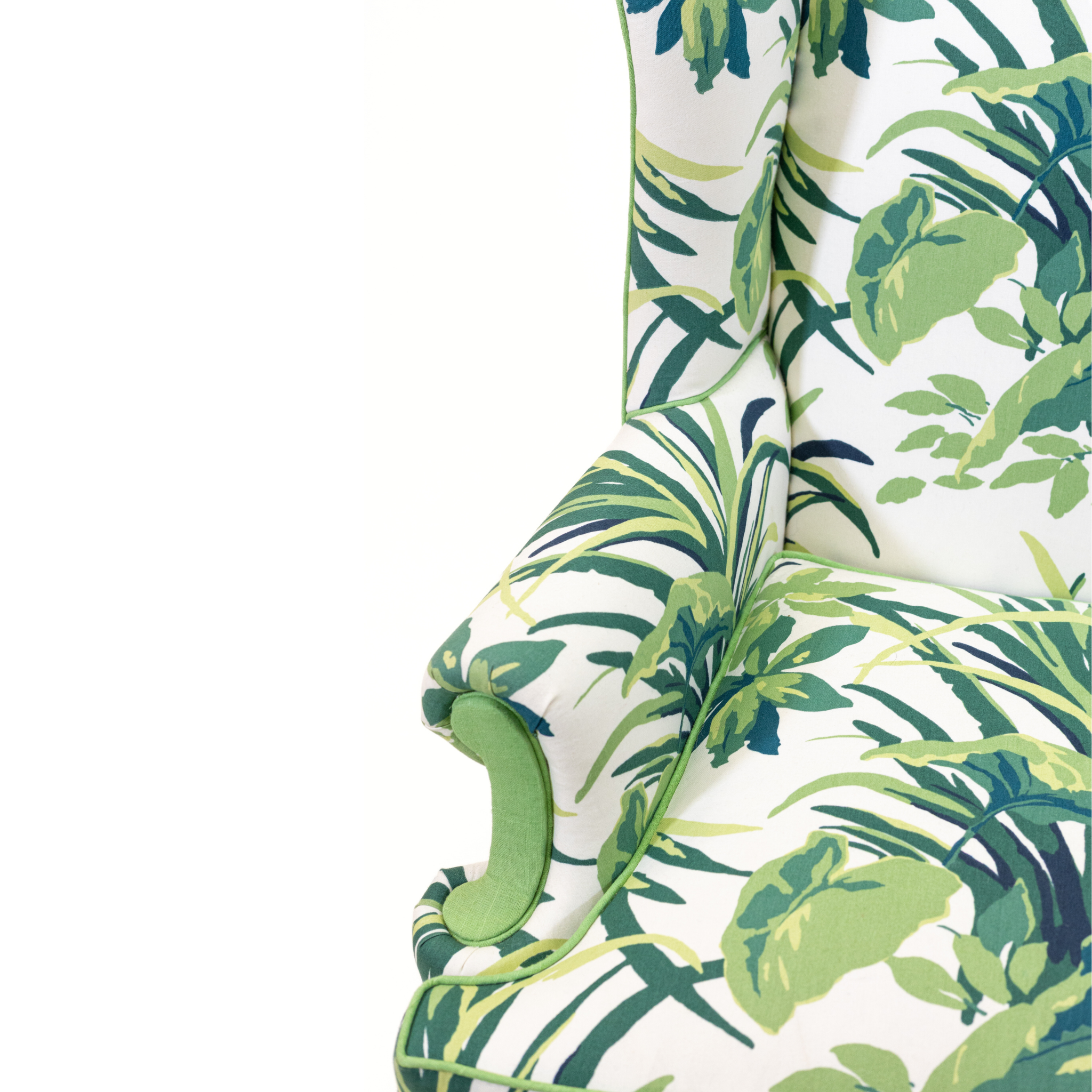 A vintage wingback with dangerous curves newly reupholstered in the Madcap Cottage Jungle Road fabric pattern in Palm Green and finished with a green linen welt and detailing. Perfect for floating in a living room or den. Super comfortable. The epitome of Palm Beach chic. Cushion fill: foam with down-and-feather wrap.