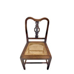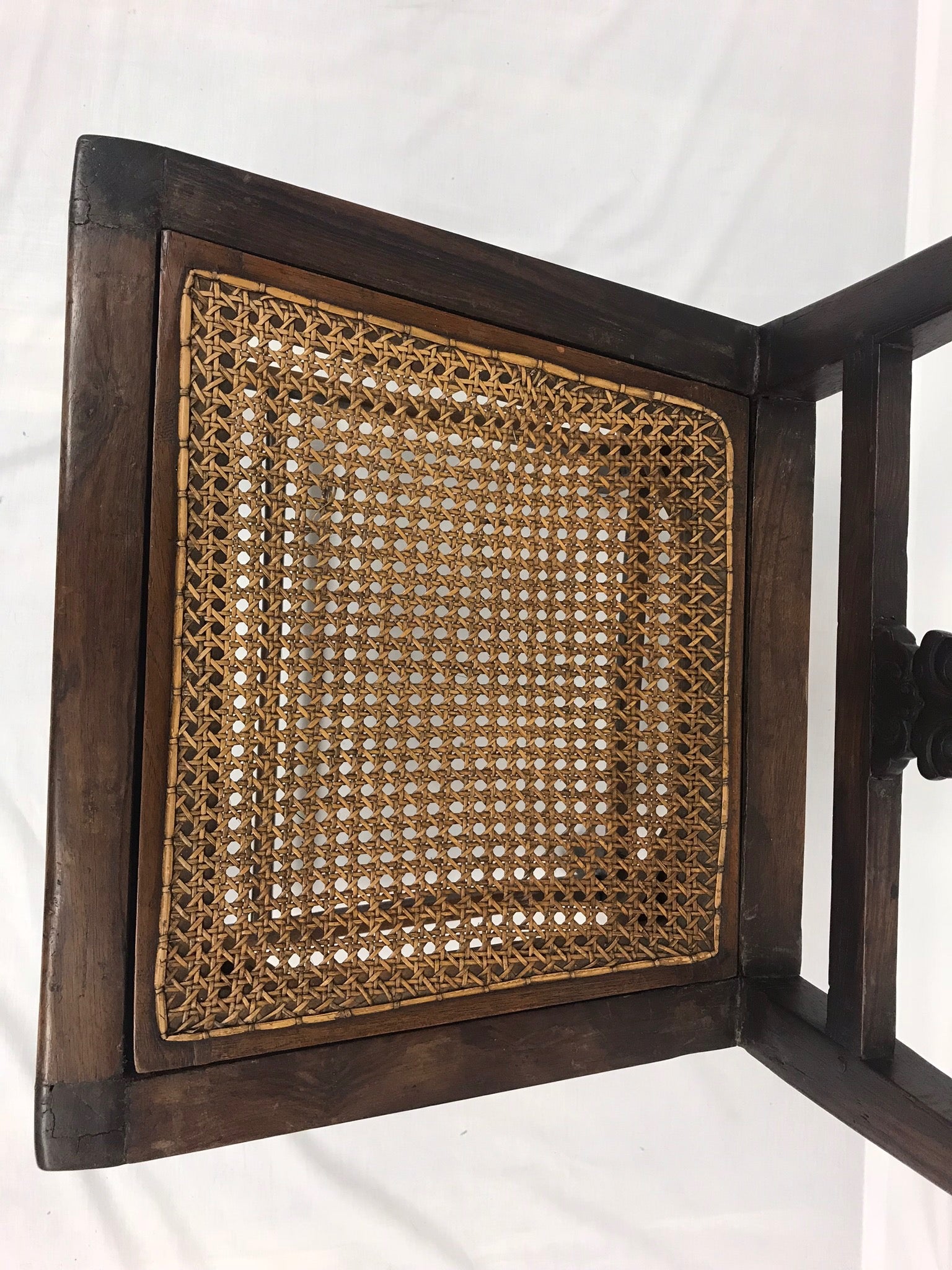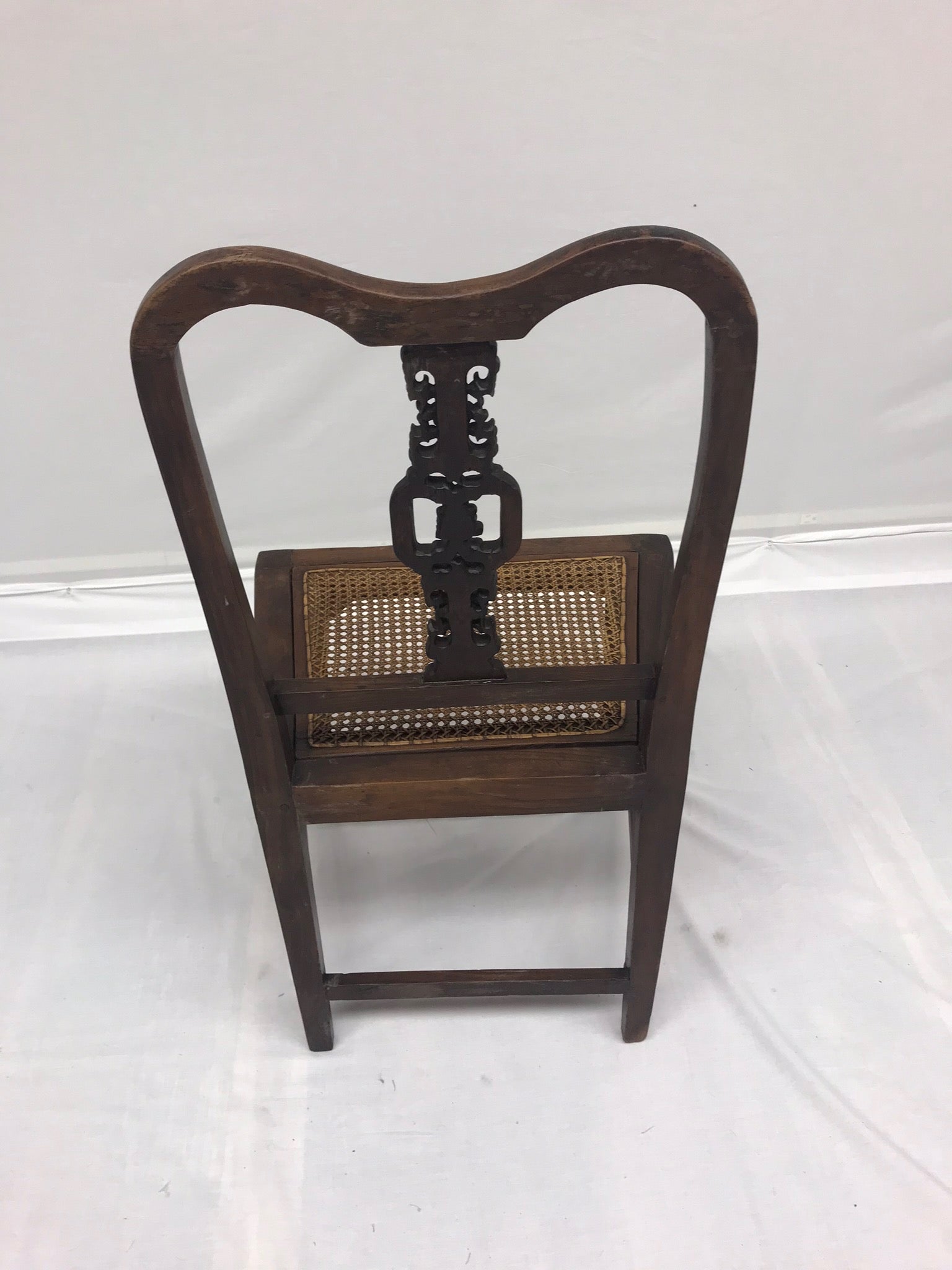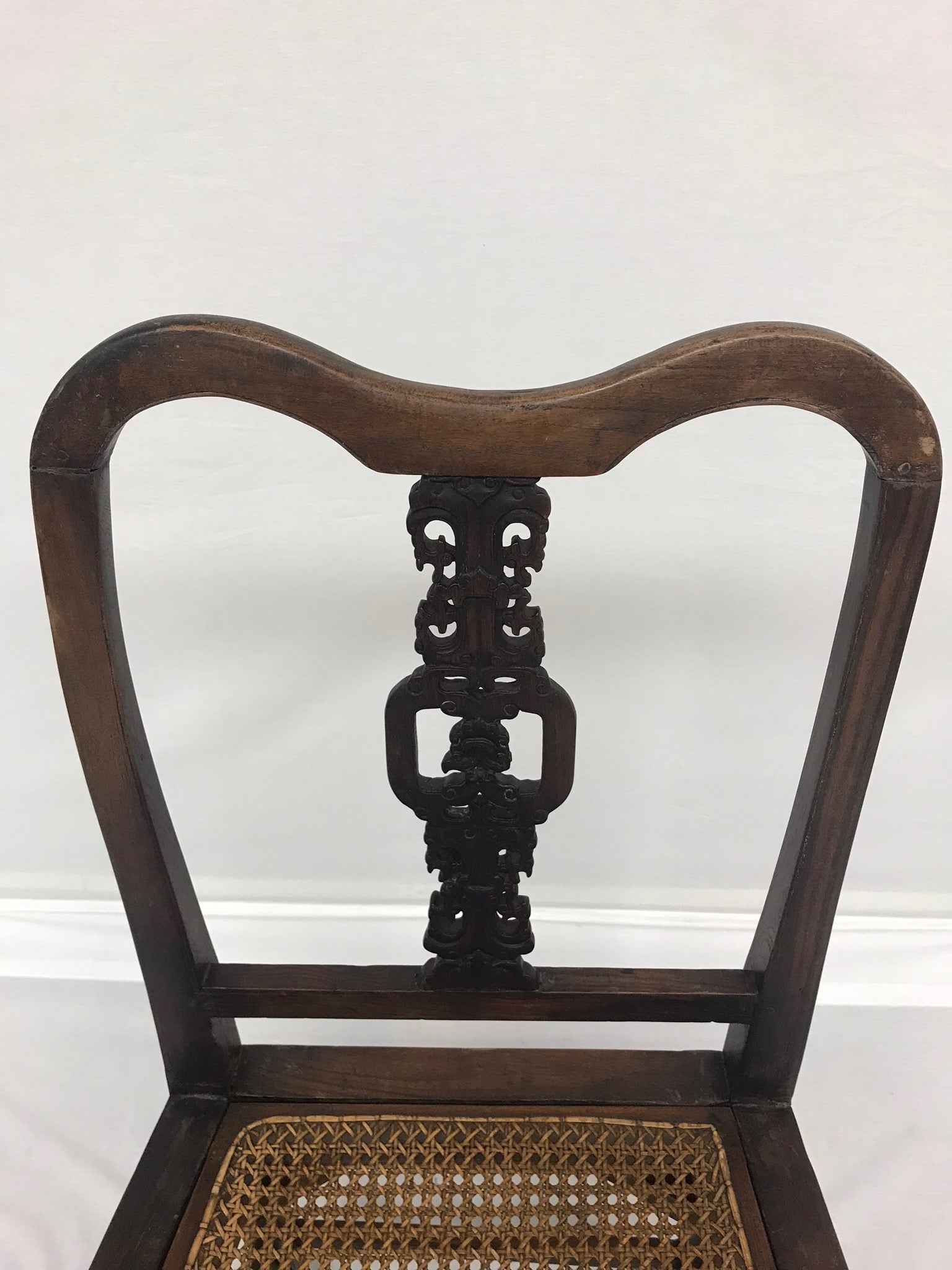 An antique wood Chinese hall or occasional chair with delicious carved-back detailing and a caned seat. Original finish. Hand-woven cane. Place this look on the side of a hall table or the corner of a living room for a seat that delivers retro form and function.