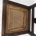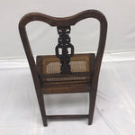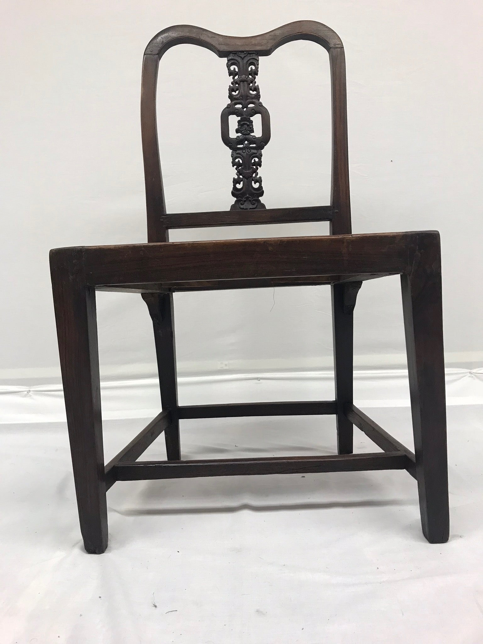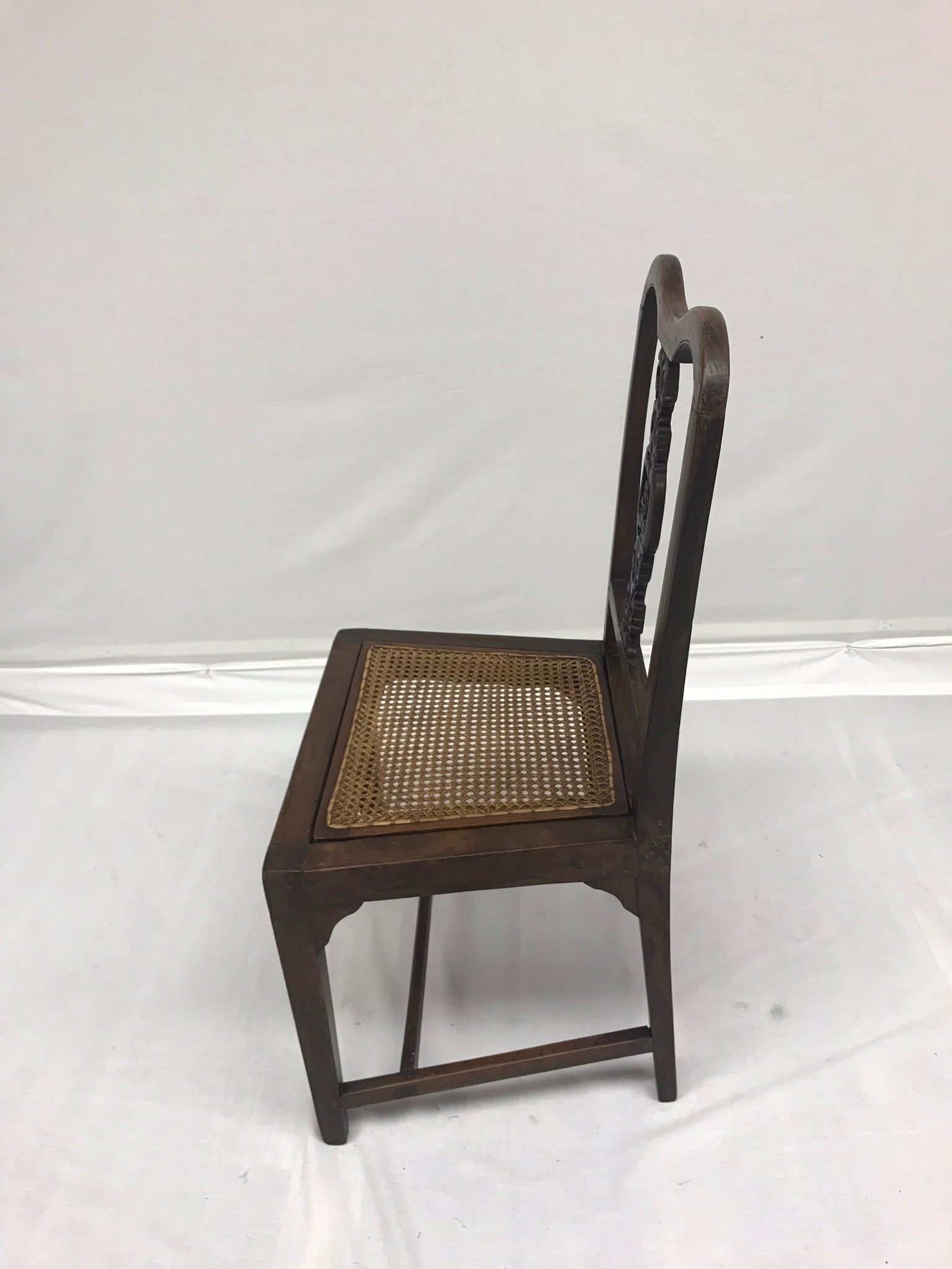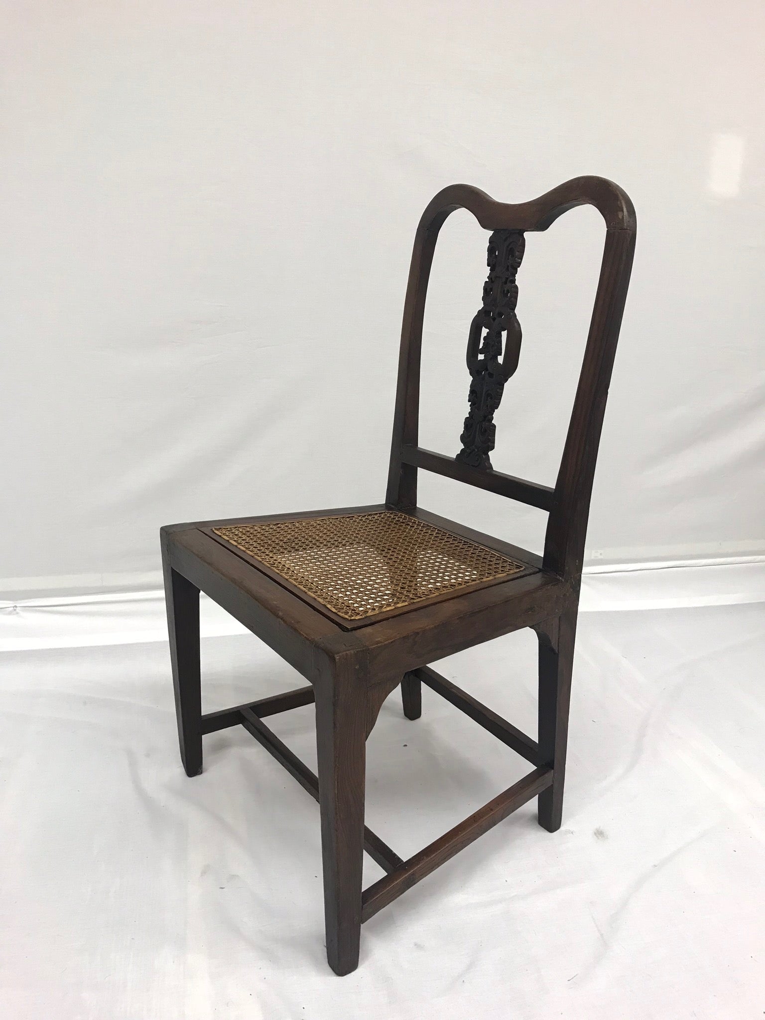 An antique wood Chinese hall or occasional chair with delicious carved-back detailing and a caned seat. Original finish. Hand-woven cane. Place this look on the side of a hall table or the corner of a living room for a seat that delivers retro form and function.