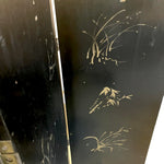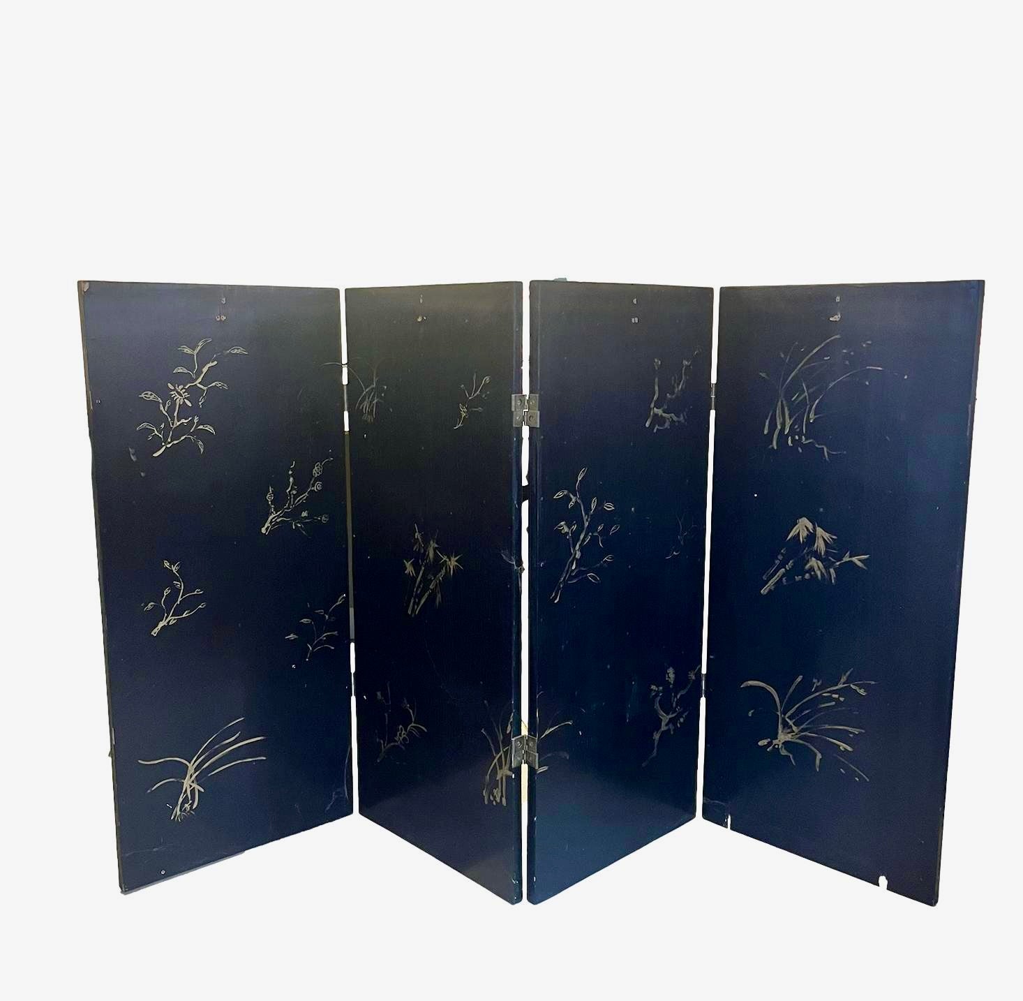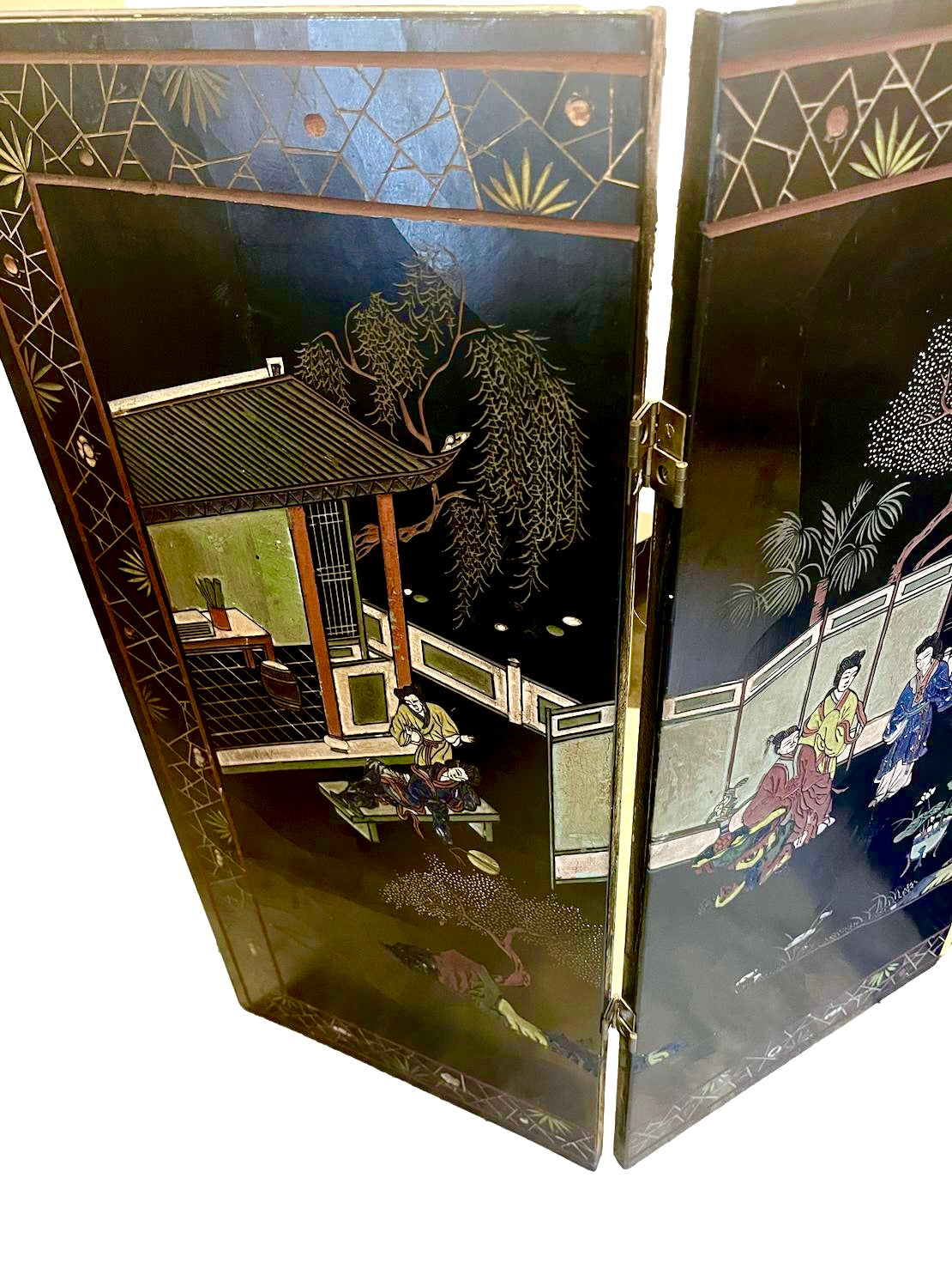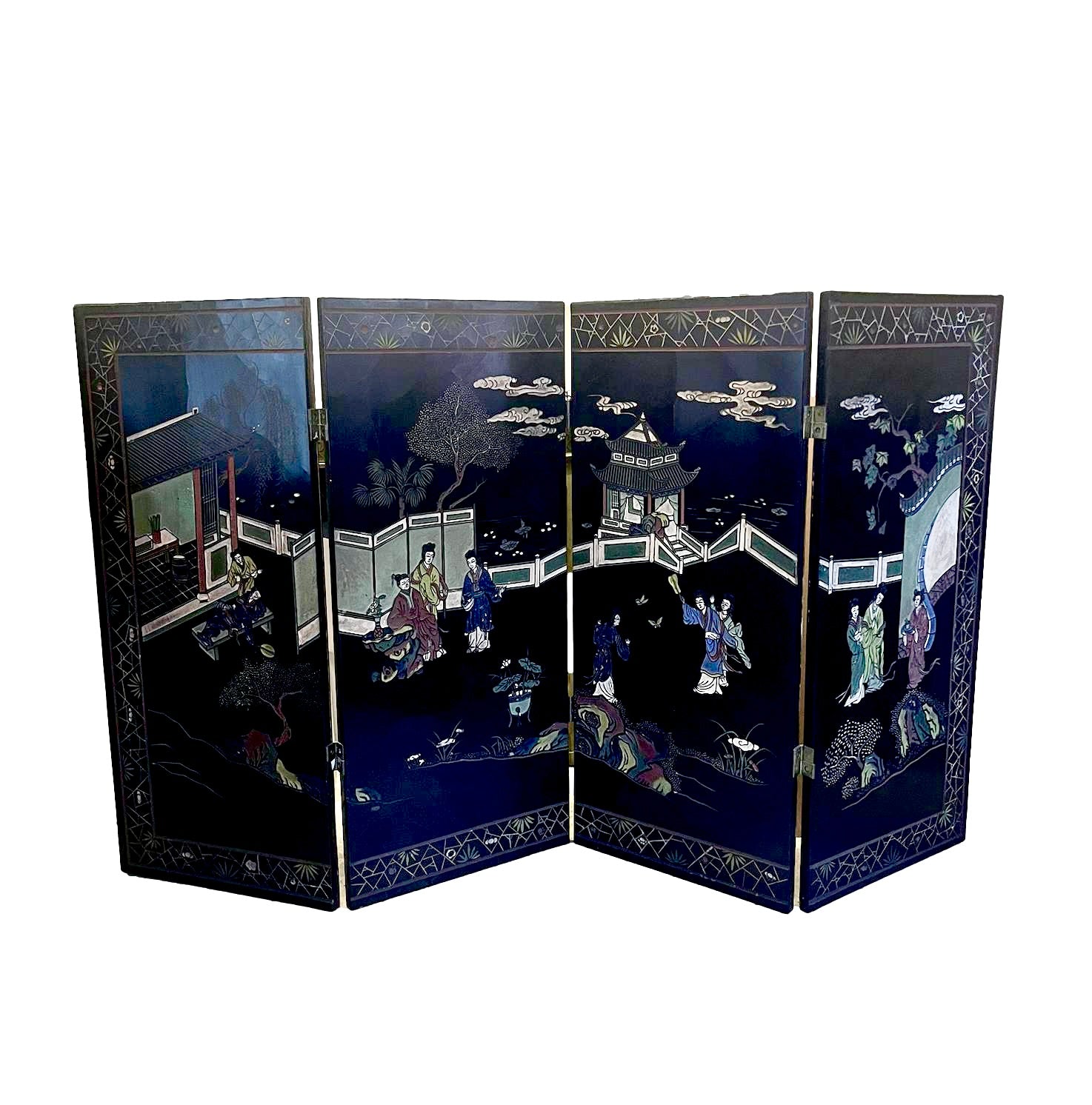 A stunning four-panel, low-slung lacquered Chinoiserie screen with brass hardware that has lived for years in front of the fireplace at the House of Bedlam off season (ie, the summer). The perfect height for hiding the firebox when not in use during the winter. The back features a stunning gilt bamboo motif. Beautifully detailed with pagodas, Asian figures, and fretwork screens dotting a sylvan landscape.