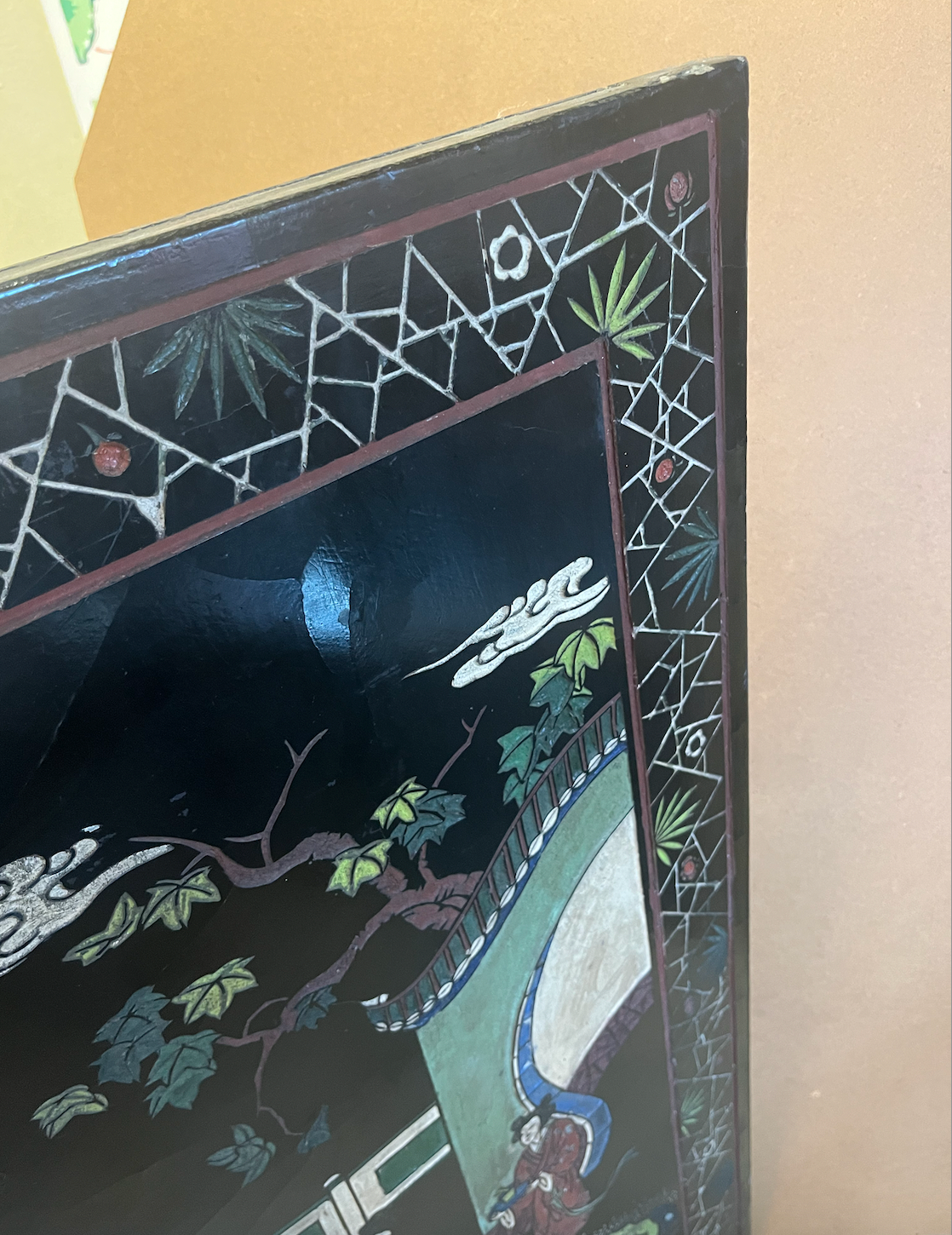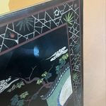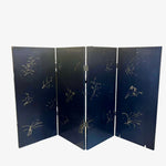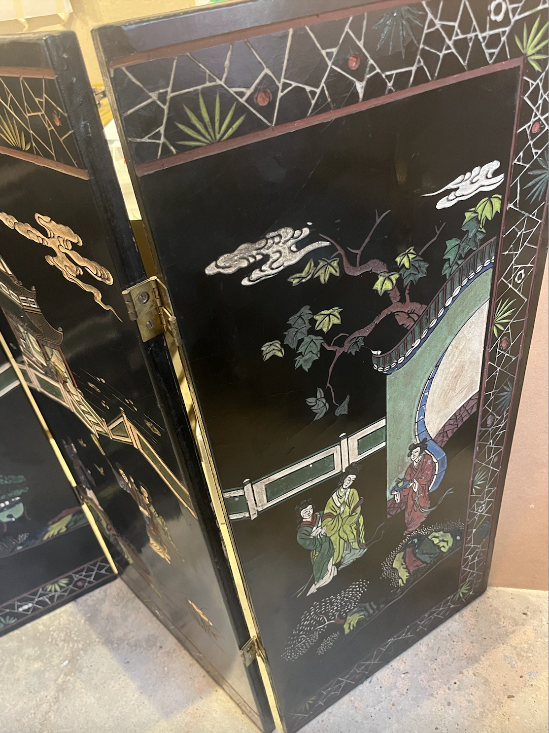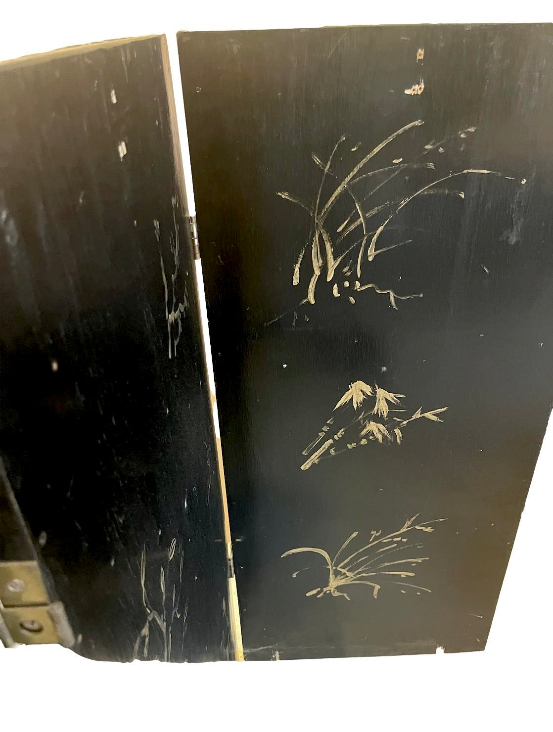A stunning four-panel, low-slung lacquered Chinoiserie screen with brass hardware that has lived for years in front of the fireplace at the House of Bedlam off season (ie, the summer). The perfect height for hiding the firebox when not in use during the winter. The back features a stunning gilt bamboo motif. Beautifully detailed with pagodas, Asian figures, and fretwork screens dotting a sylvan landscape.