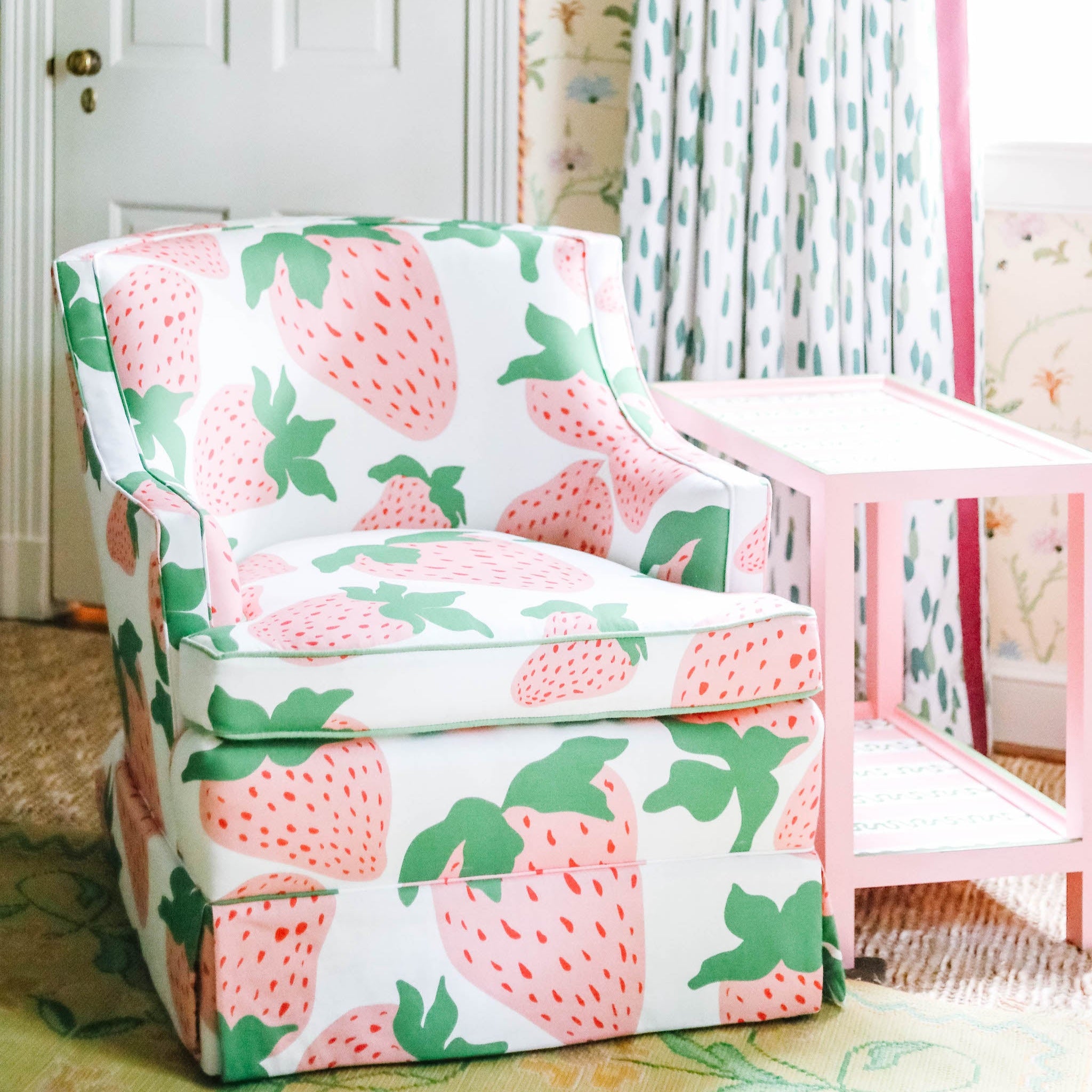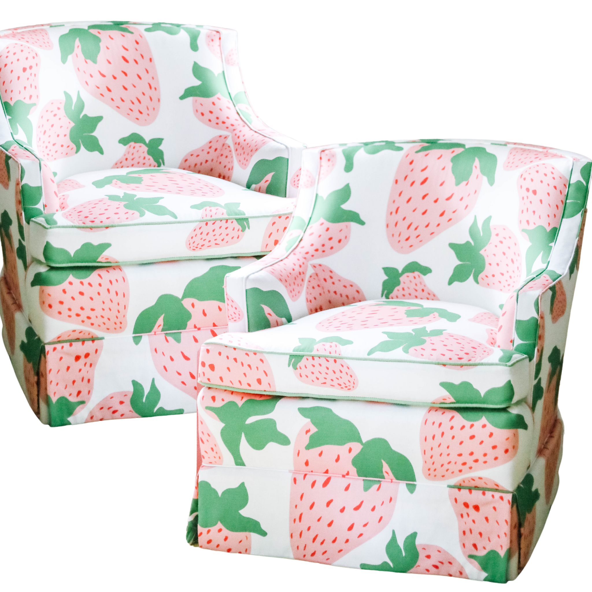 A stunning pair of vintage chairs newly upholstered in the made-in-America Madcap Cottage Garden Party Strawberry fabric designed by Team Madcap to celebrate a spirit of eternal Summer. Super comfortable. Timeless. Fresh. And just picked. Settle into the sublime. And remember that the Garden Party Strawberry pattern is also available as a wallpaper, a shower curtain, and so much more!
