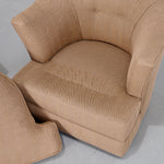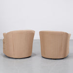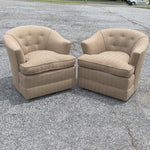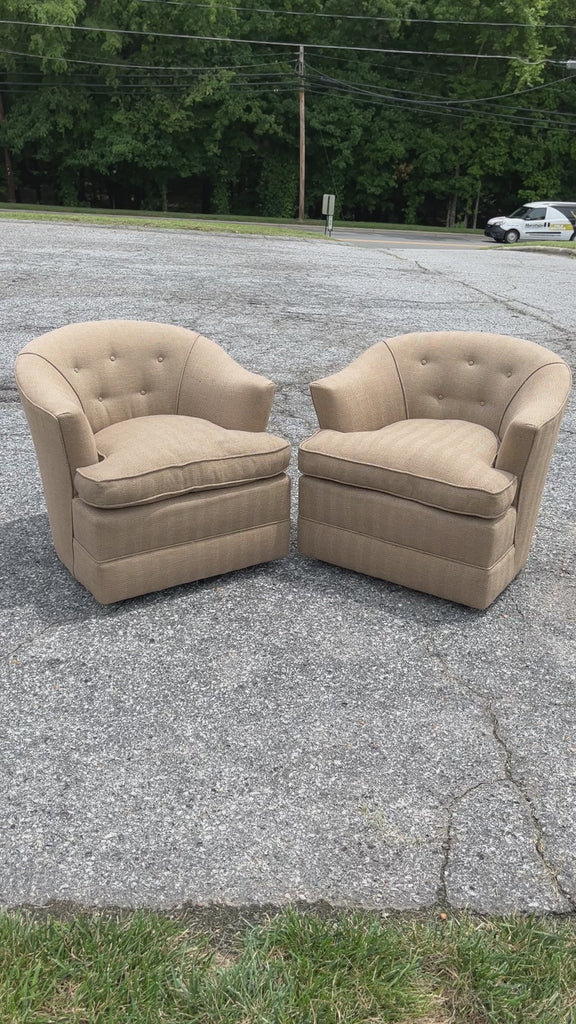A delightful pair of overstuffed Mid-Century vintage swivel chairs with sleek silhouettes that would look amazing when flanking a sofa in your living room. Down wrapped seat cushions. Skirted.