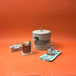 Dimensions: 8" Diameter x 9"H (ice bucket)/3 1/4" Diameter x 4.5"H (glasses)/4 1/4" Square x 2"H (coasters set)