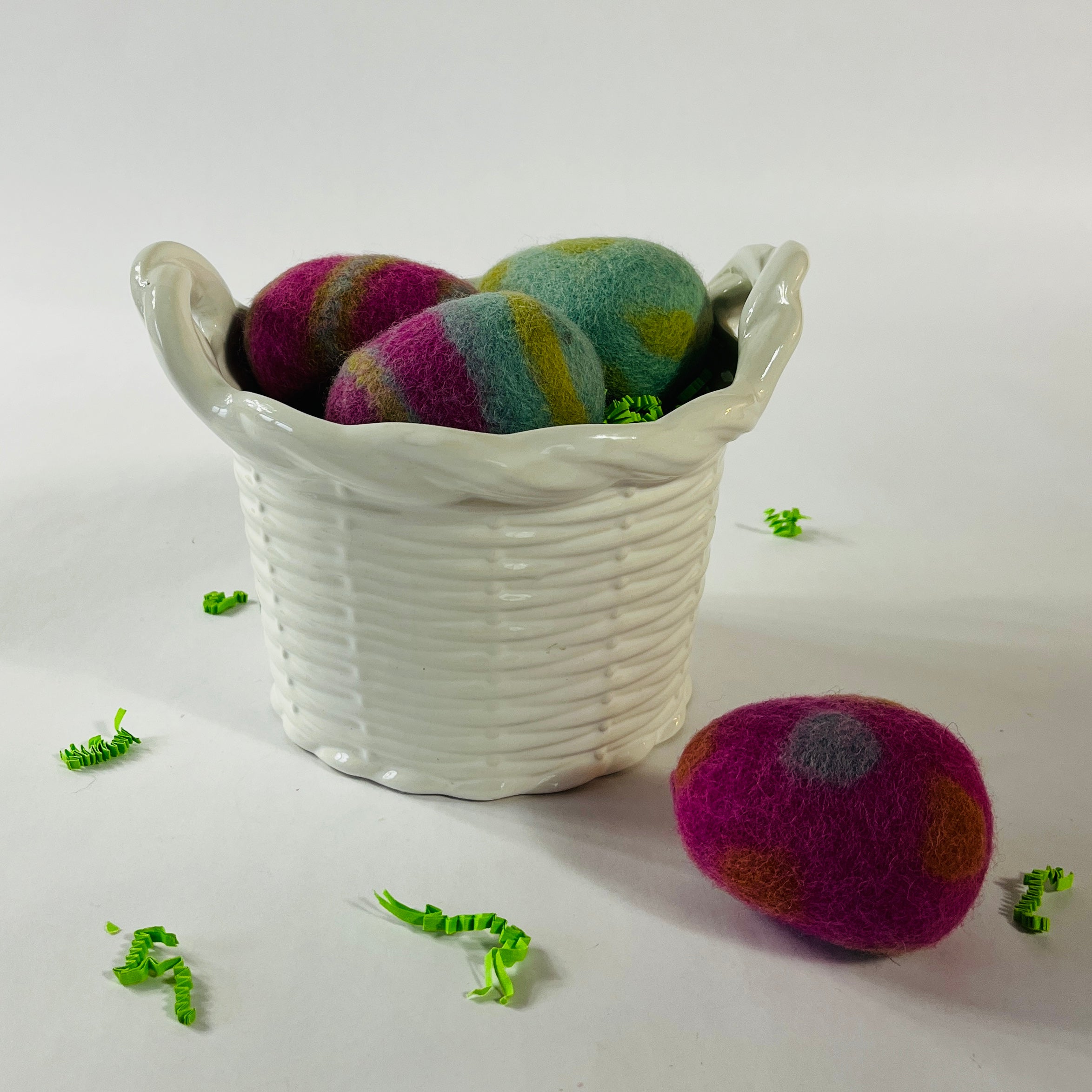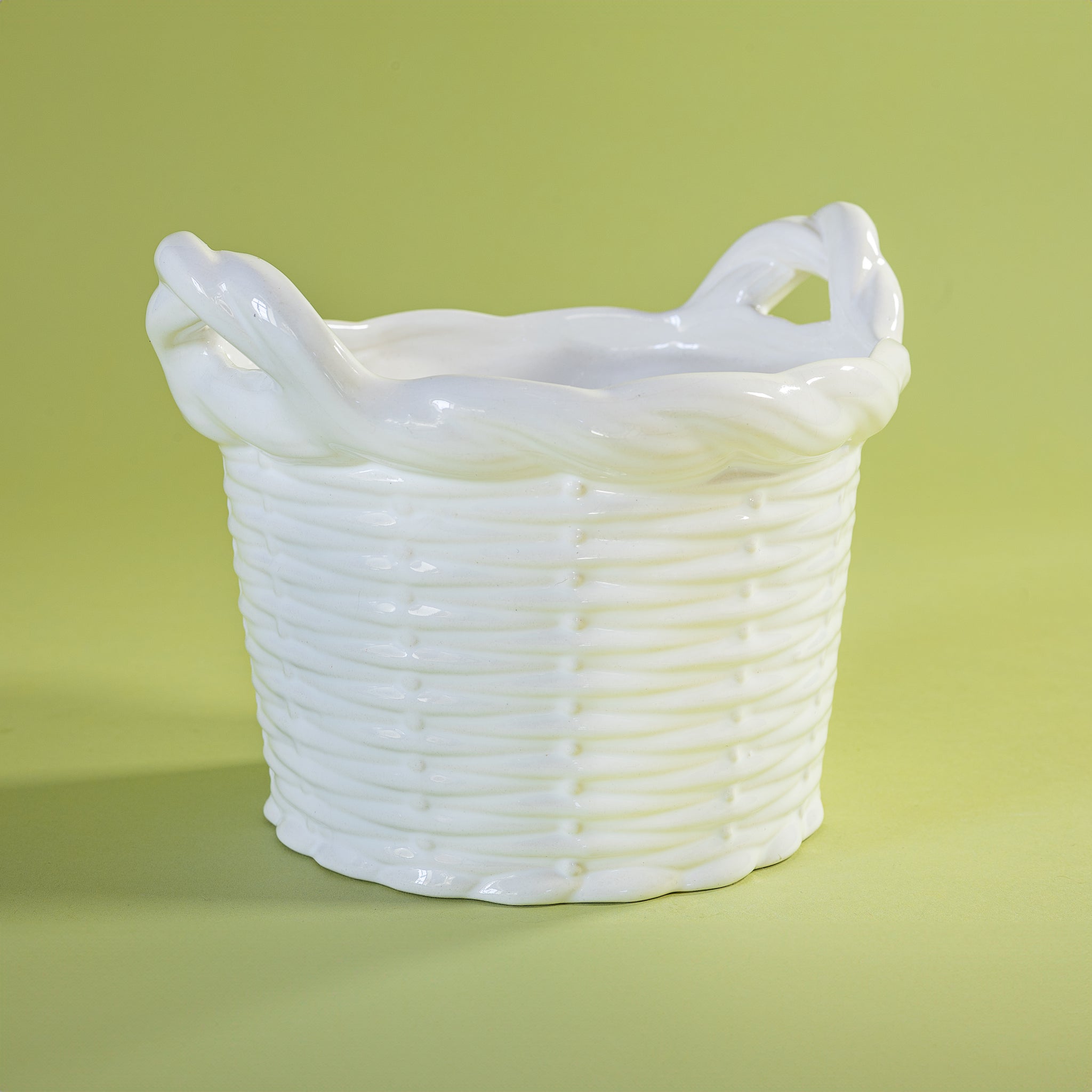 A charming white Italian ceramic basket with handles, the perfect table centerpiece. Fill the basket with delightful treats.