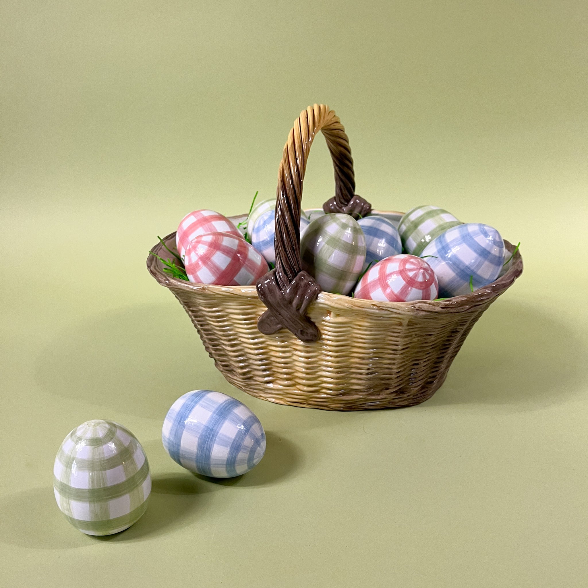 Large brown ceramic basket with woven texture and handle, styled with decorative eggs and green filler