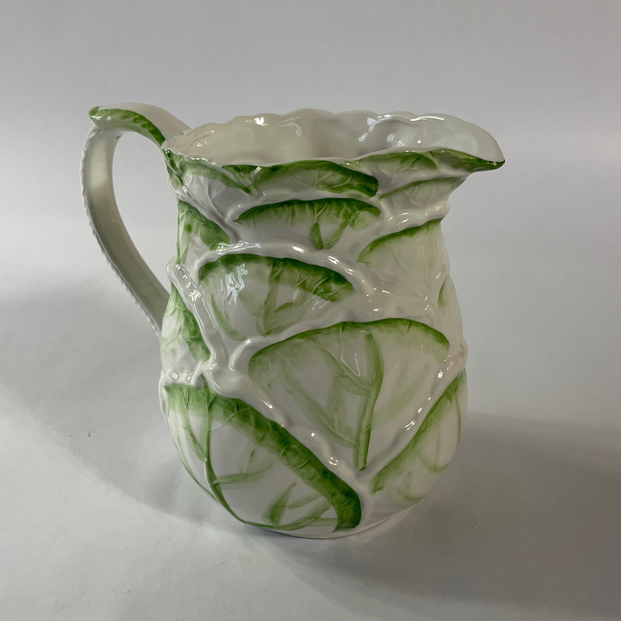 Vintage ceramic pitcher with sculpted leafy design and green hand-painted details