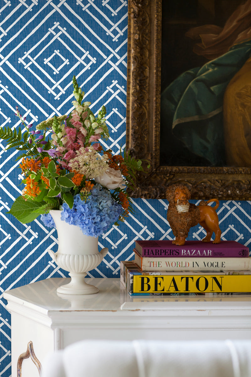 Timeless, trellis-patterned Island House wallpaper invites you to an exotic getaway where languid cocktail parties spill into late-night disco dancing. An ocean blue-hued background with an embossed grass cloth-like texture is a new neutral that packs a punch so never be boring again.