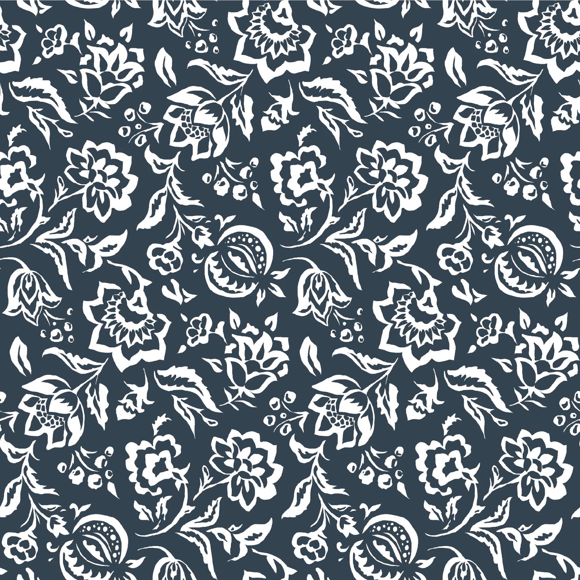Our Hampton Court Navy Blue wallpaper pattern is the perfect mix of exotic elements (think lotus blossoms and pomegranates) that come together swimmingly in this modern block print.
