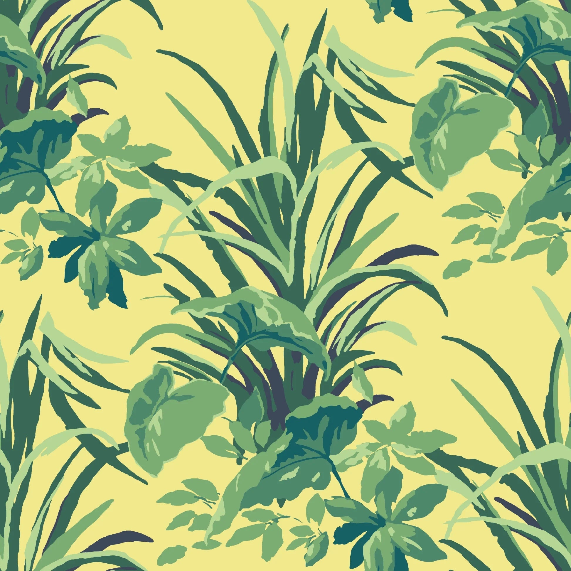 Our Jungle Road palm Summer Yellow wallpaper pattern is a nod to the easy elegance and layered sensibility of a relaxed island escape tucked into a balmy palm grove.