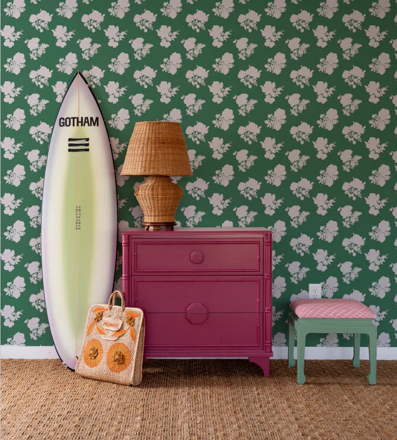 The Swans Island Silhouette Forest Green wallpaper pattern is a tip of the hat to a sun-kissed garden perched high above a cliff on the rocky coast of Maine but silhouetted for a contemporary spin. Fresh. Inviting. Modern.