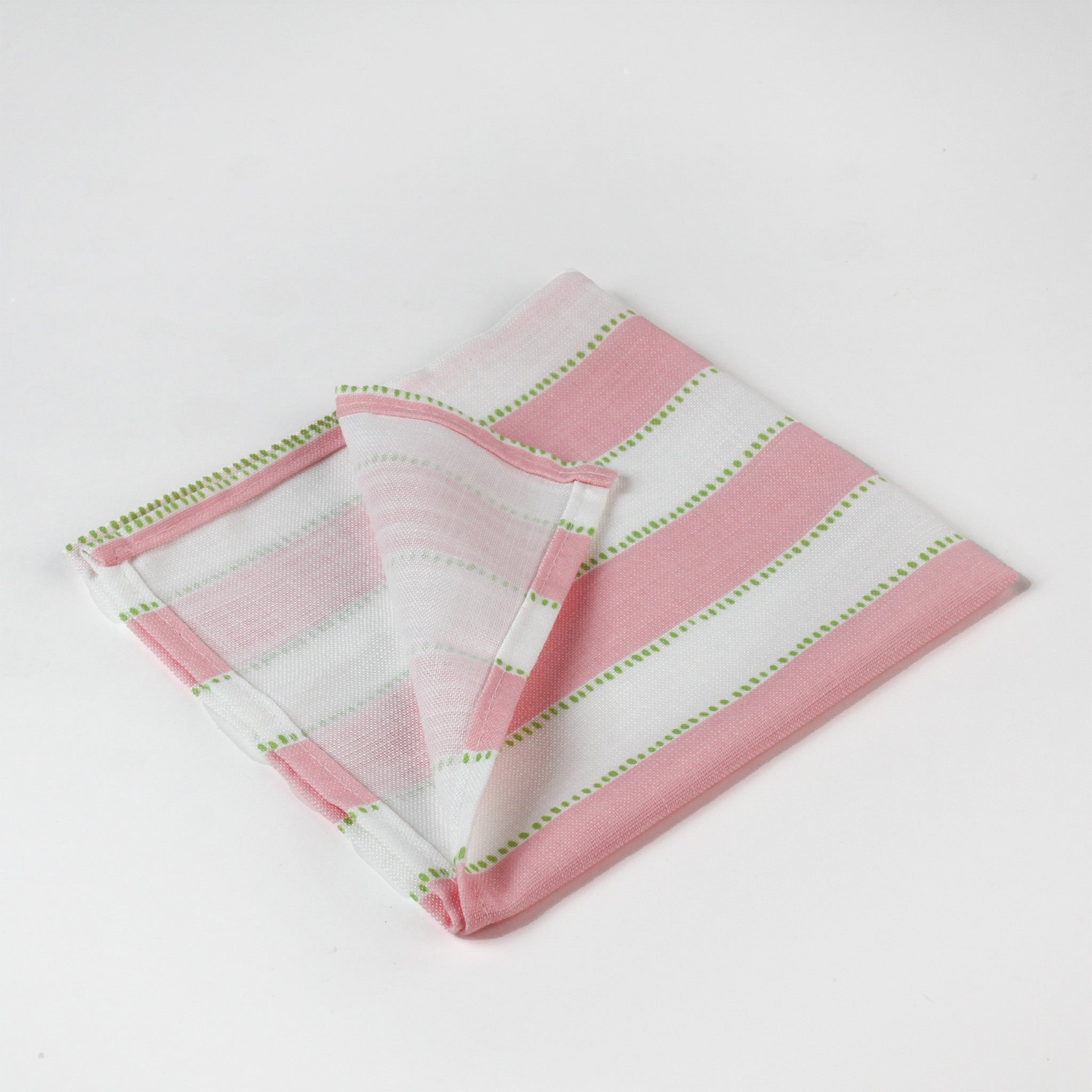 a pink striped napkin with an additional light green dotted stripe