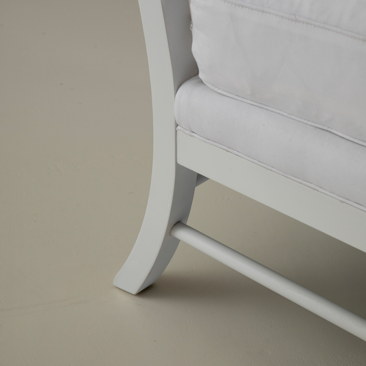 Inspired by an English antique picked up in a charming Cotswolds market town, the Think of England armchair nods to the past with eyes firmly fixed upon the future. Overstuffed seat- ing. Perfect to place in a bedroom, living room, or den. Frame crafted in Italy. Upholstered in High Point, NC. Available in six standard lacquer finishes or any color you want.
