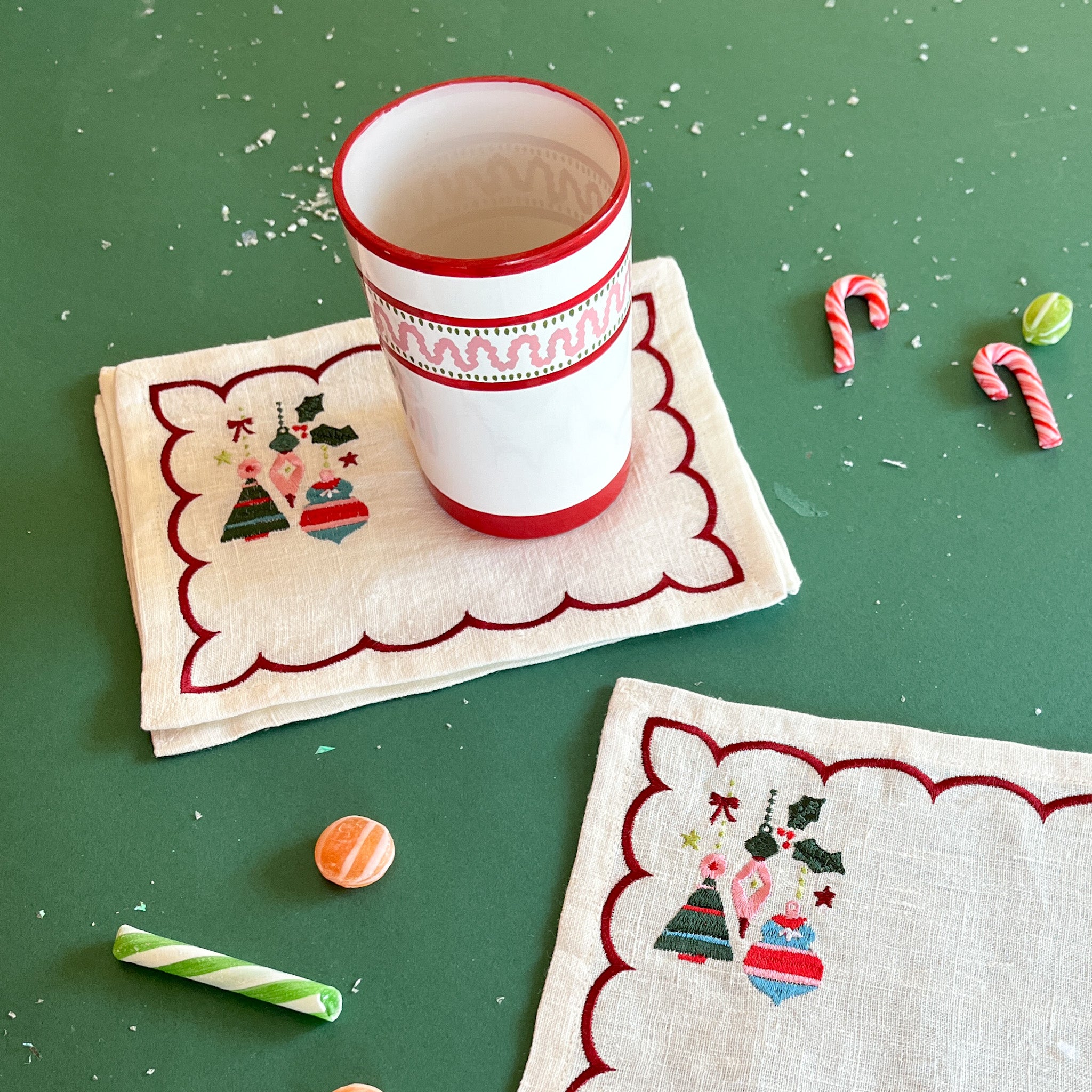 Darling Ornaments embroidered linen Christmas cocktail napkins with red striped cup.