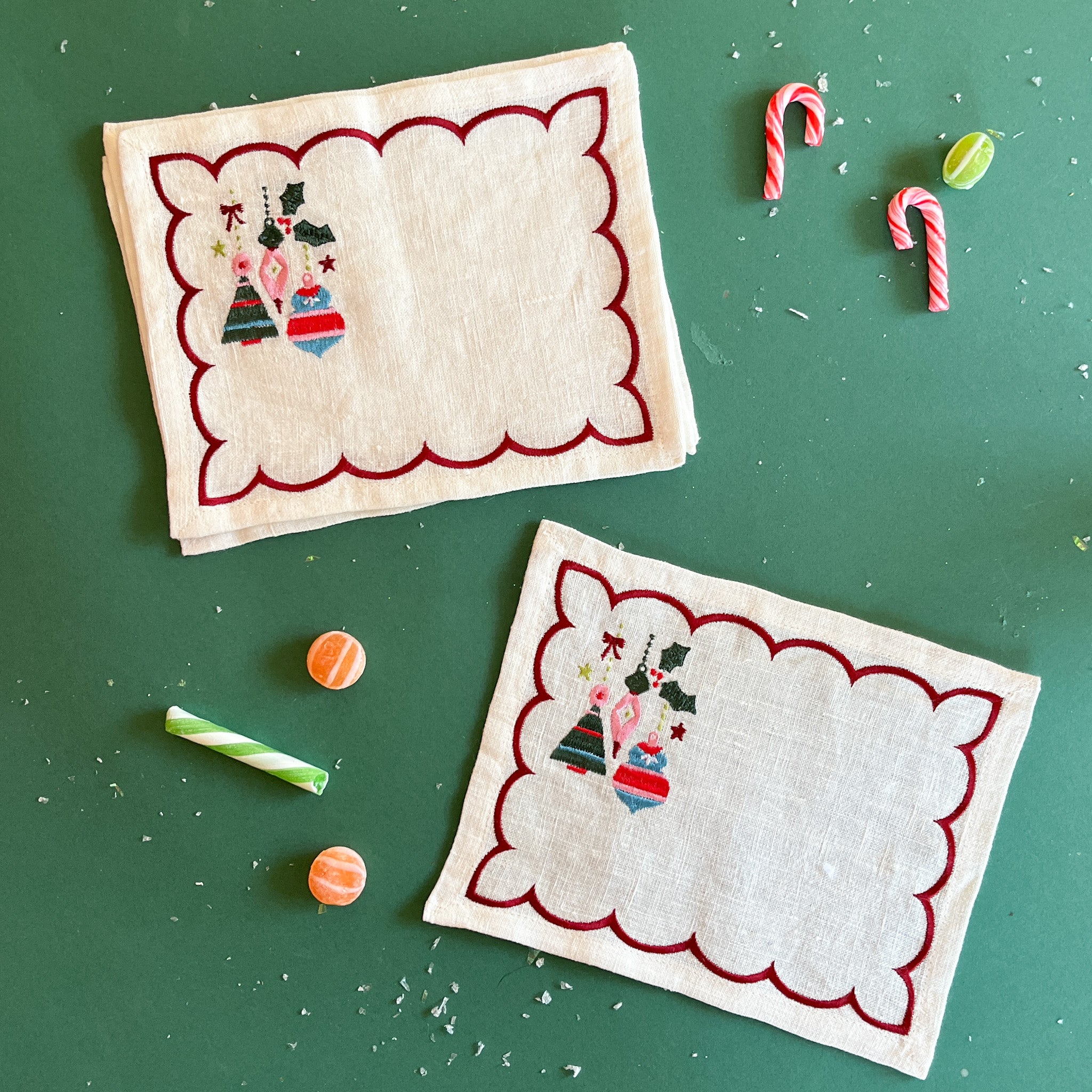 Detail view Darling Ornaments embroidered Christmas cocktail napkins