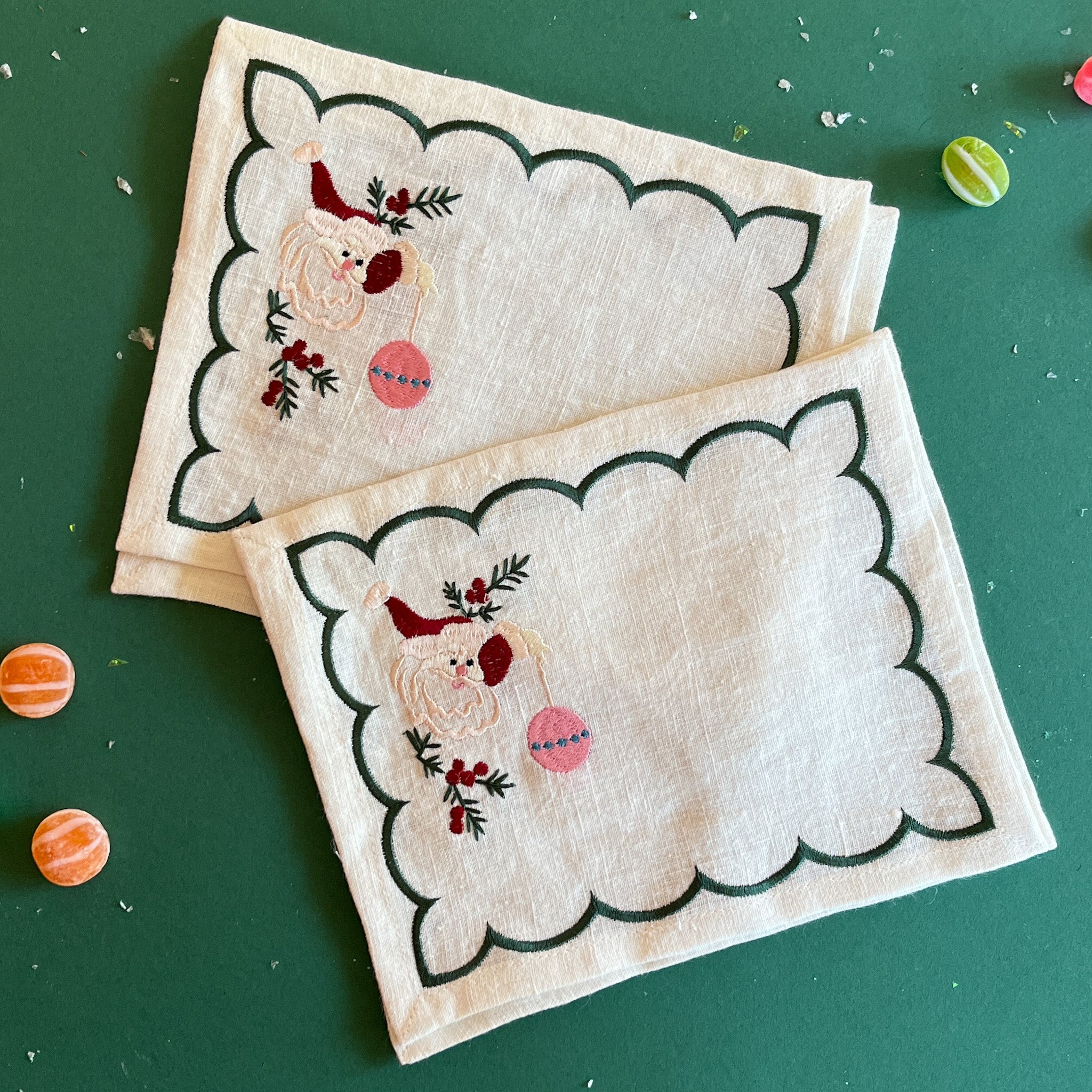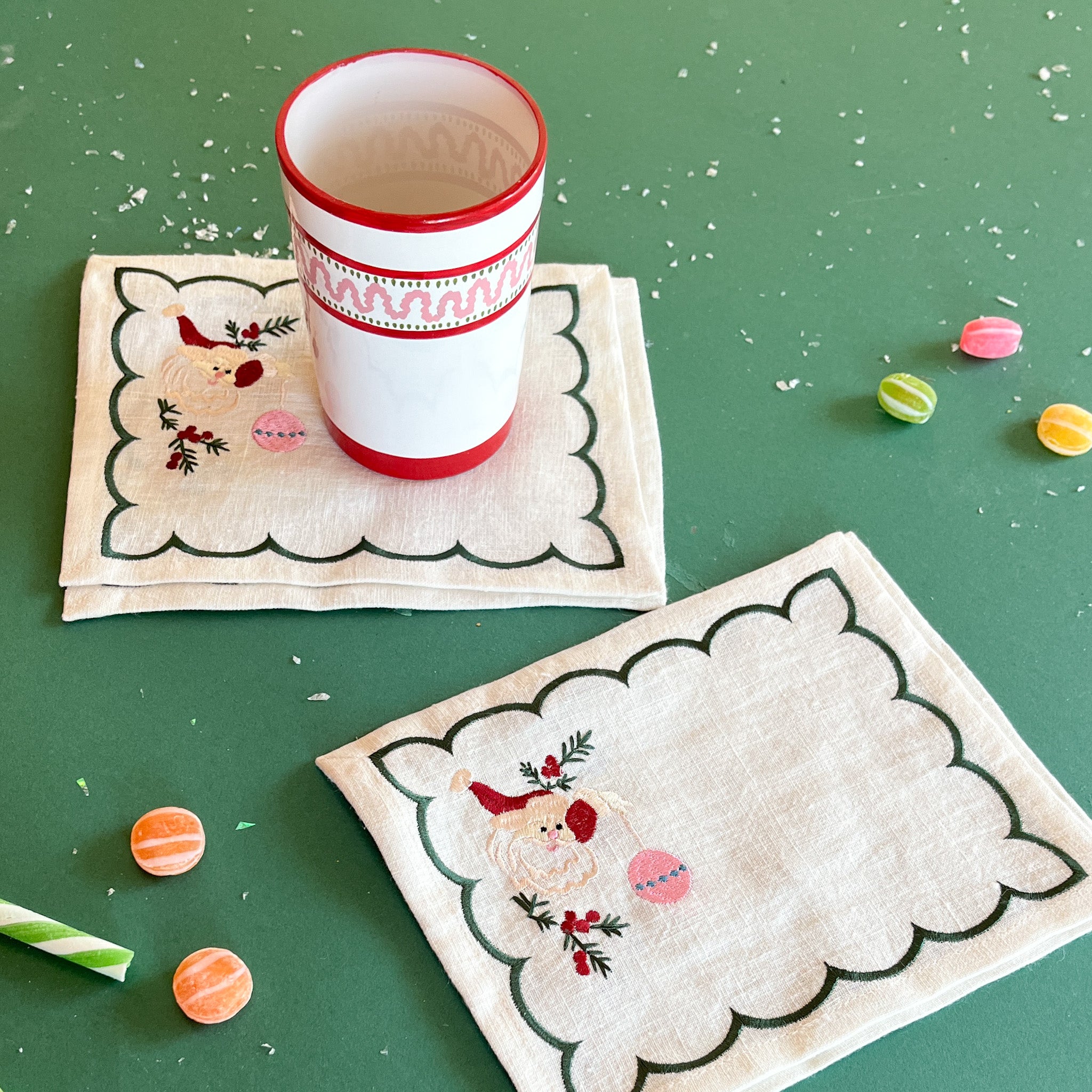 Made by hand in India to the Madcaps original design, these Jolly Santa embroidered linen Christmas cocktail napkins will certainly be the life of your soirees. Beautifully finished and elegant, these linen "lookers" are the perfect host/hostess gift or stocking stuffer.