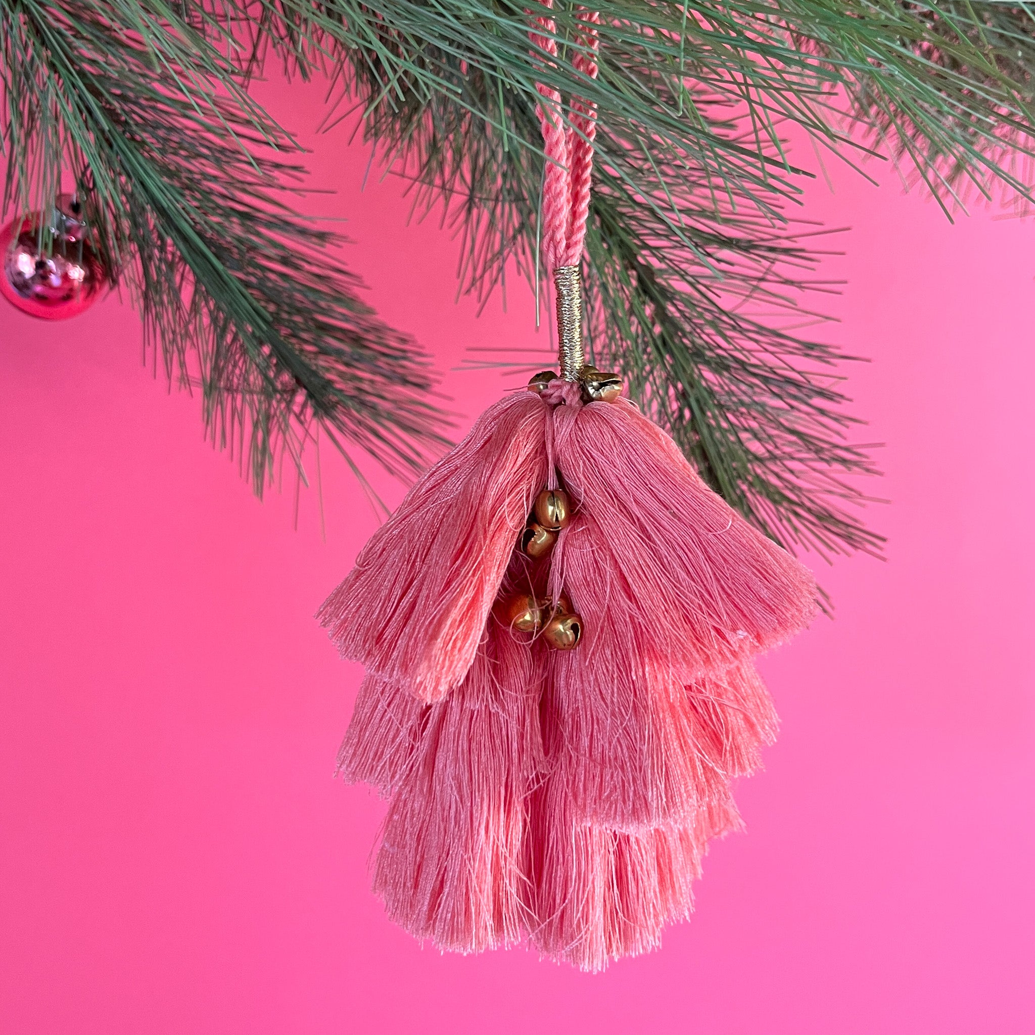 Add an exotic taste of glamour to your Christmas tree with these pastel-hued tassel chinoiserie Christmas ornaments embellished with tiny brass bells and brass wire details. Absolutely unique and special for a chinoiserie vibe!