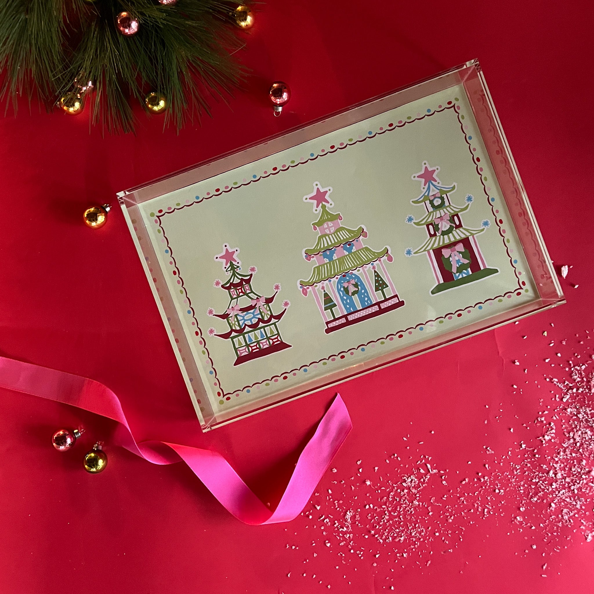 Madcap Cottage clear acrylic trays are inspired by the gents original artwork. Available in two sizes with integrated handles. Here, our Christmas Pagodas sit on a field of green trimmed with a red scalloped border and colorful dots. The smaller makes for a perfect petite tray; use the larger for serving tea or snacks. The perfect Christmas gift for a host or hostess. A Madcap Cottage exclusive.