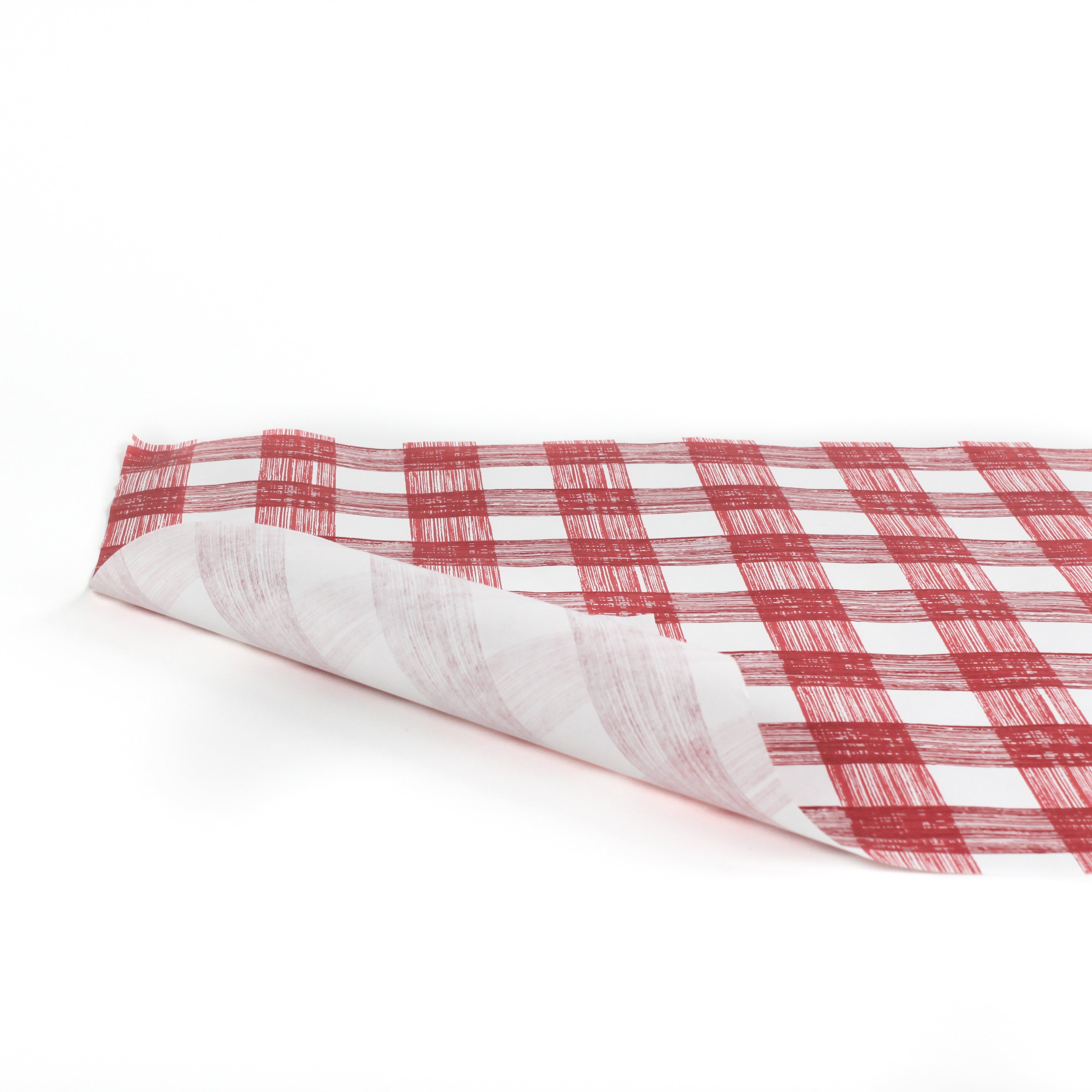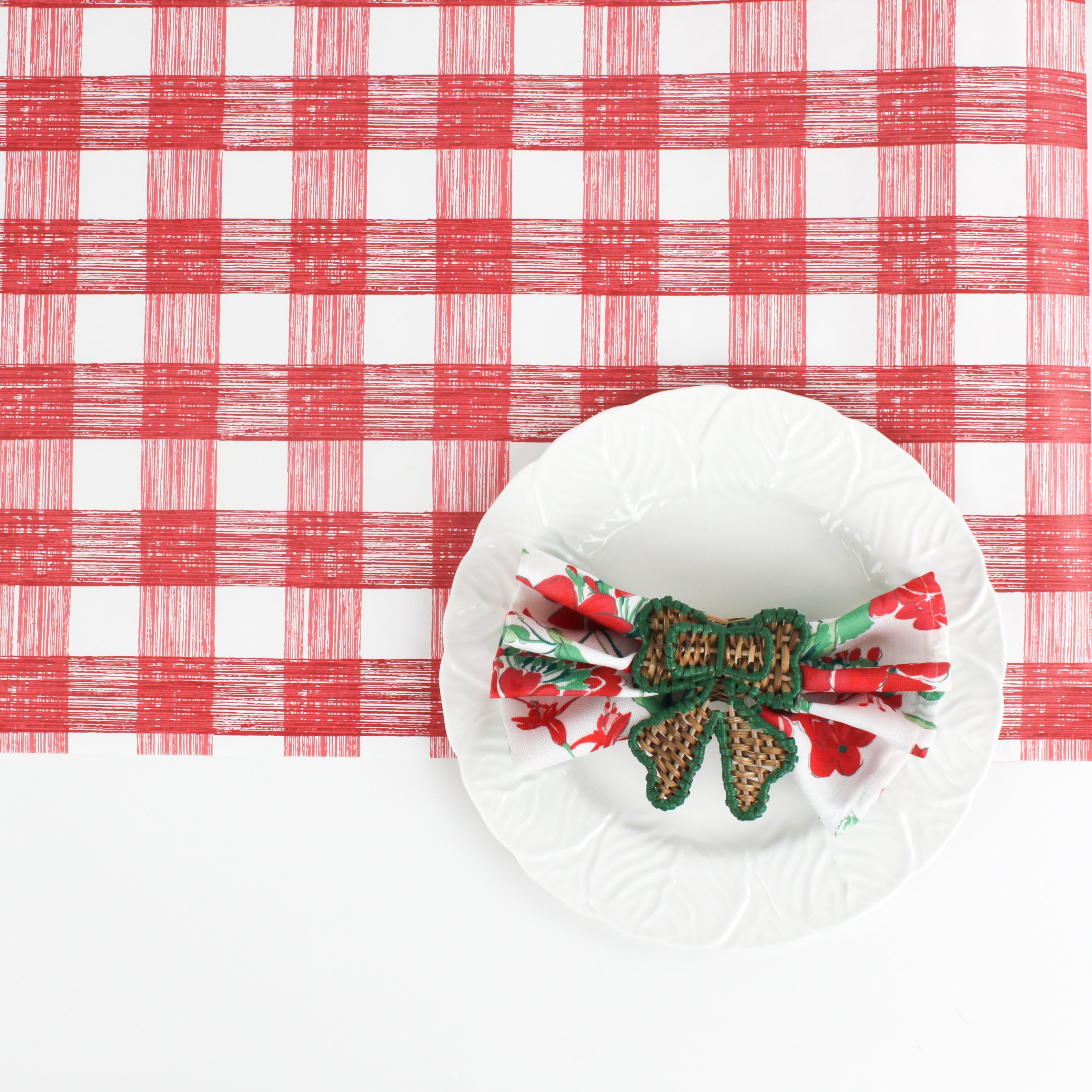 a ceramic plate on top of a Gin Lane Red Gingham Paper Table Runner on a white background