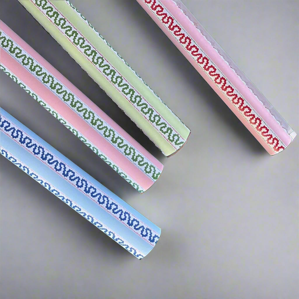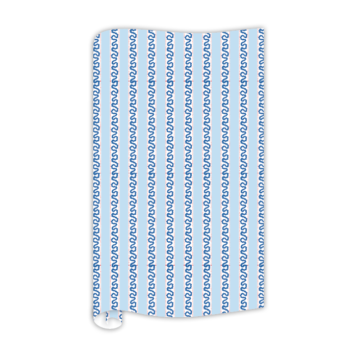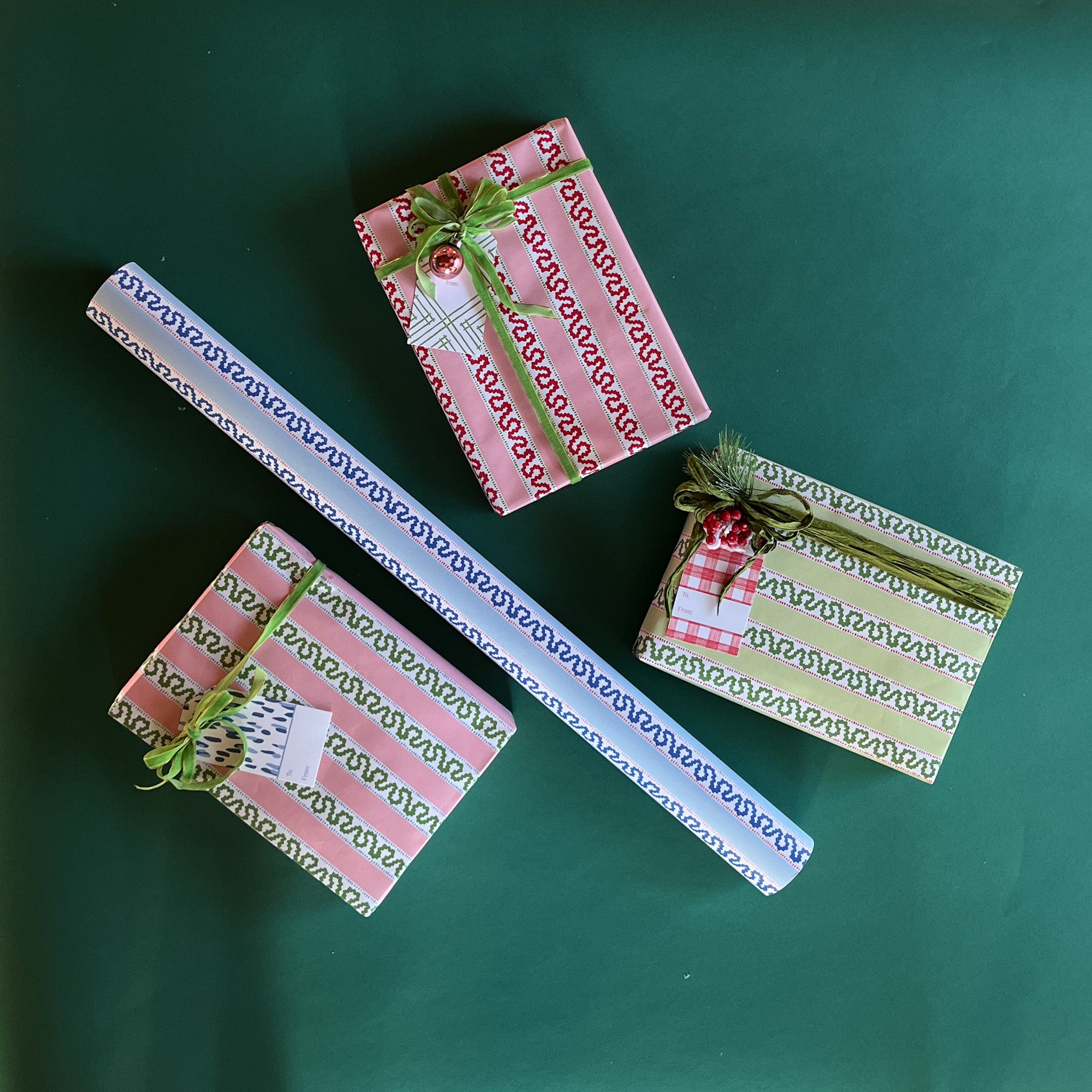 Our iconic Harbor Trail Blue pattern will whisk you off to the easy-breezy climes of Palm Beach where the living is easy and the sun shines down upon a timeless wonderland. Says John, "I sketched this pattern one afternoon while lunching at our favorite Renato's restaurant in Via Mizner with fountains tinkling in the background. I hope this made-in-America Christmas gift wrapping paper delivers that spirit of a magical afternoon savored under a luxurious canopy of pink bougainvillea."