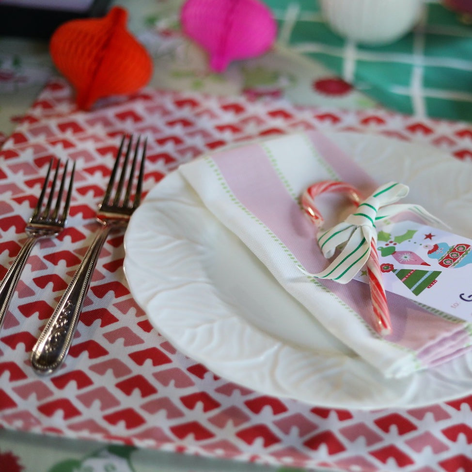 Lifestyle shot of Old Jaipur red cloth placemat with a candy can and napkin resting on a plate with two forks.