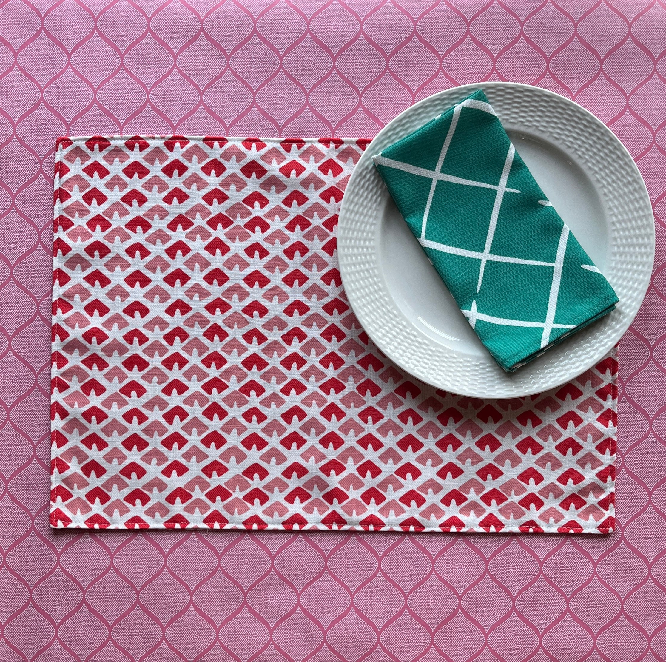 Old Jaipur red cloth placemat with a white plate and napkin resting on it.