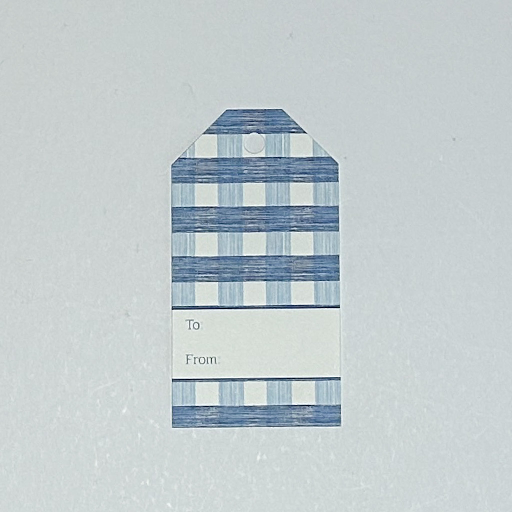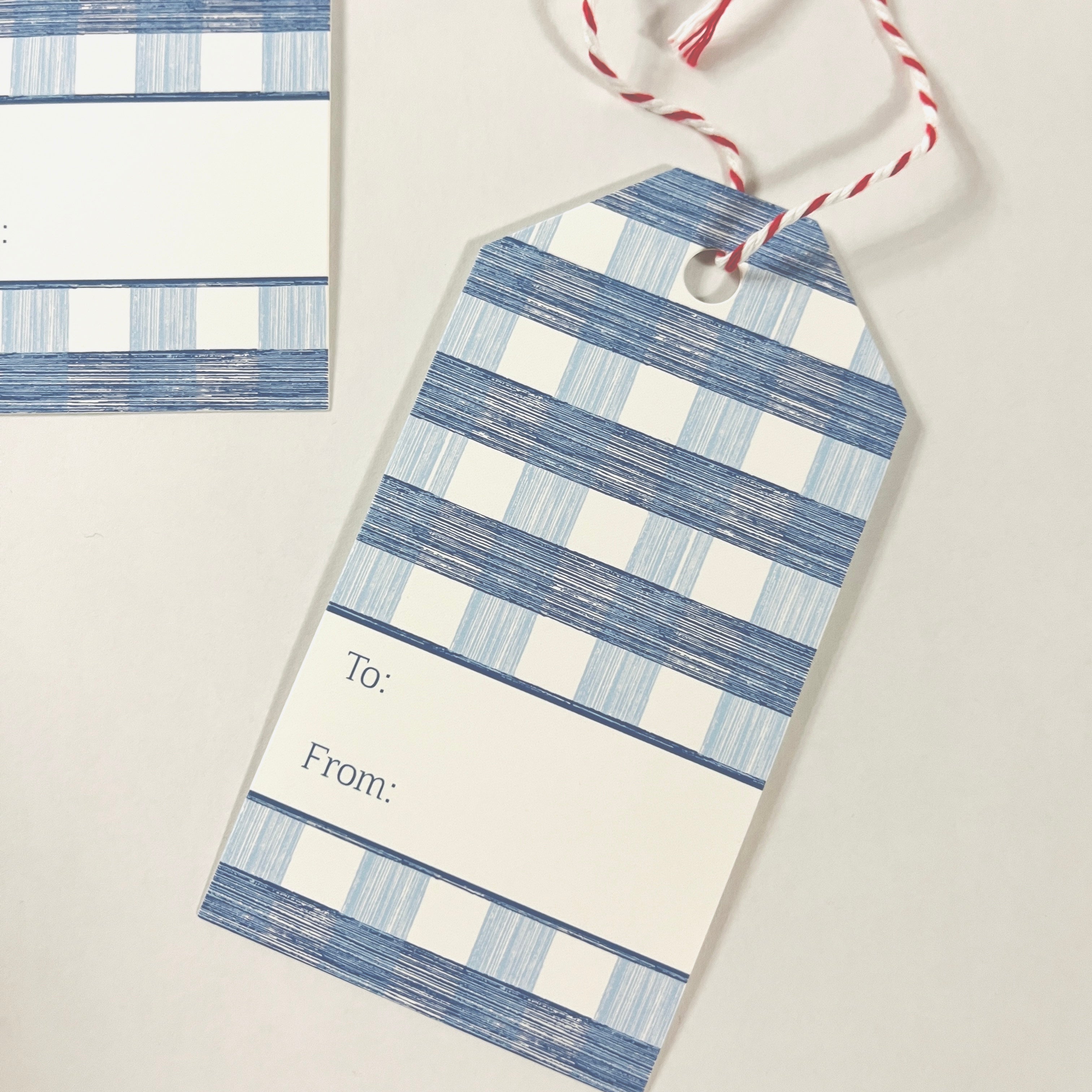 The Madcaps used to live in the glittering Hamptons where Jason Oliver was the editor of a local magazine, and the gents were inspired by the classic American good looks of the homes upon Gin Lane in Southampton. Here, Pool Blue Gin Lane delivers a classic gingham pattern upon made-in-America gift tags. Full design on front with space for personalization on back. Printed on sturdy card stock with hole drilled for ribbon or string. Each pack of ten cards comes with string for tying gift cards to packages. A Madcap Cottage exclusive.