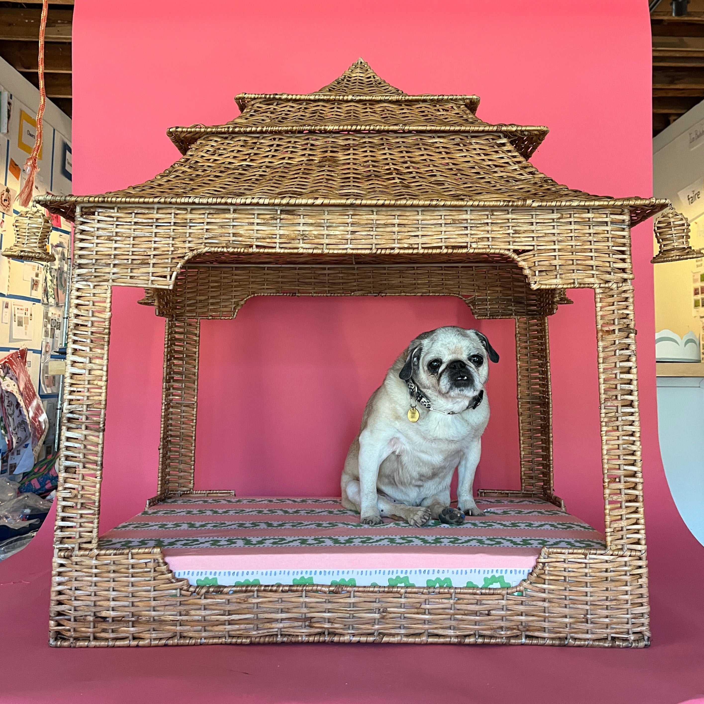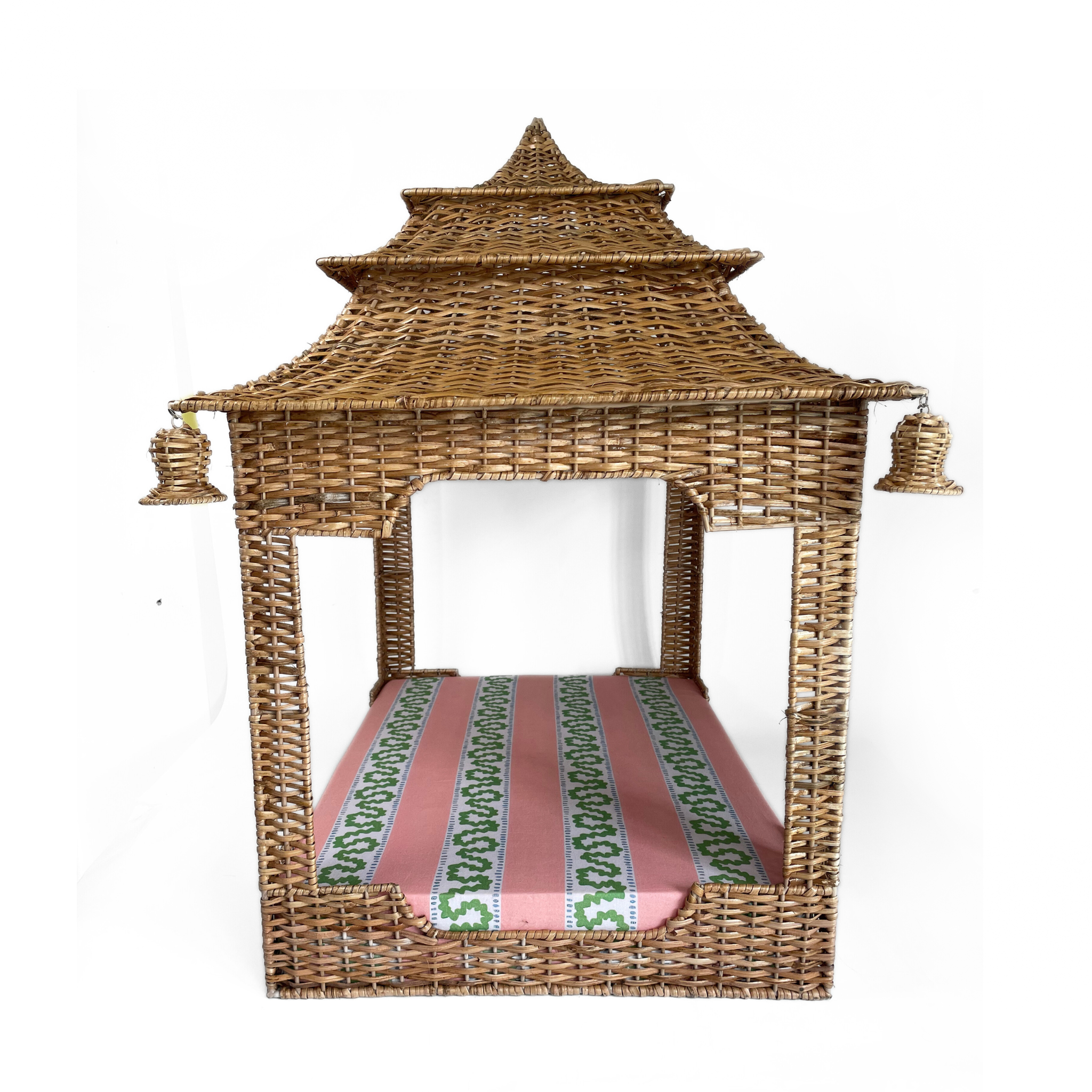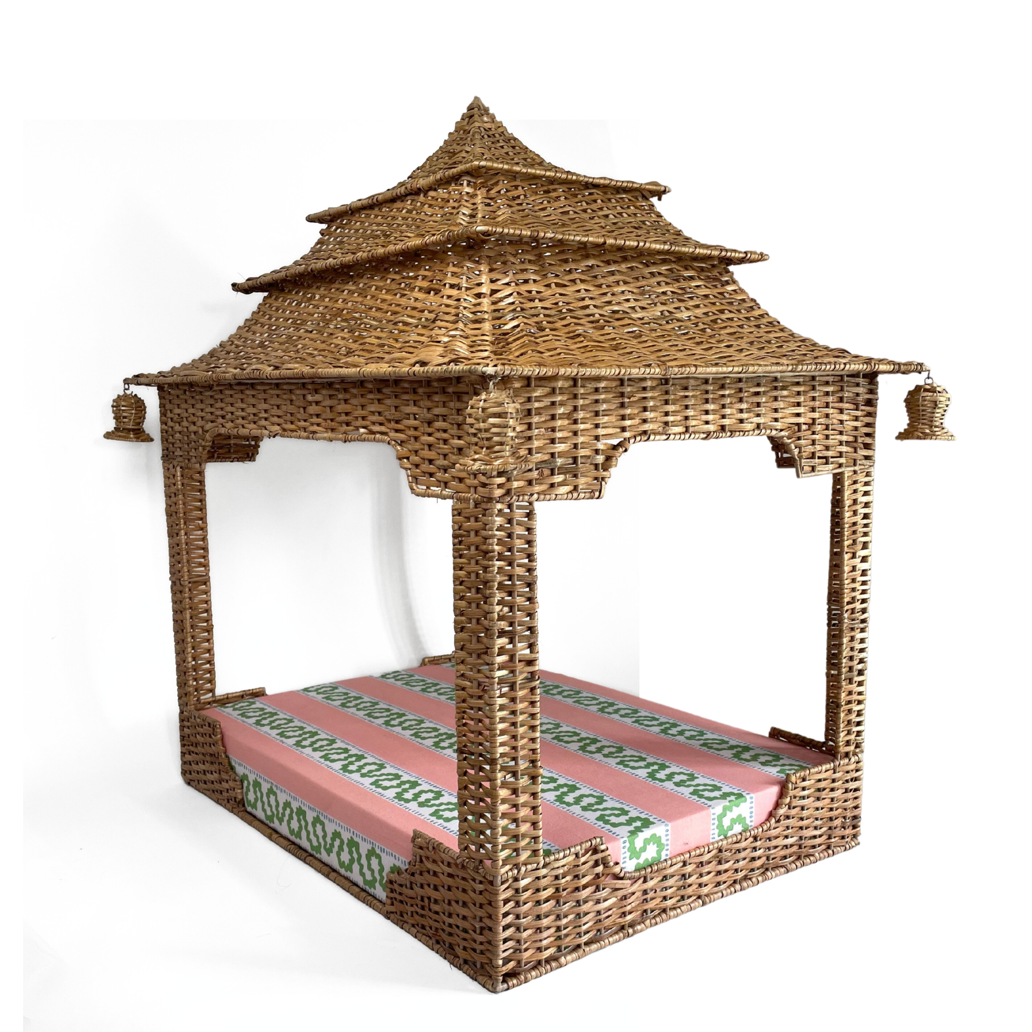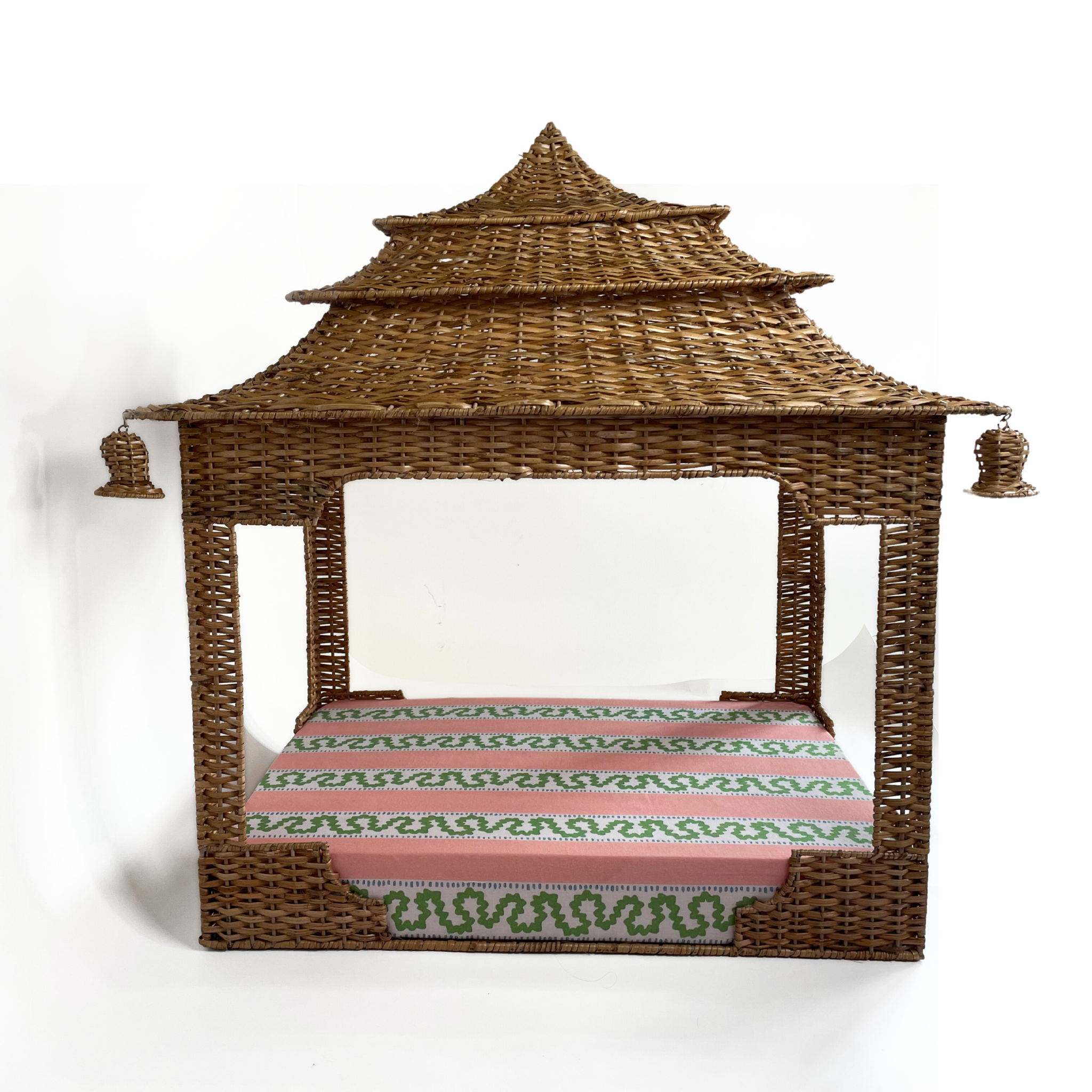 A Chinoiserie-chic, handmade rattan pagoda dog bed is a thing of glory. Based upon Madcaps original design, this stunning pagoda dog bed features hanging bell shaped ornaments and a comfortable pillow wrapped in Harbor Trail Pink fabric that finishes the look. This pagoda wicker dog bed is a Madcap Cottage exclusive.