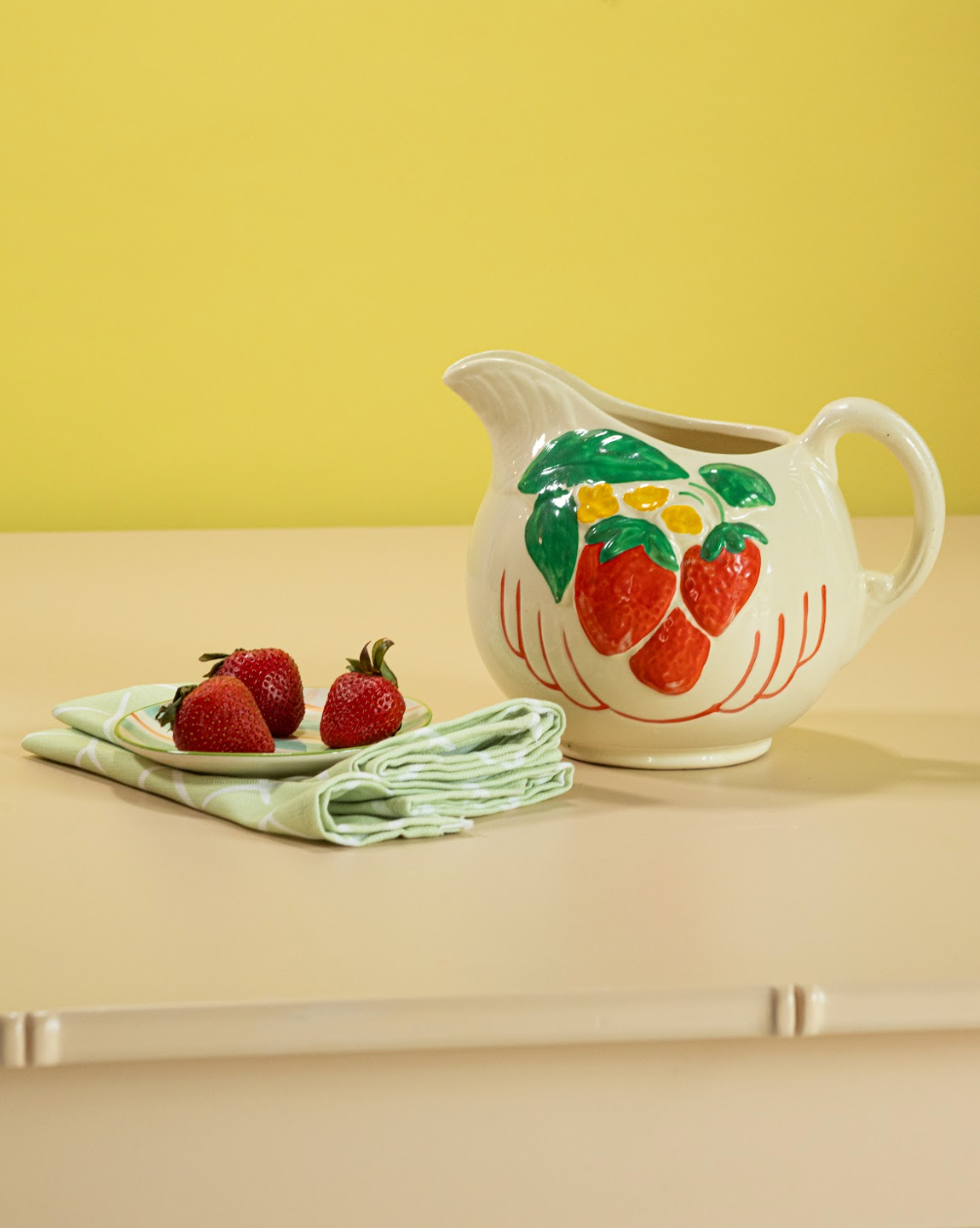 A white vintage strawberry pitcher with strawberry motifs decorating the side