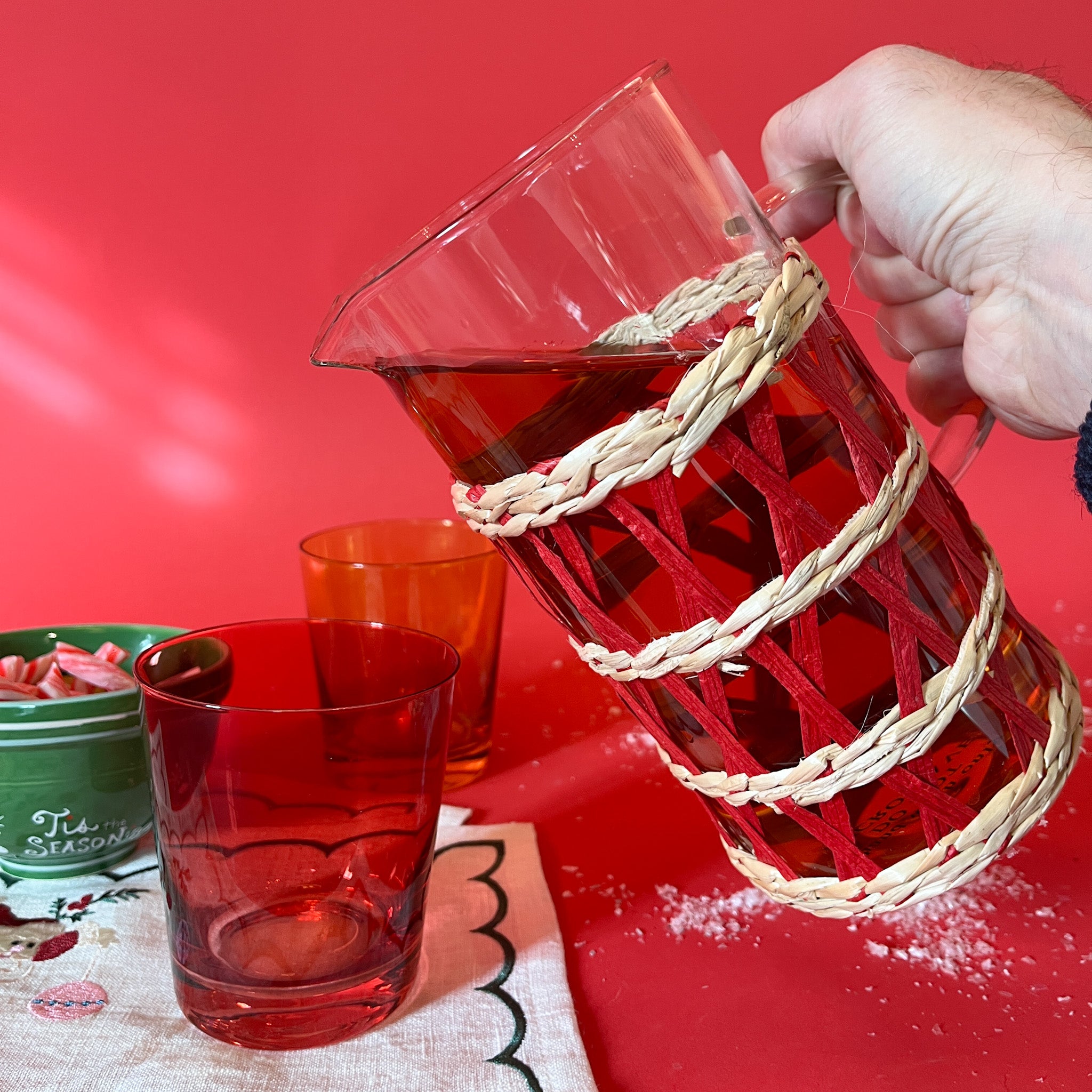 Use this happy-go-lucky 1 3/4-quart glass pitcher with red/natural rattan sleeve to serve a batch of Bloody Marys or, perhaps, to use as a whimsical vase to brighten up the guest bedroom for the in-laws (hello, Cousin Marge and Jerry!).