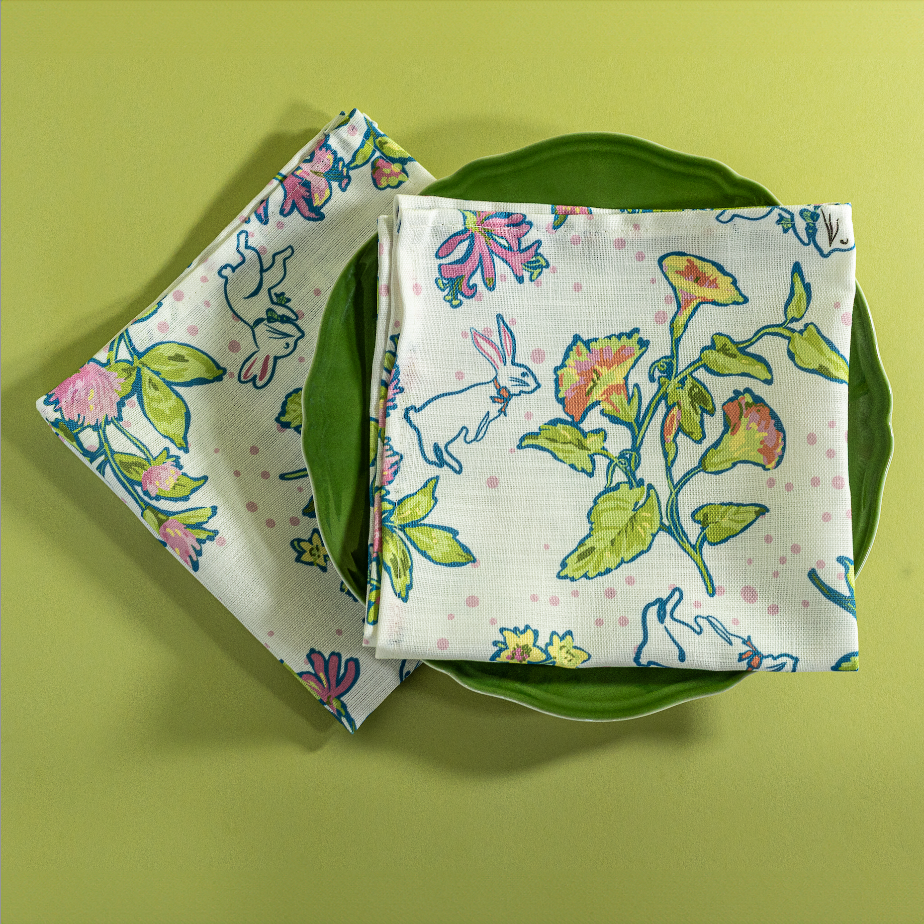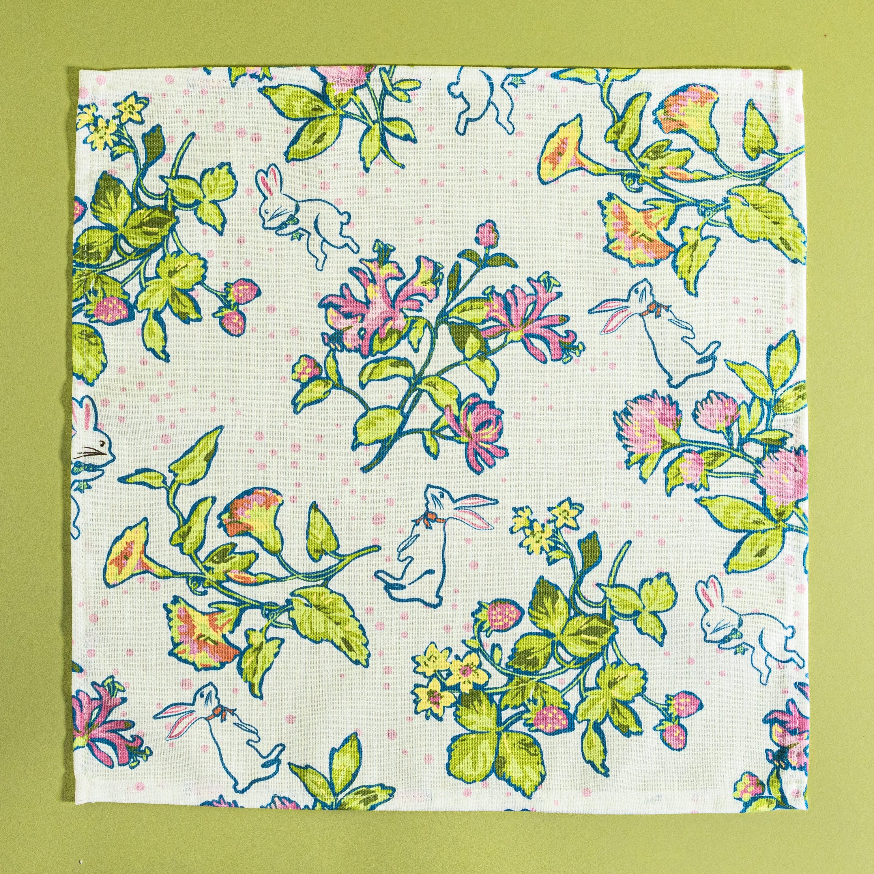 Designed by the Madcap Cottage design team, these wonderful no-iron cloth dinner napkins in a floral, bunny and strawberry print fabric deliver the perfect zing for spring. Strawberry fields forever, indeed! Printed upon a linen-like poly in multicolor.