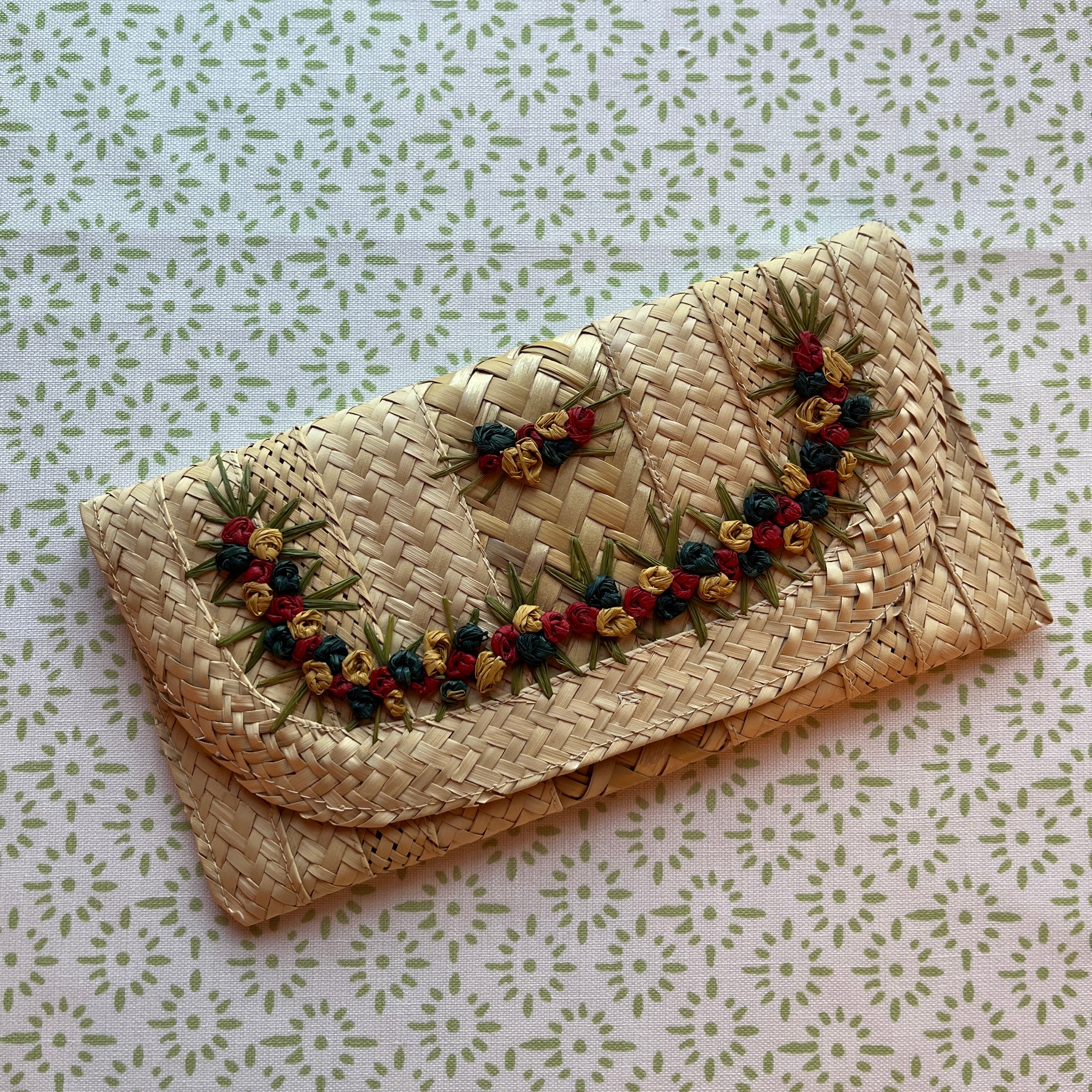 Take a trip to the tropics with this wonderful vintage straw clutch emblazoned with colorful flowers and lined with a jaunty floral pattern. Straw strap to hold the clutch in your hand. Perfect for that night out on the town.
