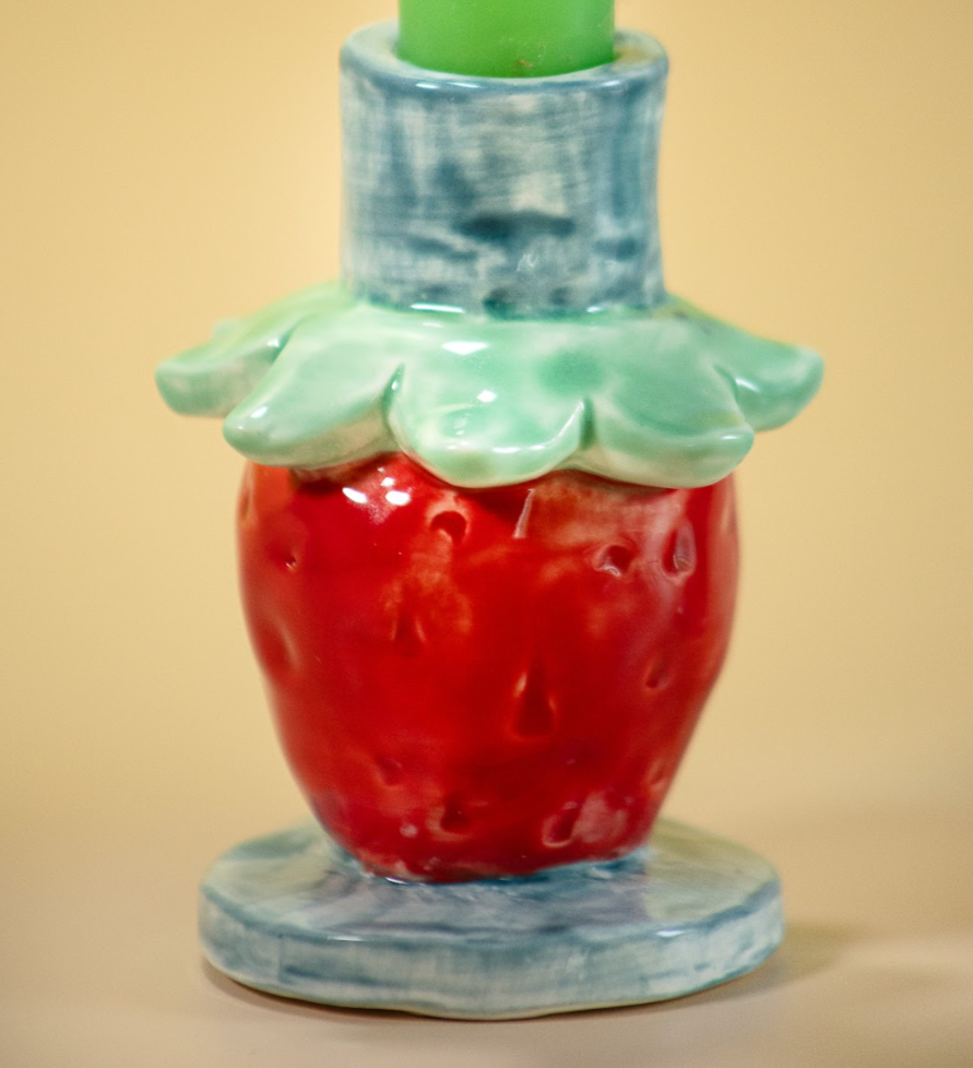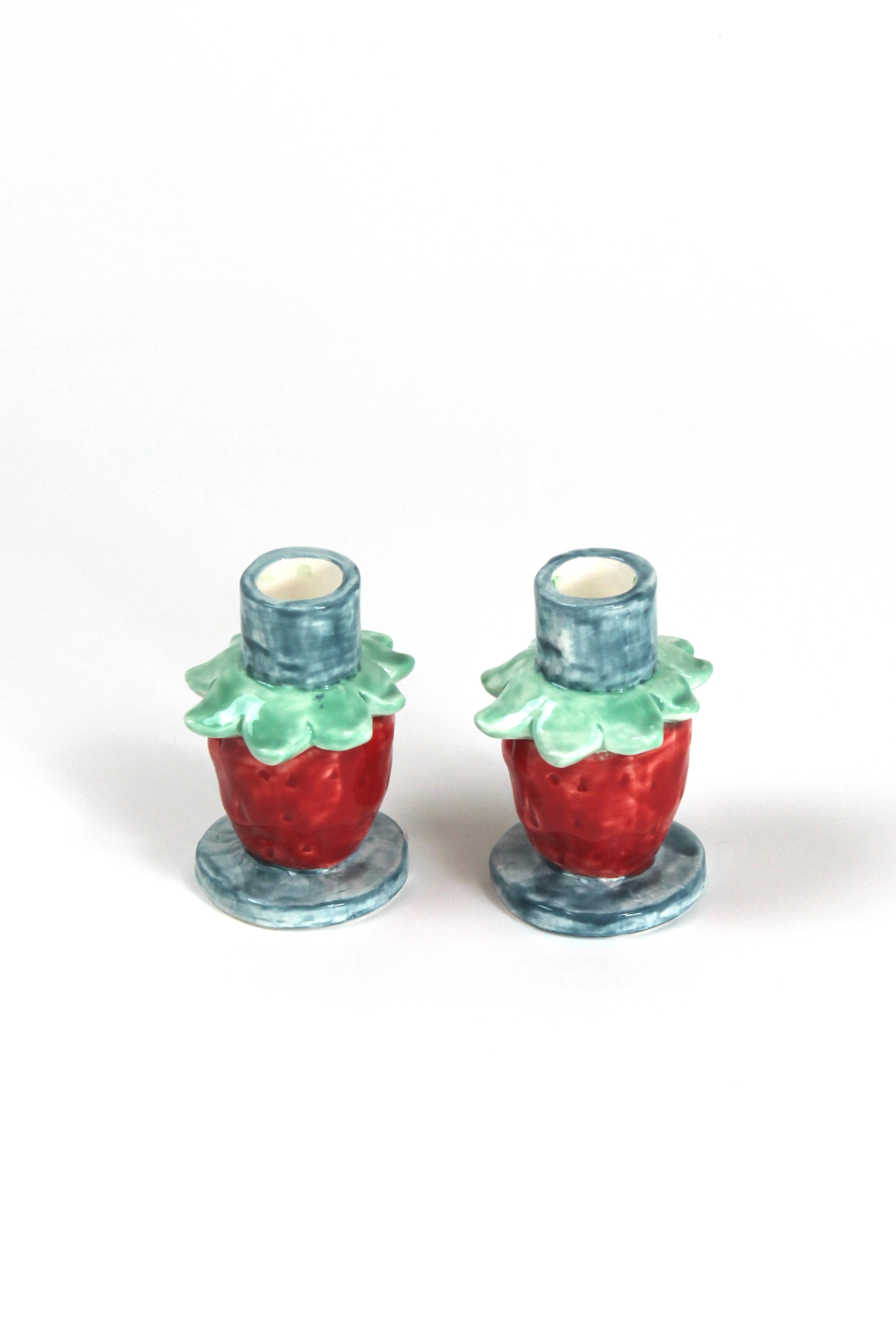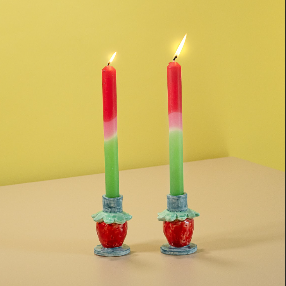 Add some flair to your dining room, hall table, or coffee table with this pair of stunning, bold red ceramic strawberry candle holders, perfect perches for holding your colorful taper candles. We love the leafy flourishes. Set of 2.