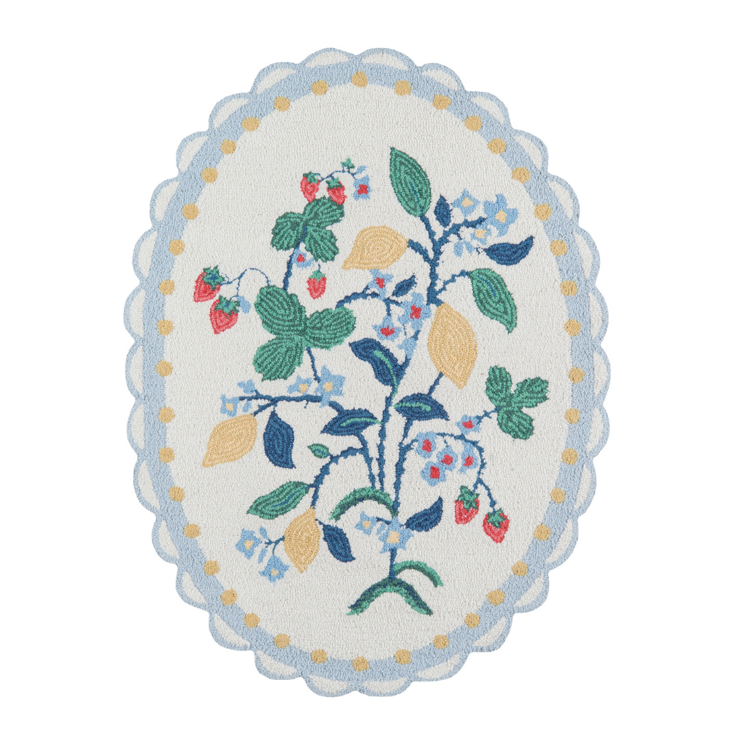 The Madcap Cottage Strawberry Hill white accent rug channels vintage needlepoint pillows with lemons surrounded by flowers and strawberries. Oval with scalloped edges, this strawberry rug makes a wonderful gift. One size: 3’ x 4’. Sized to fit perfectly and add a touch of whimsy inside your front door, in front of your kitchen sink, or next to your bed. Hand-hooked for a homemade appearance.