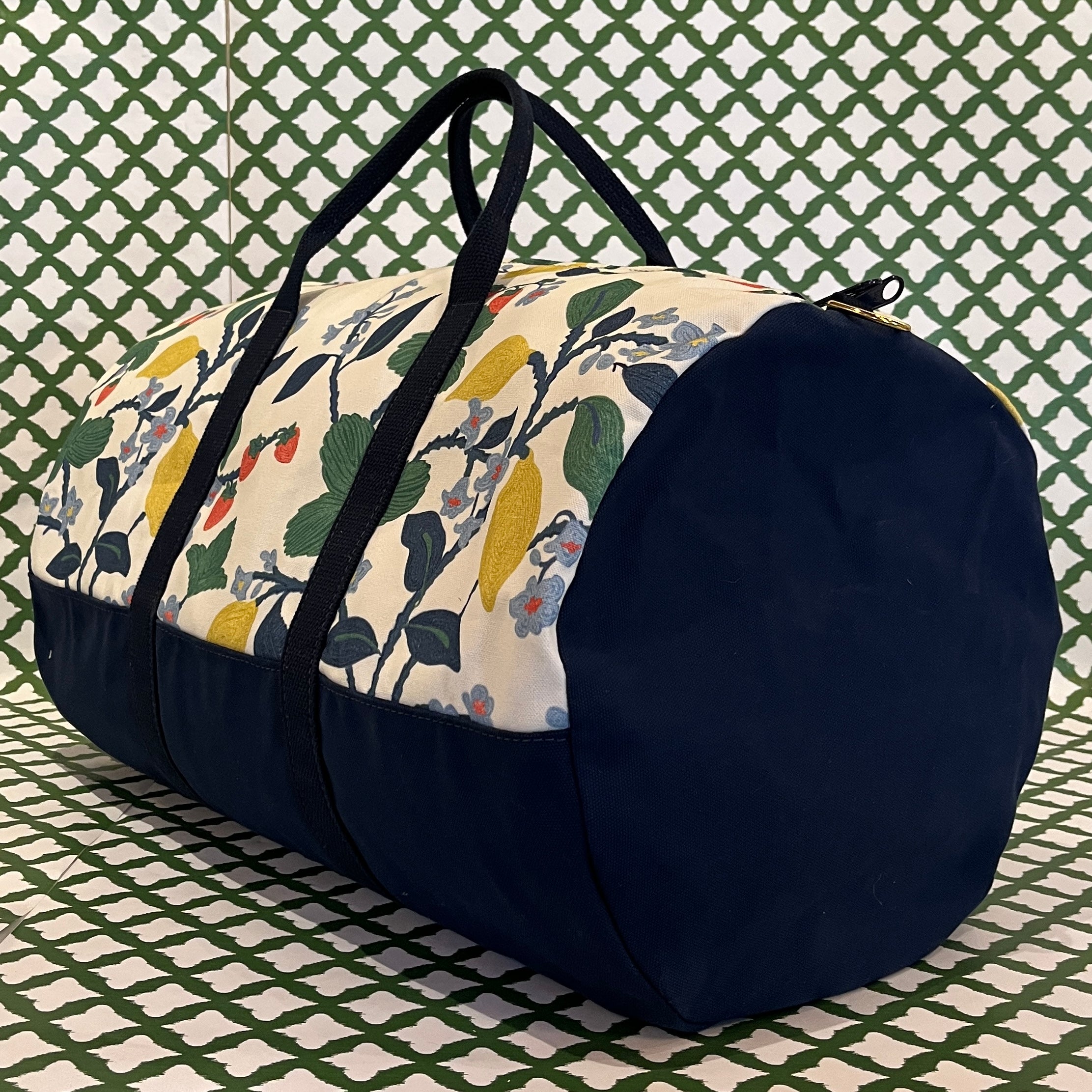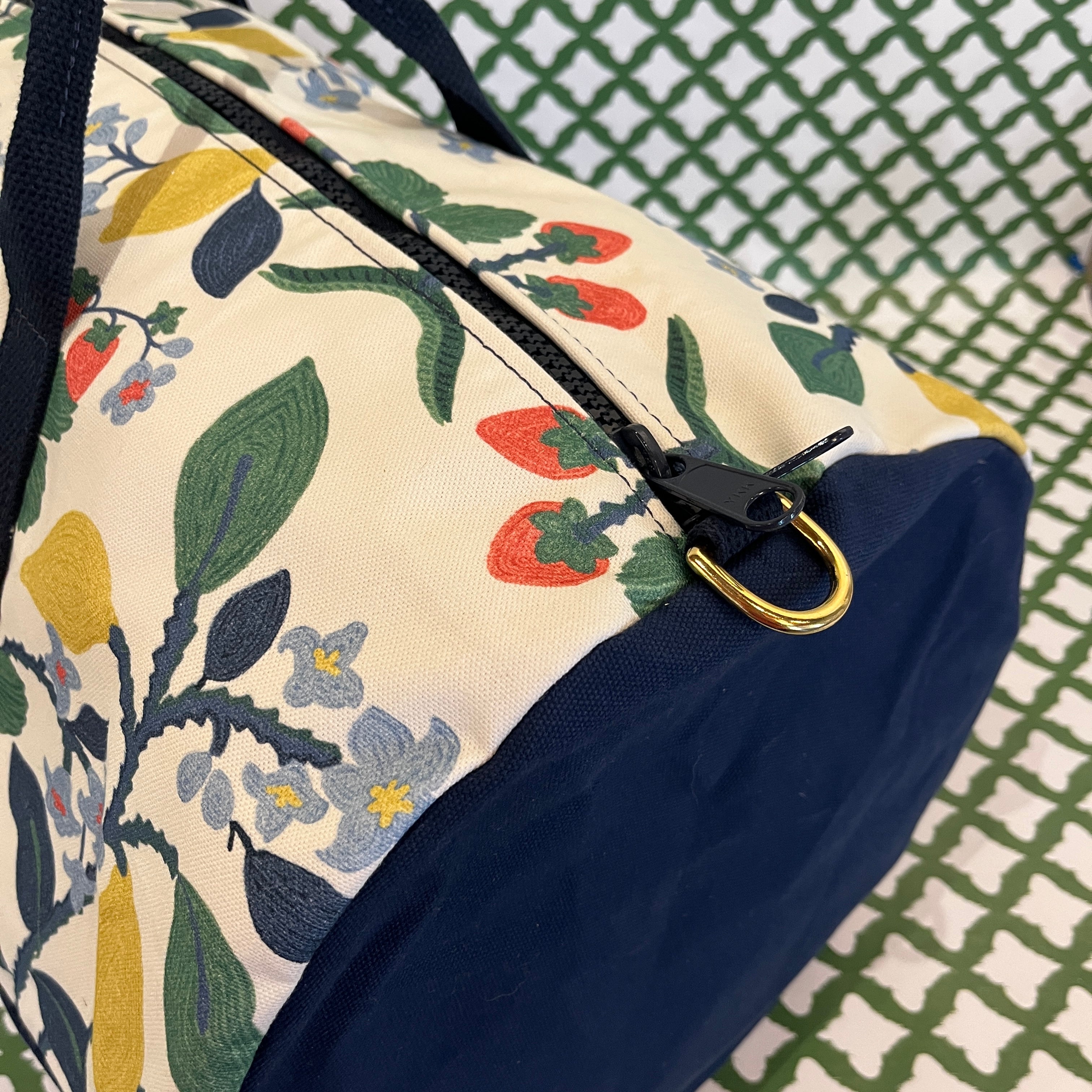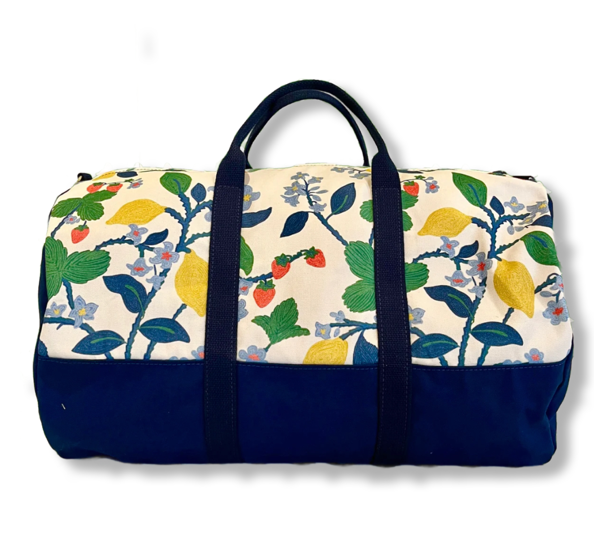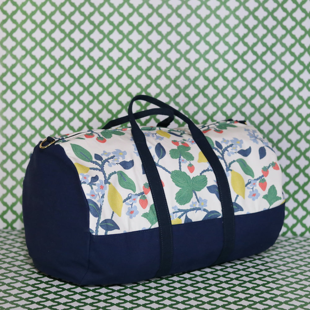 Crafted in North Carolina, this beautifully designed canvas duffle bag in our Strawberry Hill pattern in forest green and navy blue is the perfect weekend bag. A hefty, hardworking zipper, contrast trim, sturdy canvas body, and glorious details.