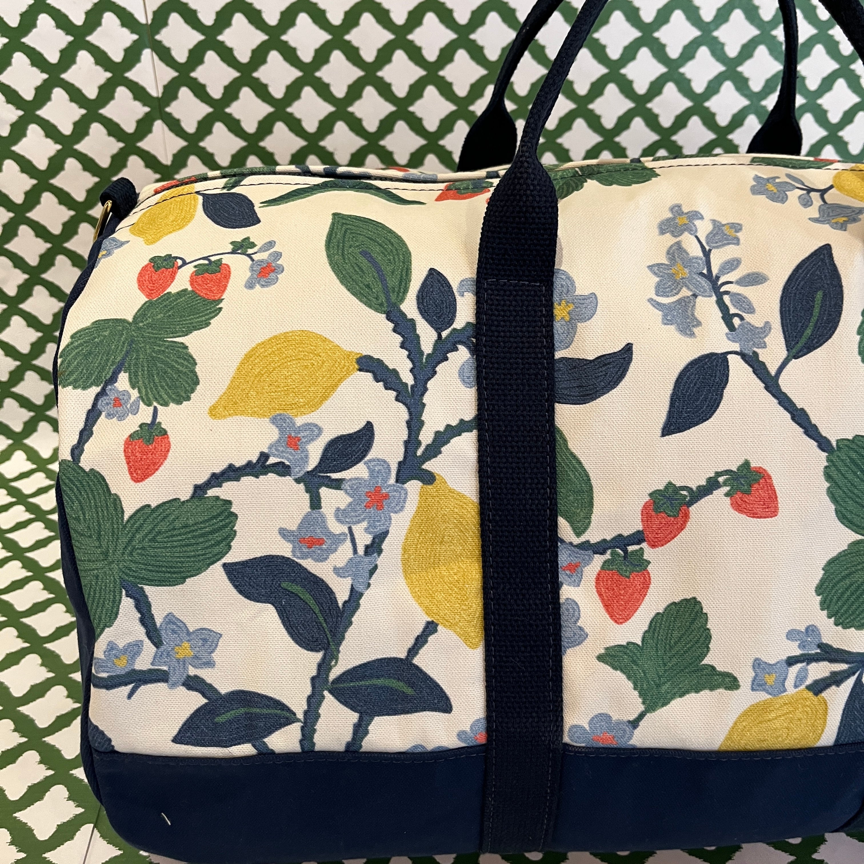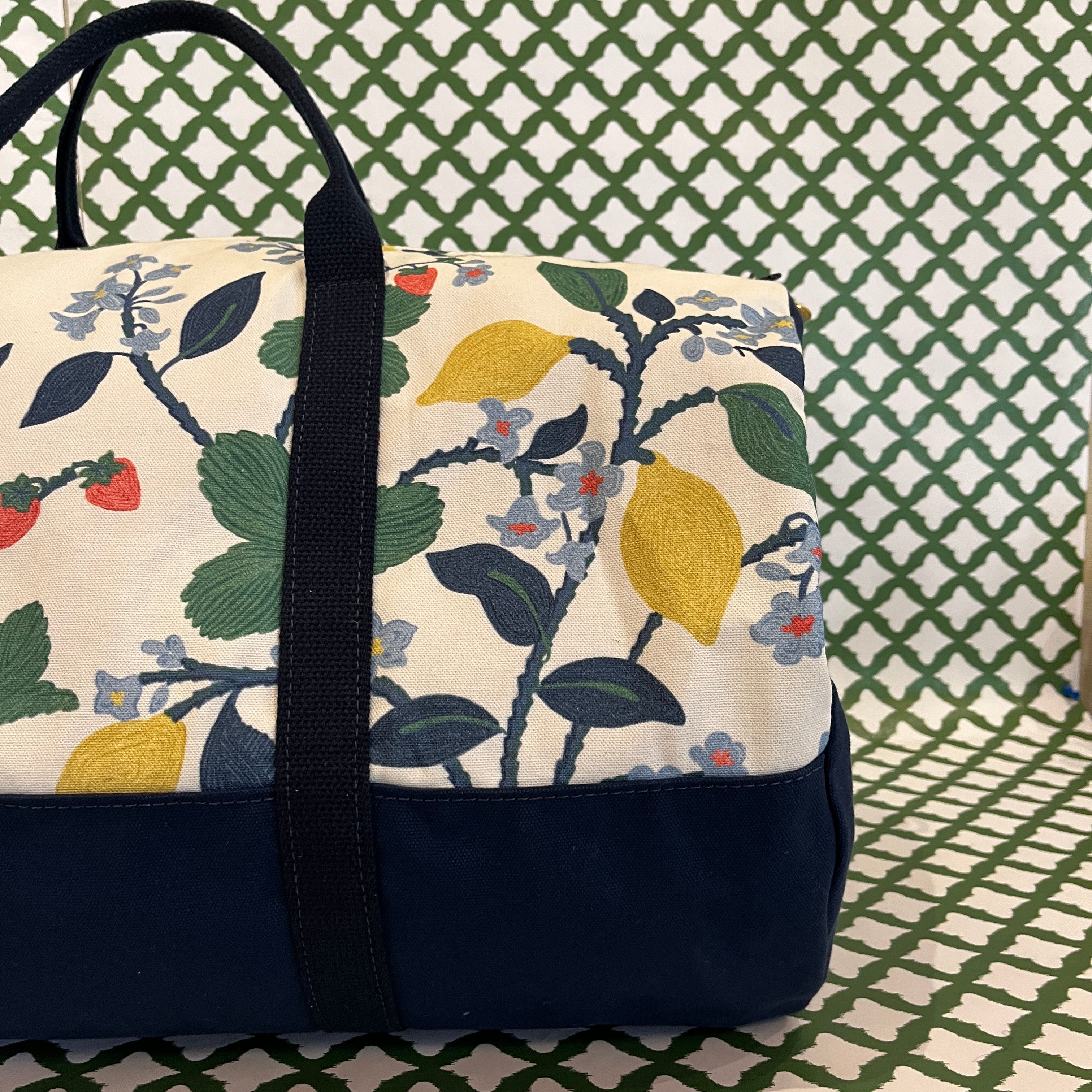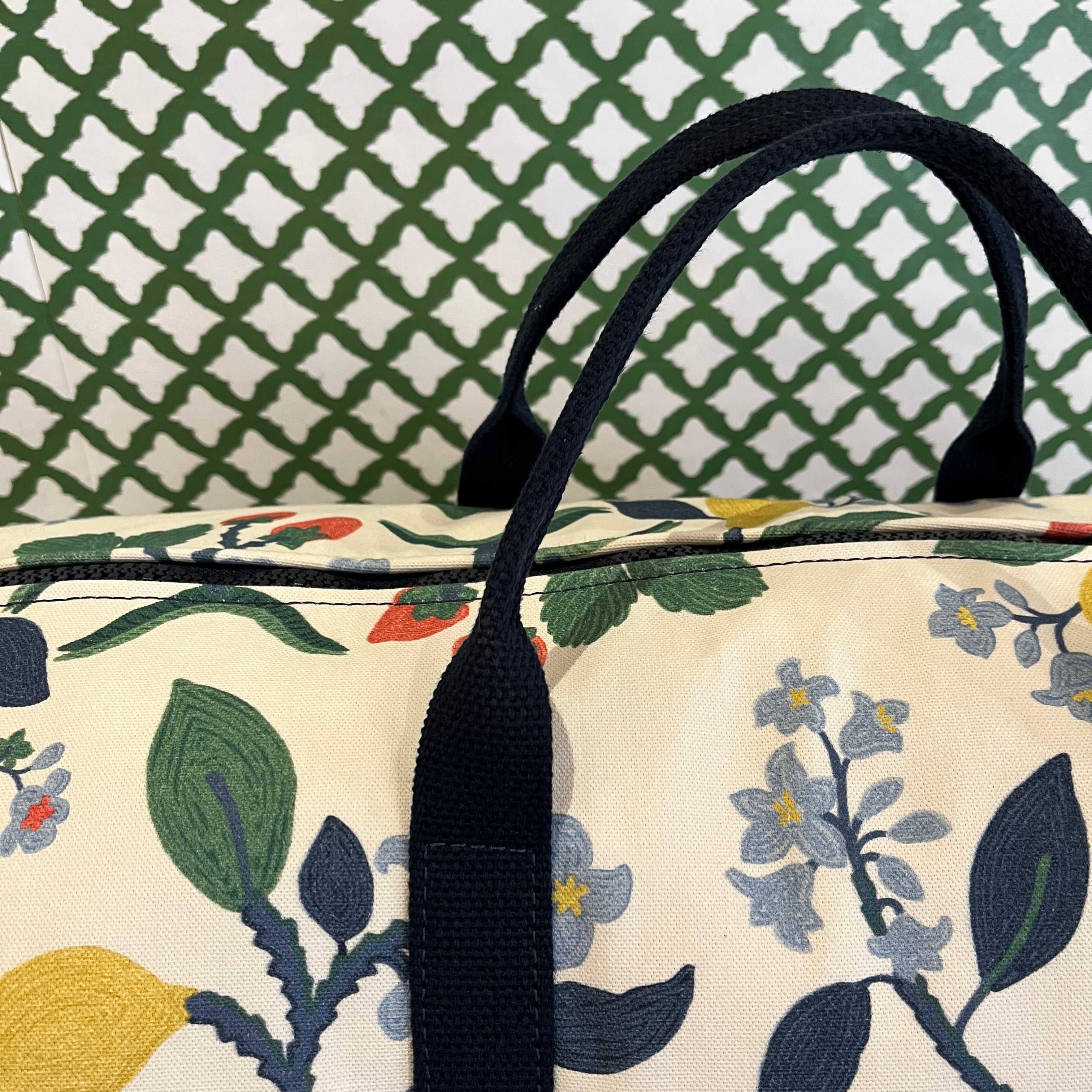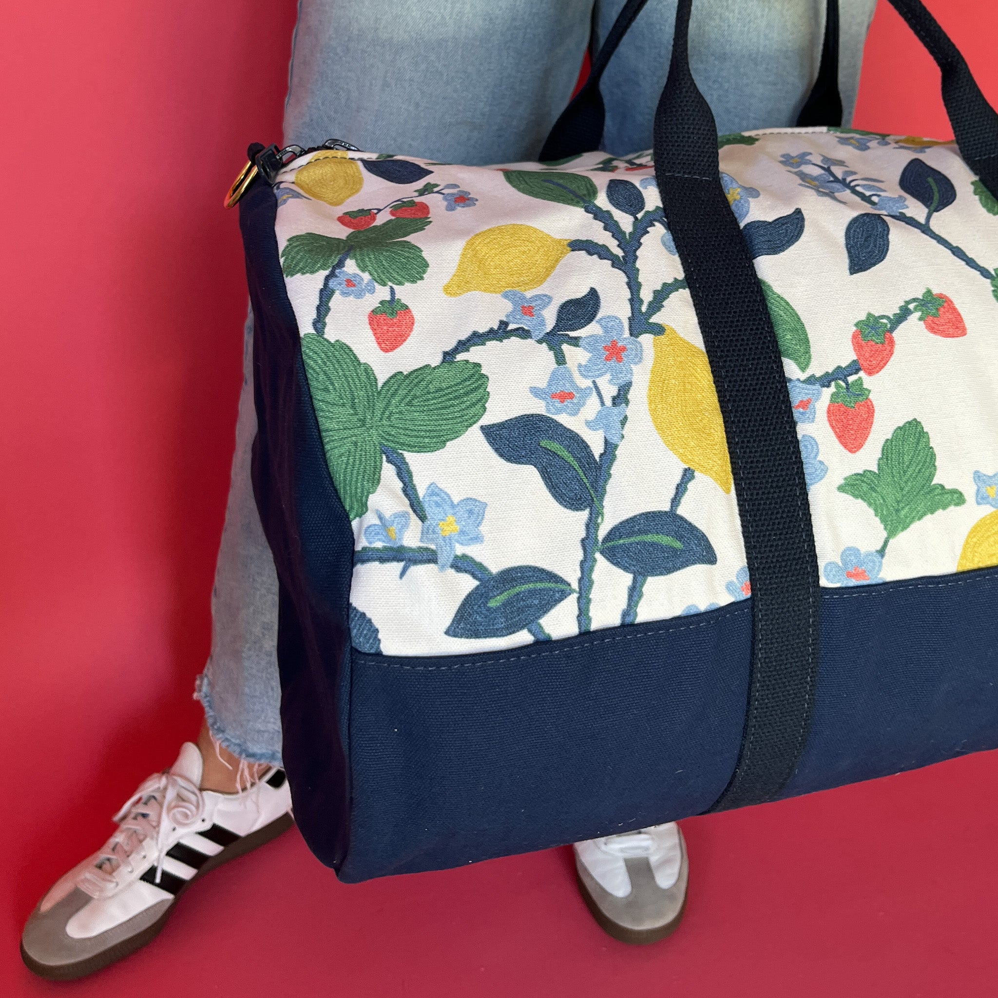 Crafted in North Carolina, this beautifully designed canvas duffle bag in our Strawberry Hill pattern in forest green and navy blue is the perfect weekend bag. A hefty, hardworking zipper, contrast trim, sturdy canvas body, and glorious details.