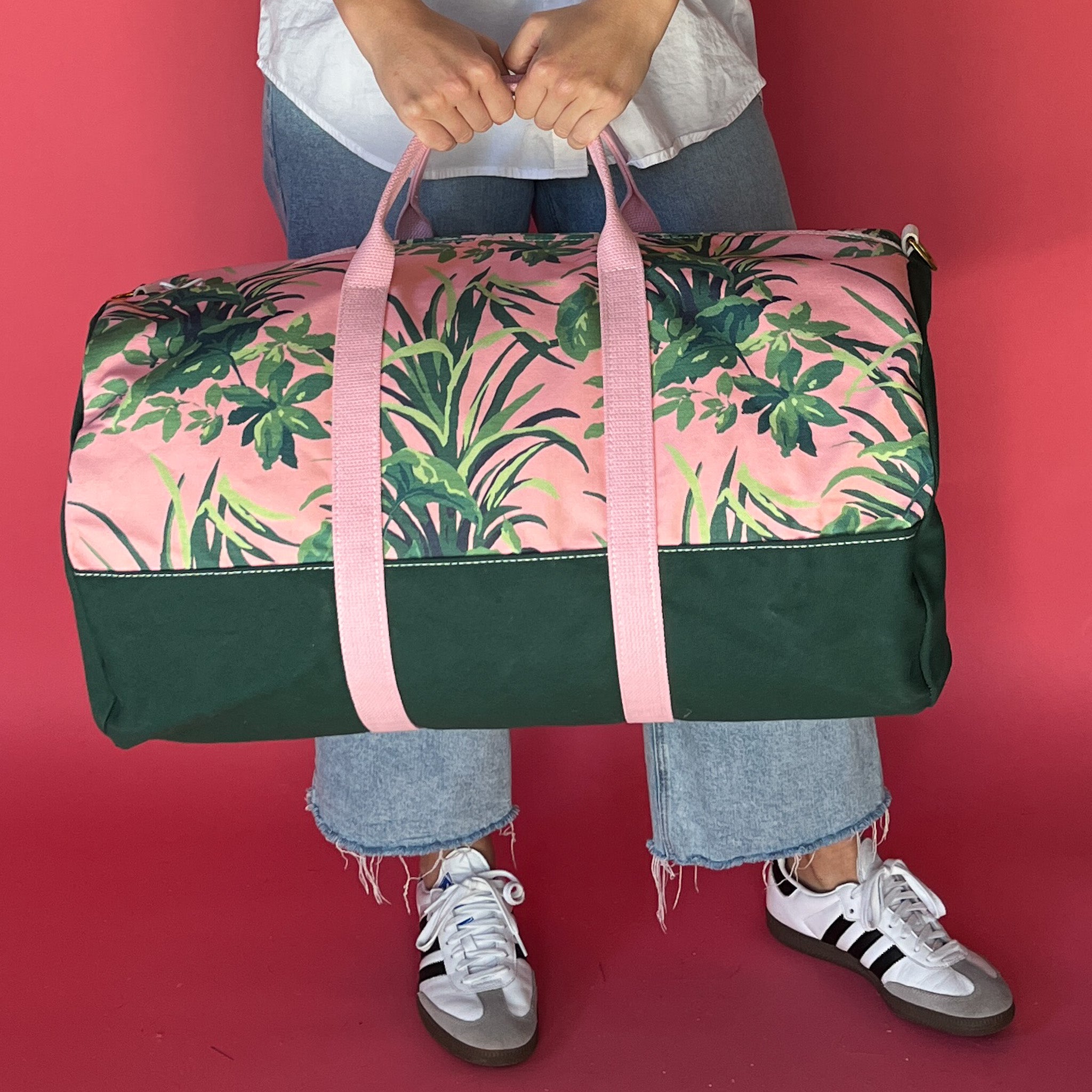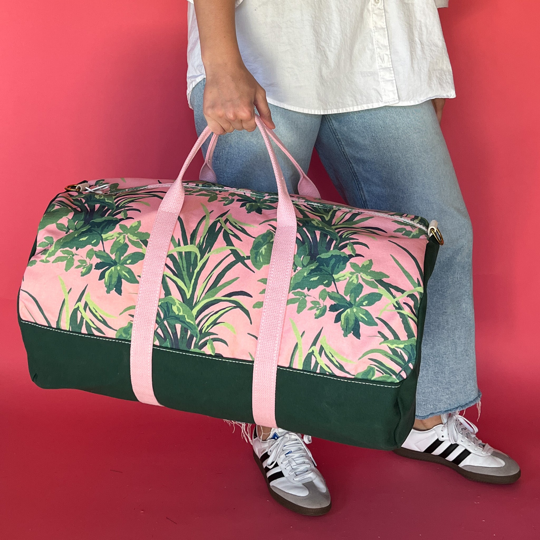 Crafted in North Carolina, this beautifully designed canvas duffel bag in our pink and green Jungle Road pattern is the perfect weekend bag. A hefty, hardworking zipper, contrast trim, sturdy canvas body, rings for attaching a shoulder strap and glorious details.